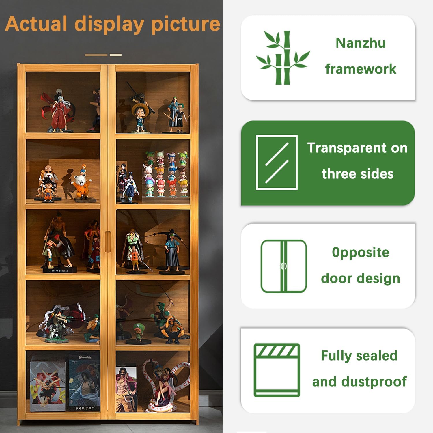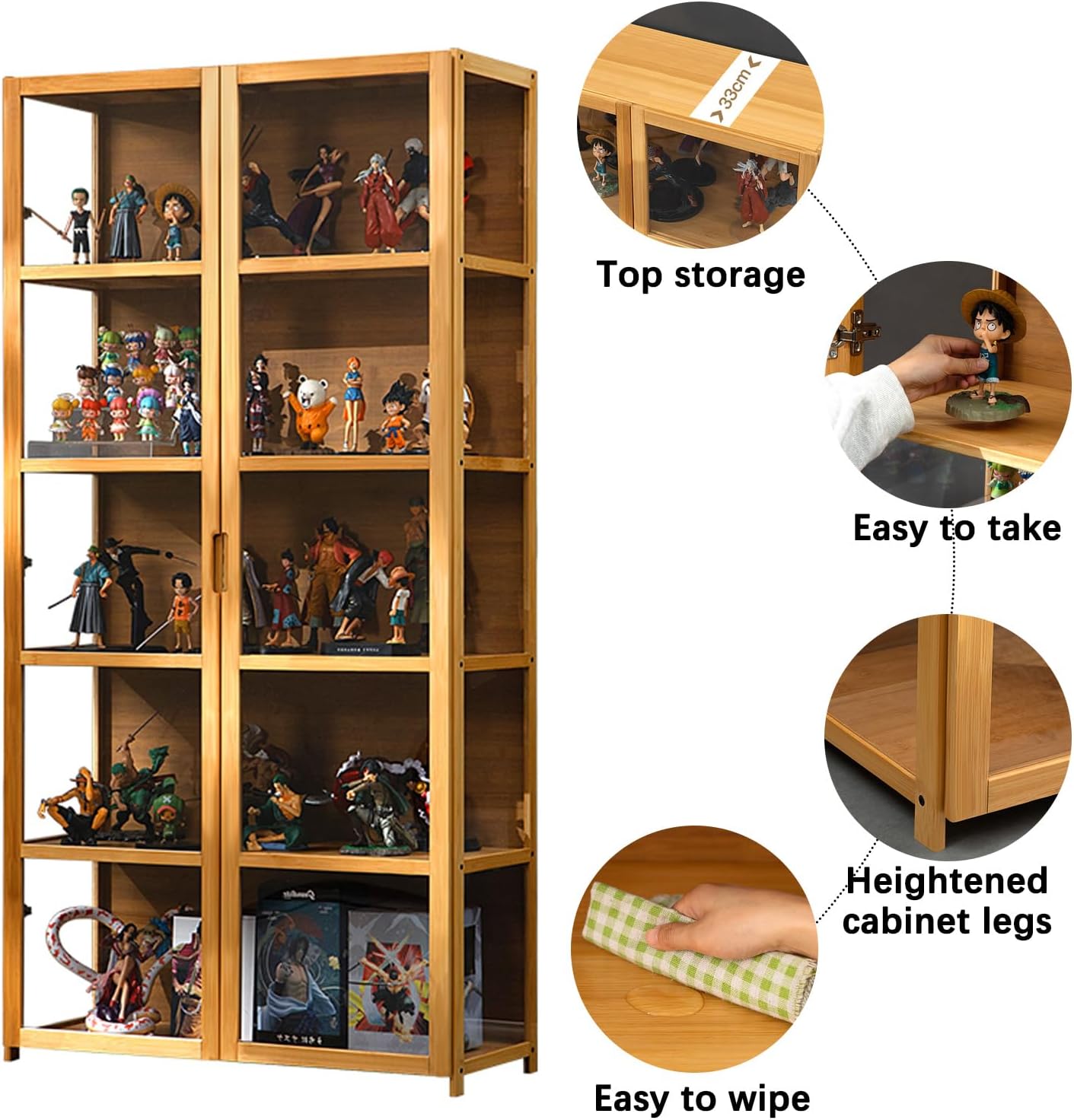 Design dettagliato: la vetrina utilizza un design a doppia porta, facile da aprire e chiudere, facile da riporre, realizzata in materiale acrilico ad alta trasparenza su tre lati, gli oggetti esposti sono chiaramente visibili, a prova di polvere e non saranno ostruiti, rendendo il tuo ambiente domestico più piacevole alla vista. Materiali di alta qualità: la struttura della vetrina è realizzata in bambù naturale. Il bambù si caratterizza per la sua robustezza, elevata capacità di carico e durata. È il materiale ideale per realizzare mobili. La porta e i pannelli laterali sono realizzati in acrilico ad alta trasparenza, garantendo una visibilità ottimale degli oggetti esposti. Molteplici usi: questa vetrina può essere utilizzata anche come mobile decorativo, mensola, pratico mobile portaoggetti per uffici, soggiorni, bagni, cucine e camere da letto, aiutando a organizzare i tuoi oggetti e a risparmiare spazio. Dettagli di miglioramento: Vetrina. La spaziatura tra ogni livello è di 30 cm, il che consente di visualizzare la maggior parte delle figure. I pannelli in laminato sono spessi, robusti e durevoli. Puoi posizionare lì le tue figurine in tutta tranquillità. La profondità è di 33 cm o più. Lo stoccaggio non sarà un problema. Facili da montare: le nostre vetrine si installano in un batter d'occhio e sono pronte all'uso. Anche i bambini possono montarli velocemente. Forniamo foto e video di installazione per assisterti. Non esitate a contattarci se avete domande durante il montaggio.