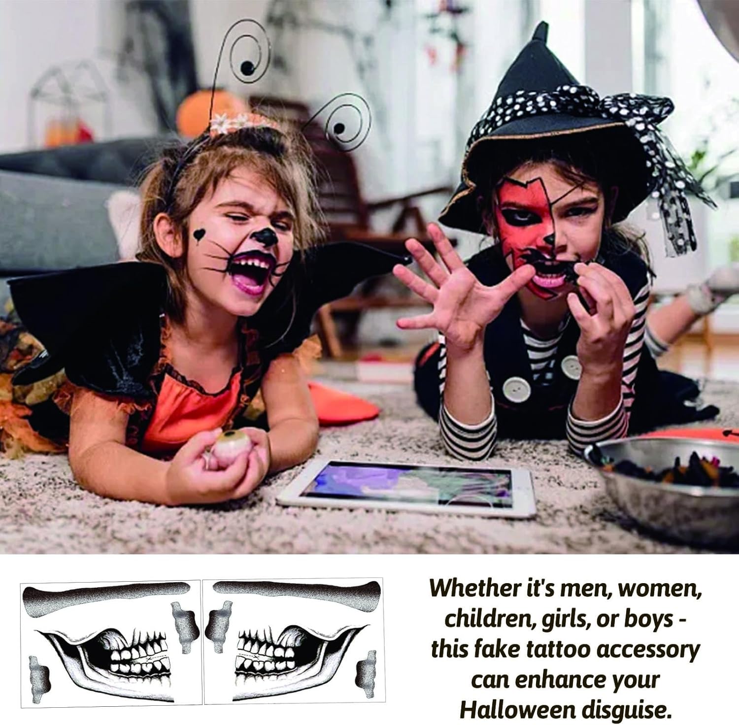 DESIGN: tatuaggio di Halloween disegnato a mano e disegni creativi di artisti internazionali per look unici con tatuaggi di Halloween UNIVERSALE: tatuaggio facciale di Halloween perfetto per uomini, donne, bambini, ragazze o ragazzi, ideale come accessorio tatuaggio finto per qualsiasi costume di Halloween SEMPLICE: tatuaggio temporaneo di Halloween facile e veloce da applicare per un costume perfetto in soli 5 minuti ALTA QUALITÀ: ottima tenuta del tatuaggio facciale di Halloween sulla pelle (braccio, viso, collo) grazie alla tecnica di stampa professionale DELICATO SULLA PELLE: il tatuaggio per la bocca di Halloween è certificato FDA, delicato sulla pelle e atossico, combinabile anche con il trucco