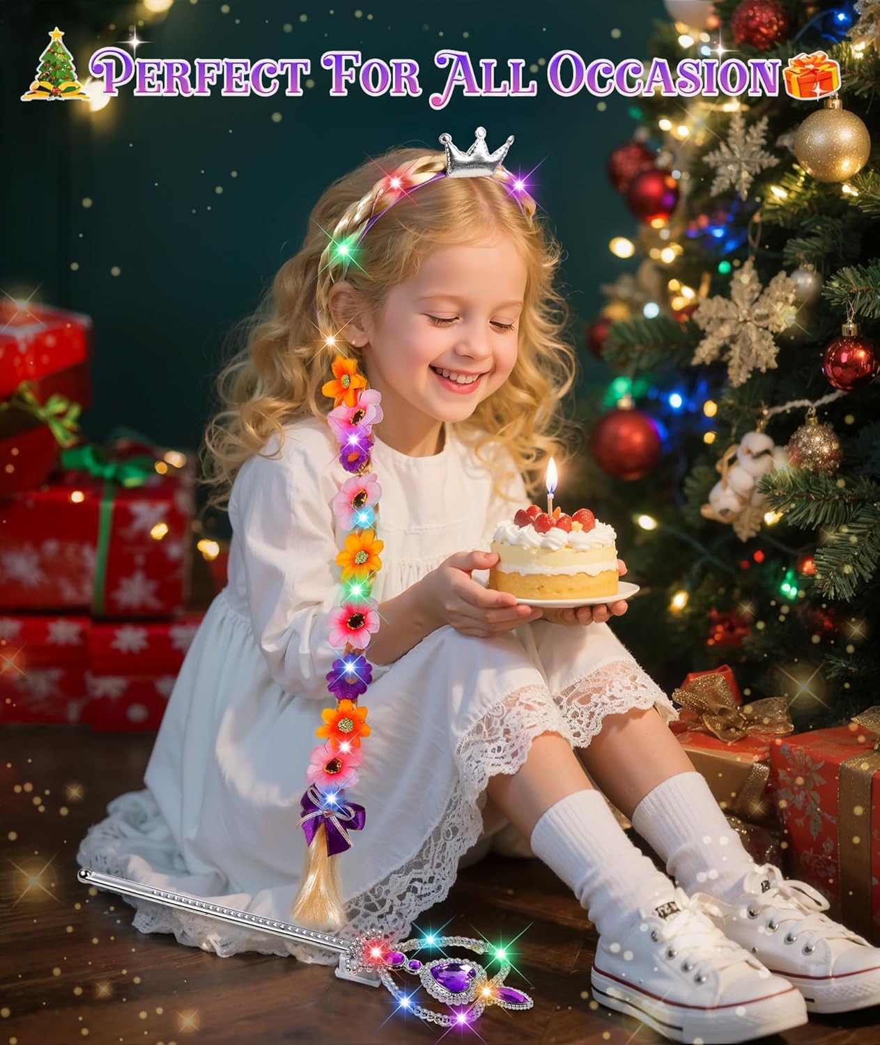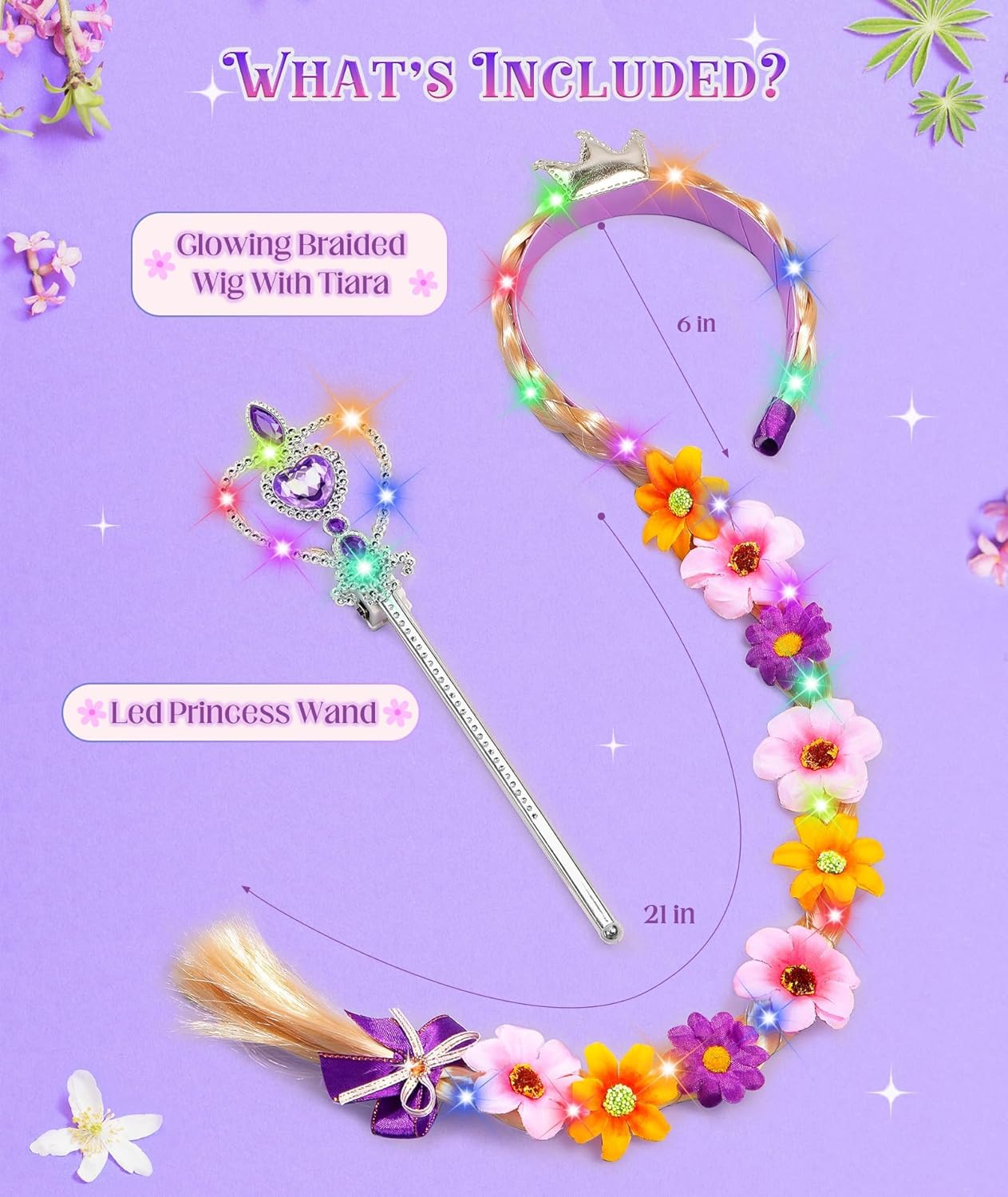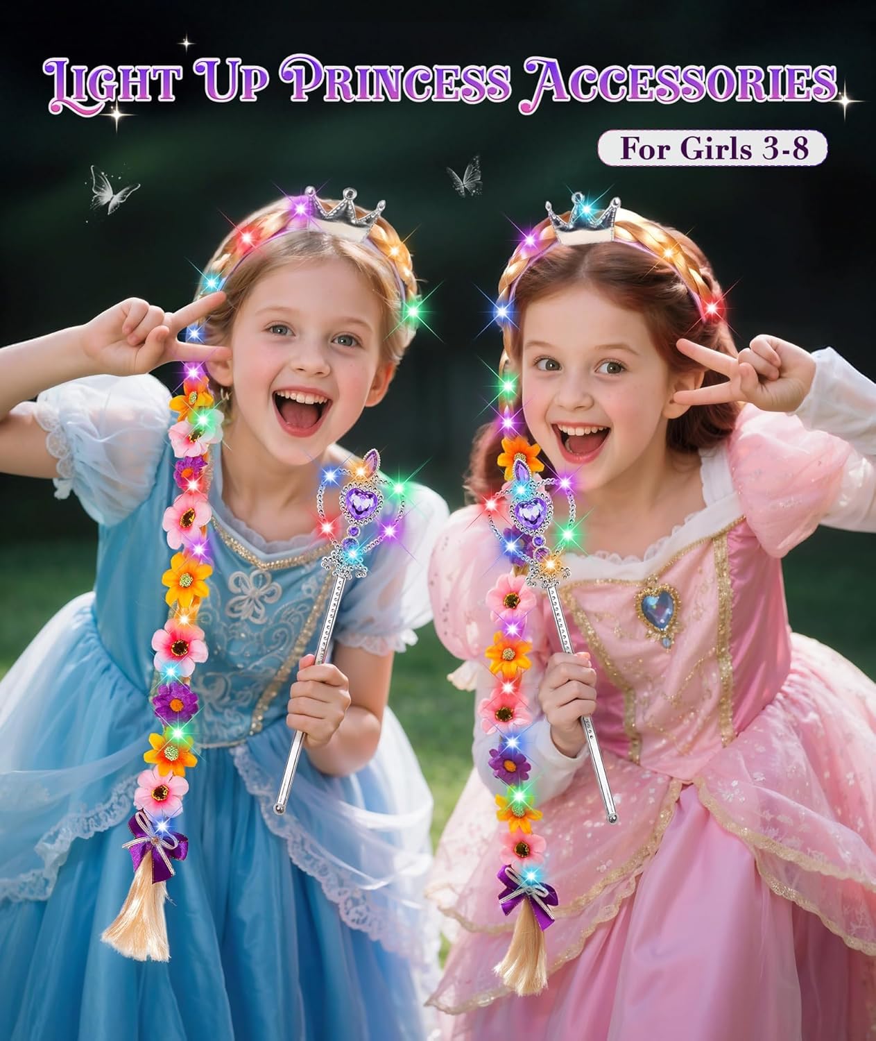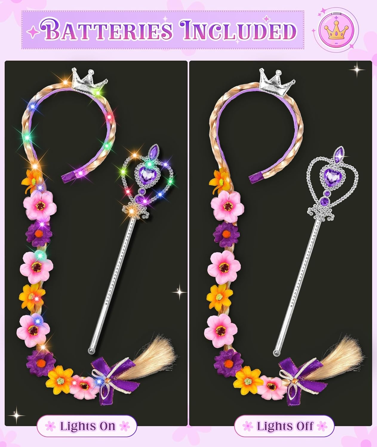 【Accessori Principessa Bambine】Questo set include 1 fascia per capelli con treccia da principessa a LED e una bacchetta magica da principessa a LED. Crea facilmente uno splendido look da favola che renderà ogni piccola principessa il centro dell'attenzione. 【Design Raffinato】La fascia per capelli con treccia lunga dorata è abbinata a una deliziosa corona, la treccia è decorata con fiori colorati e l'estremità della treccia è ornata da un grazioso fiocco. La forma complessiva è squisita e affascinante, creando un look elegante e sognante. 【LED colorati】Le trecce e la bacchetta magica da principessa si illuminano con luci colorate e hanno tre modalità: lampeggiante, lampeggiante lento e fisso, che possono essere commutate liberamente. Questo dona alla tua bambina un aspetto vibrante e radioso che catturerà l'attenzione di tutti. 【Alta Qualità】Le trecce da principessa sono realizzate in fibra sintetica di alta qualità, che le rende morbide, lisce, leggere e comode da indossare senza risultare pesanti. La bacchetta è realizzata in materiale ABS ecologico ed è decorata con strass scintillanti per garantire stabilità e proprietà antiscivolo. 【Divertente e interattivo】Gli accessori da principessa per bambine sono perfetti per Halloween, Natale, carnevale, giochi di ruolo, feste di compleanno, servizi fotografici e altre occasioni. Aggiungono divertimento e ricordi a qualsiasi costume e regalano la meravigliosa esperienza di essere una principessa delle fiabe.
