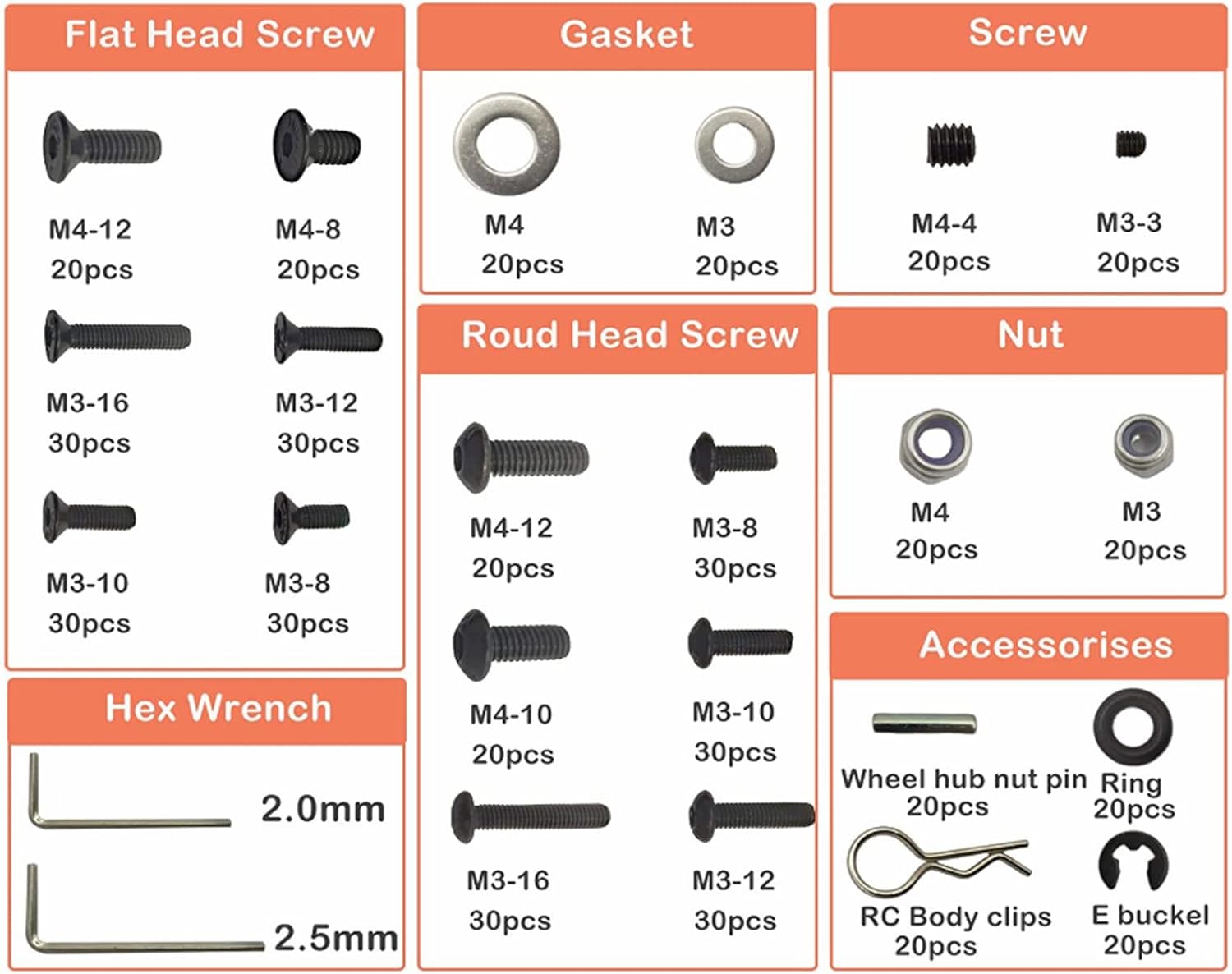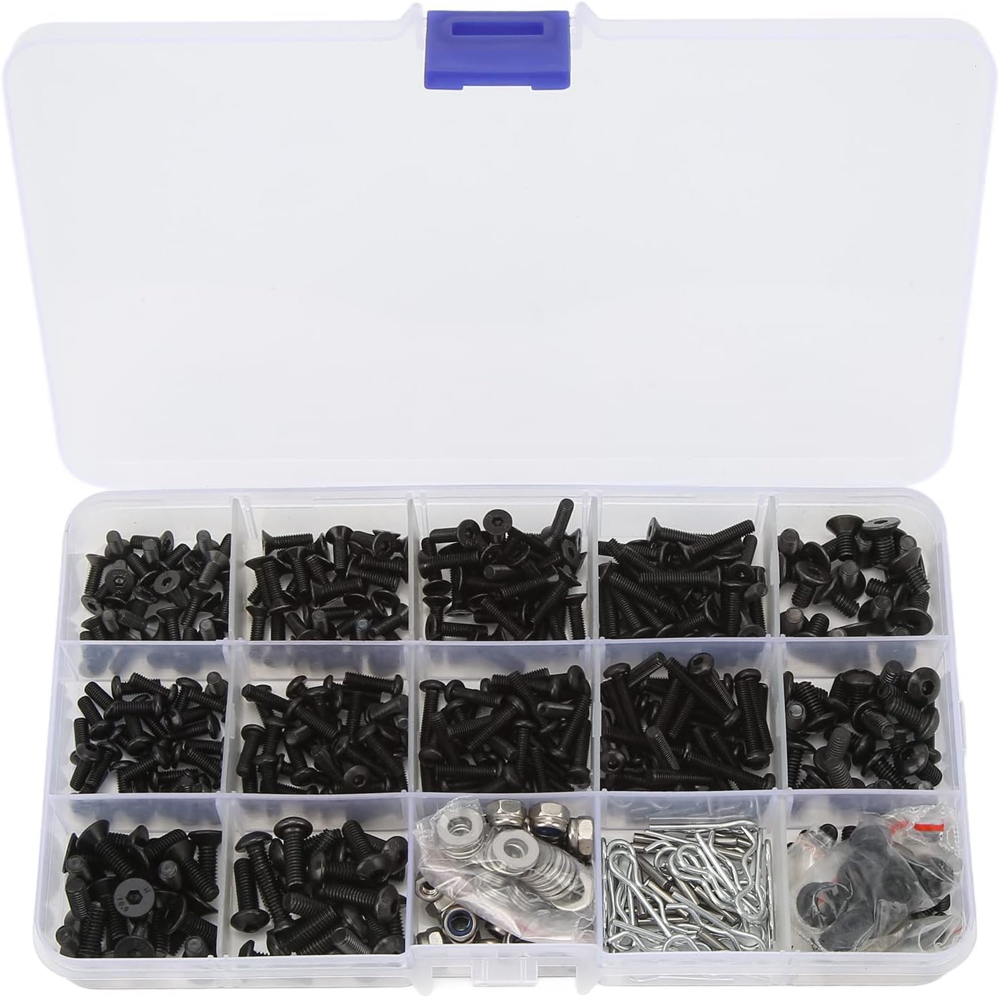 Costruzione durevole in acciaio inossidabile: realizzato in acciaio inossidabile di alta qualità, questo set di viti RC non è solo durevole e resistente alla ruggine, ma anche leggero e portatile per un comodo utilizzo durante riparazioni o aggiornamenti. Varietà confezionata singolarmente: ogni tipo di vite nel kit è confezionato singolarmente per impedire la miscelazione e garantire un facile accesso. Ospitate in una scatola trasparente con scomparti organizzati, queste viti sono pronte per l'uso in movimento. Prestazioni di fissaggio affidabili: dotate di filettature trasparenti per un fissaggio preciso, queste viti offrono un'eccellente resistenza alla torsione e alla compressione. Migliora l'aspetto della tua auto RC sostituendo direttamente le viti vecchie o danneggiate con questo elegante set. Ampia gamma di dimensioni: con 24 diverse opzioni incluse nel kit viti per auto RC, che vanno da dadi e guarnizioni a varie dimensioni di viti a testa tonda e piatta, avrai tutto l'assortimento di hardware necessario per riparazioni complete. Applicabilità: compatibile con Traxxas, compatibile con Tamiya, compatibile con Axial, compatibile con Redcat, compatibile con HSP, compatibile con HPI, compatibile con SCX10, compatibile con auto RC Losi 1/8 1/10