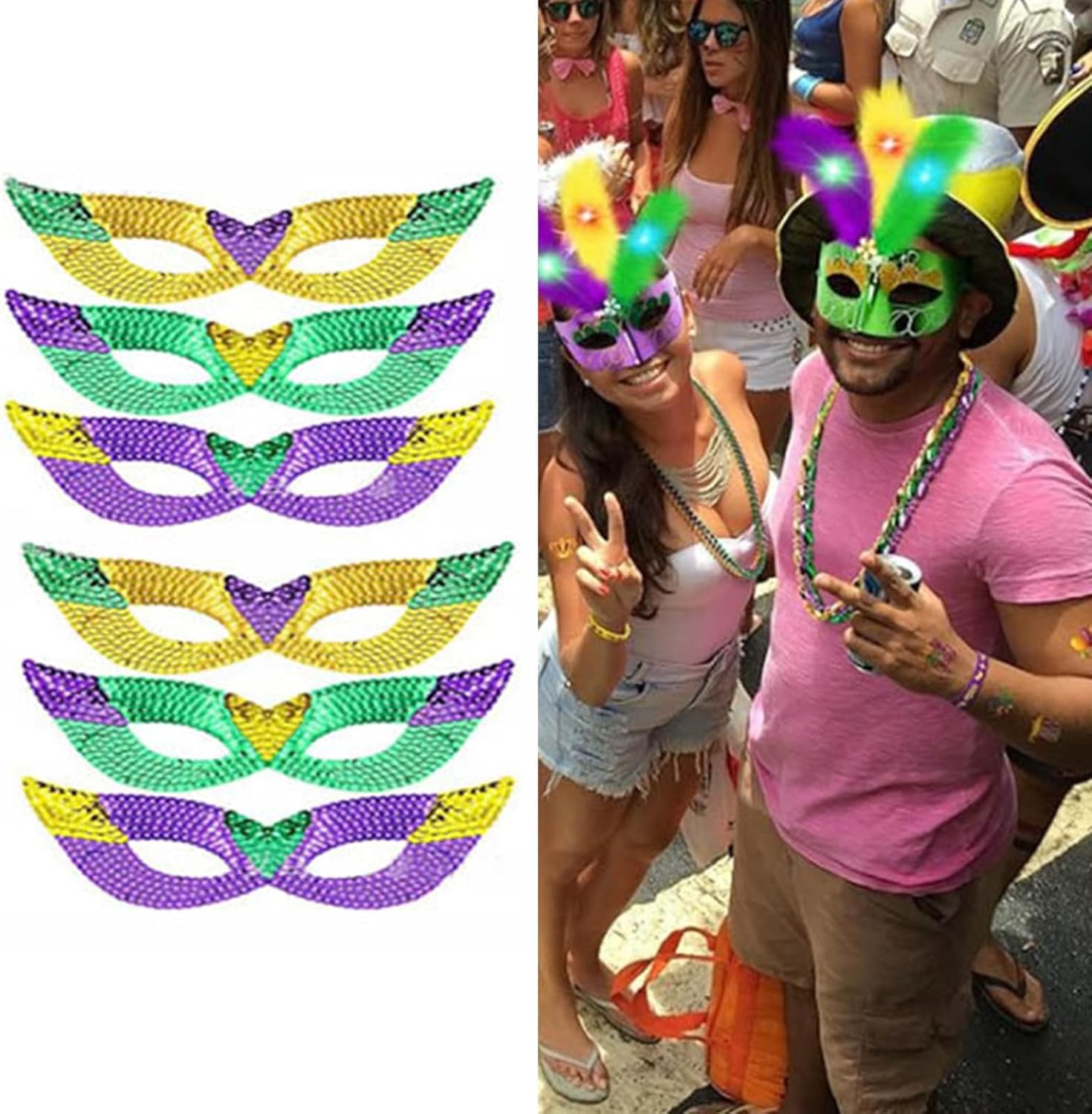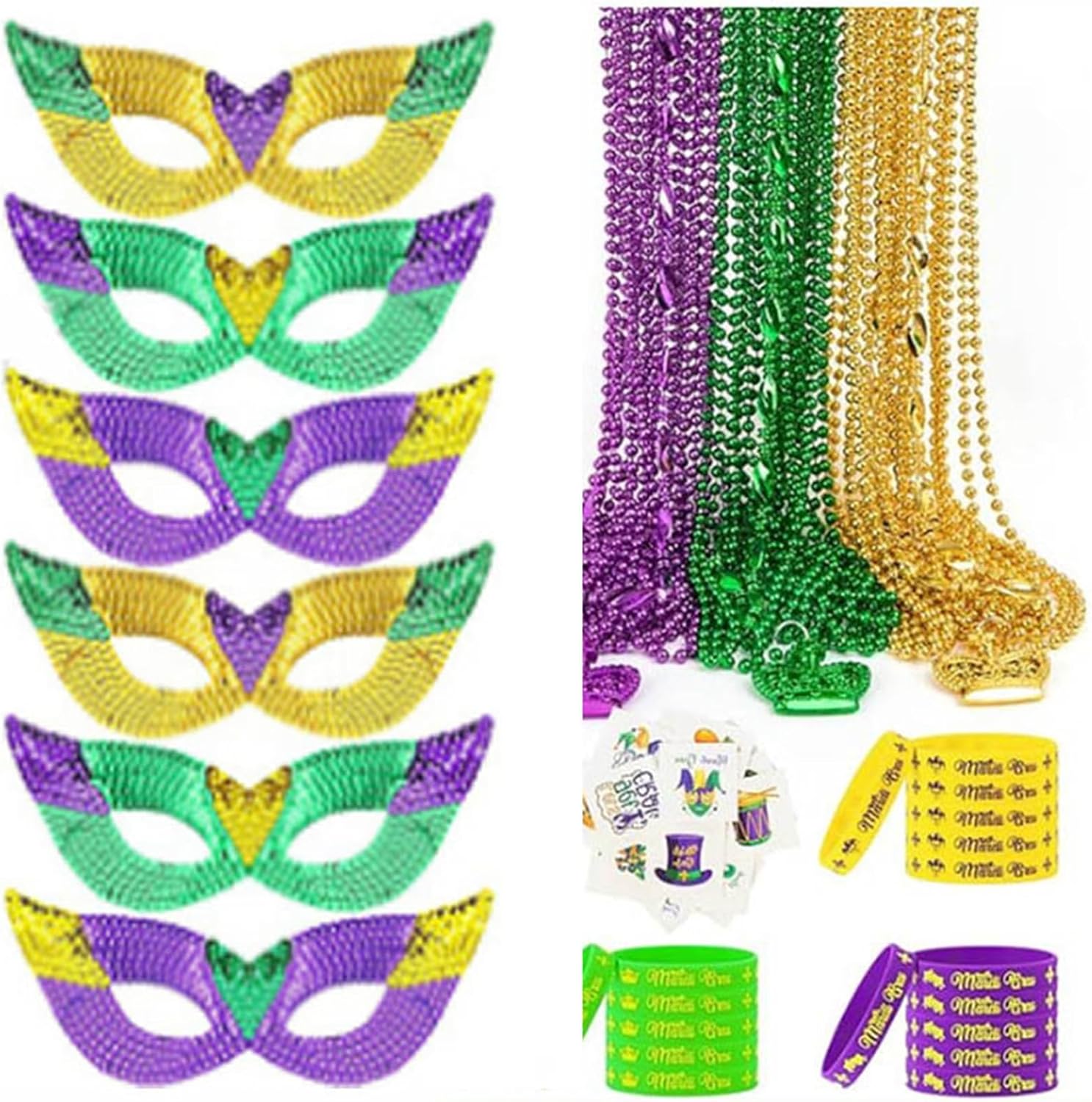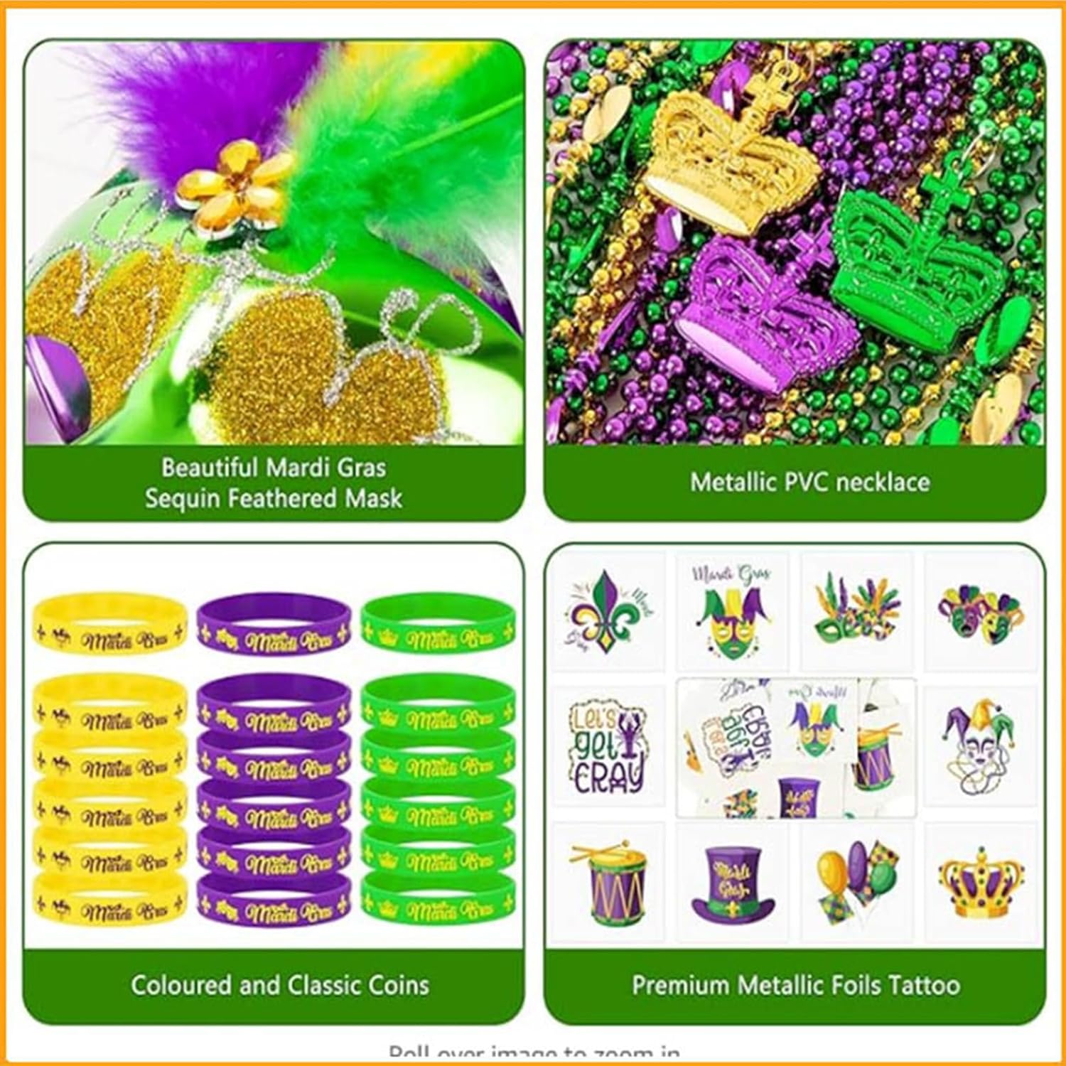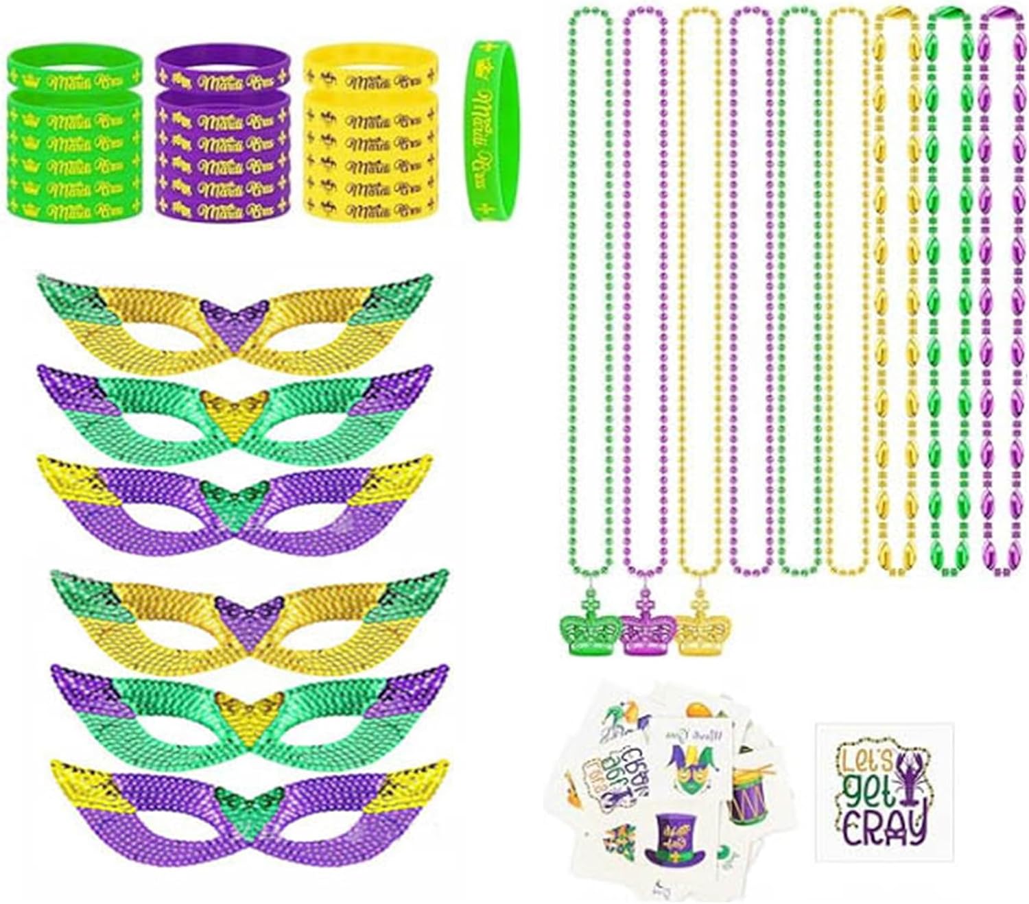 distingue alla festa con questo set costumi del Mardi Gras, con paillettes eyemask, adesivo per corpo, braccialetto e collana lunga. Perfetto per aggiungere divertimento e vivacità a qualsiasi festa Halloween o a tema Progettato per uomini e donne, questo set costumi del Mardi Gras è adatto a chiunque abbia frequentato celebrazioni del Mardi Gras, feste, balli e occasioni sociali Che tratti celebrazione del Mardi Gras, festa a tema, un evento nightclub o palla mascherata, questo set costumi ti renderà centro attenzione e creerà un'atmosfera festa indimenticabile Cerchi un regalo unico? Questo set costumi del Mardi Gras è scelta perfetta per amici, familiari o persino te stesso Realizzato in materiale plastico, questo set costumi è leggero, morbido e traspirante, garantendo un'esperienza usura comoda. La collana per tallone consente vestibilità perfetta, mentre i disegni paillettes frizzanti aggiungono un tocco affascinante