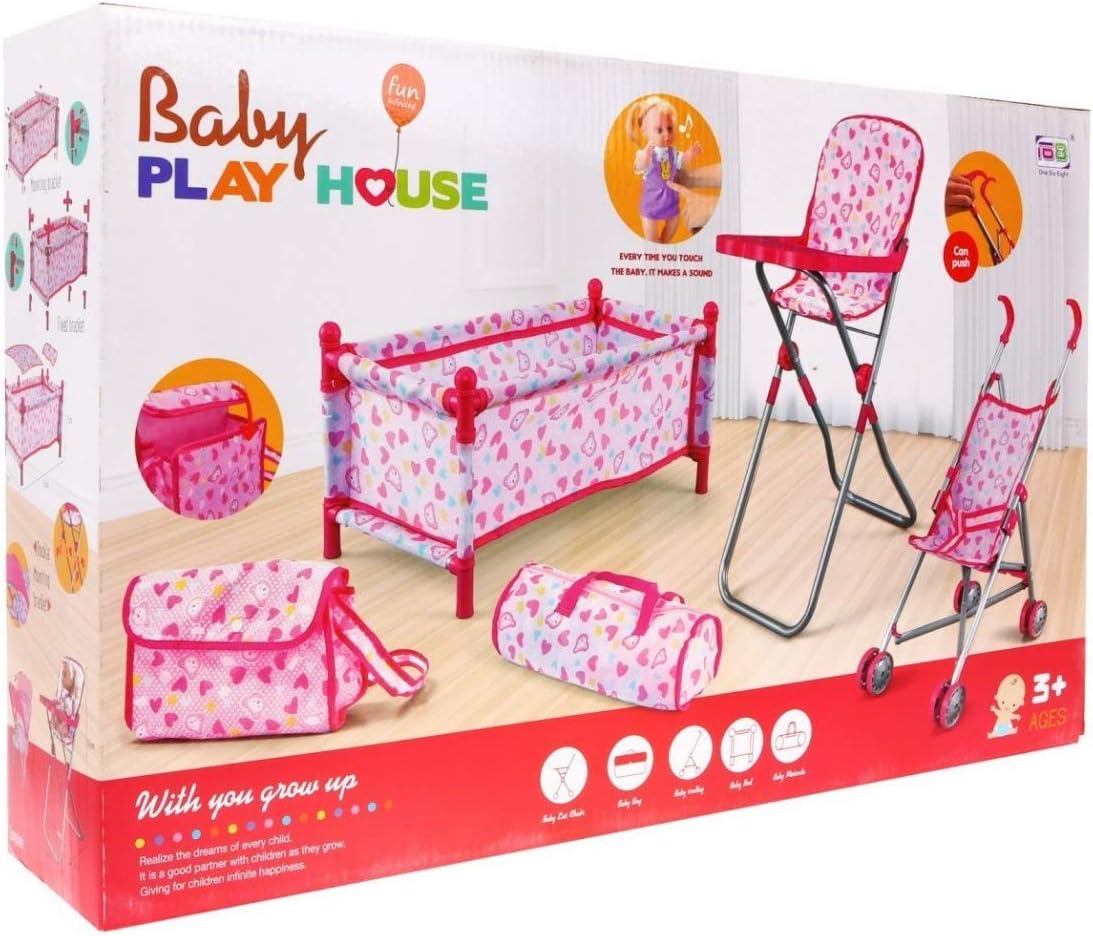 Il set piacerà sicuramente a ogni bambina. ; Con questo set, la "cura" della bambola diventerà più facile. ; La bambola avrà un posto dove dormire, mangiare e poter essere portata a spasso, e 2 borse capienti torneranno sicuramente utili. Contenuto del kit ; - una culla per una bambola ; - passeggino ; - seggiolone ,; - 2 x borsa Dimensioni ; - carrello ca. 59 cm x 47 cm x 27 cm ; - borsa ca. 24 cm x 16 cm x 12,5 cm; - 2 sacchetti ca. 30 m x 12,5 cm x 9 cm,; - culla ca. 45 cm x 26 cm x 22 cm; - seggiolone ca. 61 cm x 26 cm x 23 cm Il giocattolo è destinato a bambini dai 3 anni e ha il certificato CE. Il giocattolo è confezionato in una scatola colorata, perfetto per un regalo.