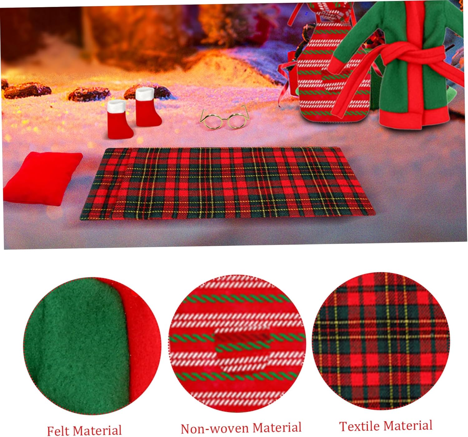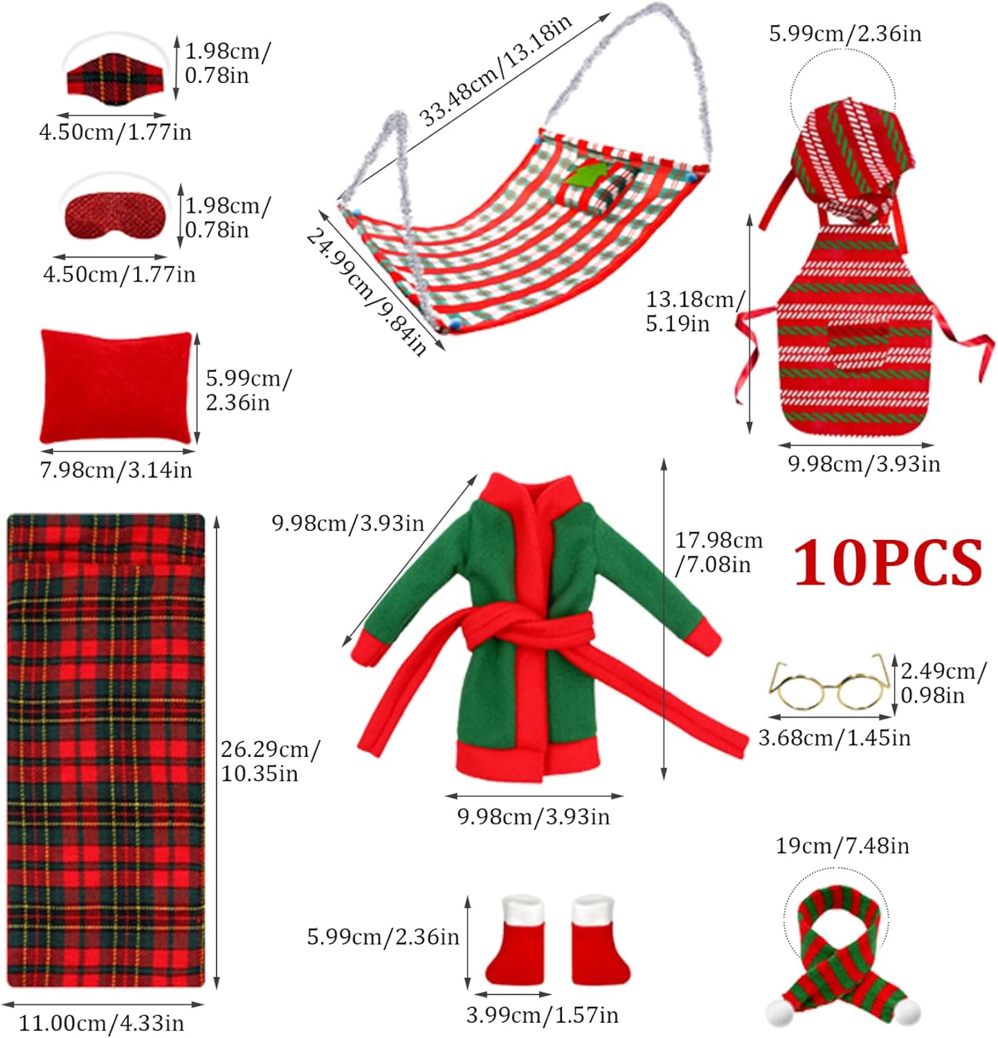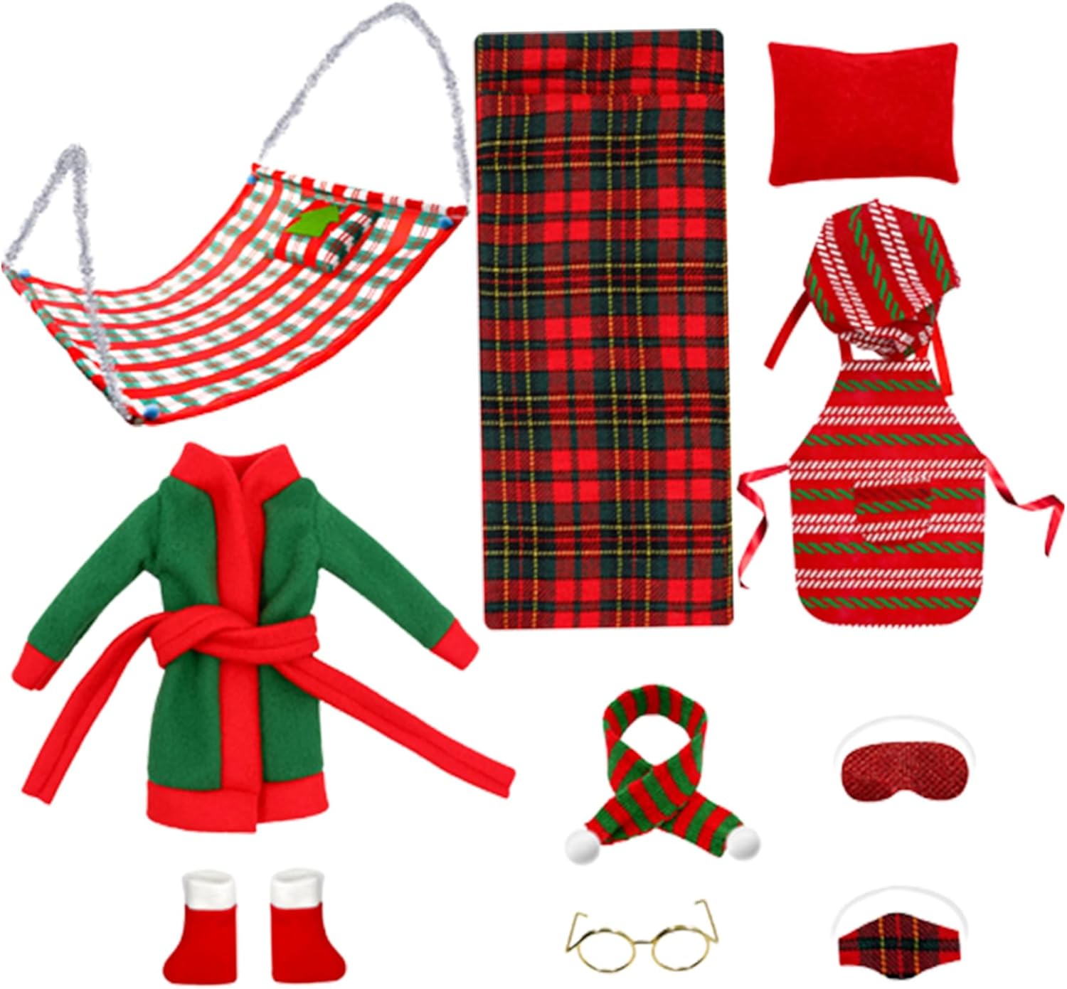 Un fantastico per Natale: i vestiti degli elfi sono fantastici per i bambini durante le festività natalizie..Possono essere utilizzati per giochi di finzione, giochi di ruolo e per soddisfare i desideri di cura delle ragazze..Forniscono divertimento e gioia senza fine, portando in vita lo spirito del Natale. Un set completo per gli elfi: Il kit degli elfi natalizi contiene tutto il necessario per creare scene accattivanti..All'interno troverai un mini sacco a pelo, un accappatoio, occhiali, sciarpa, calzini, amaca, ecc., tutti pensati per rendere realistica la tua bambola da elfo. Tema natalizio: questi set di elfi natalizi sono progettati con vari elementi natalizi, come rosso e verde, plaid, calzini natalizi, ecc. Sono molto adatti per aggiungere un'atmosfera festosa e creare una gioiosa atmosfera natalizia. Decorazione multifunzionale: il kit degli elfi di Natale è perfetto per la decorazione delle bambole, l'artigianato natalizio e la creazione di esposizioni fantasiose a casa..Posizionali sul tuo albero, mantello o tavolo per creare una magica atmosfera vacanziera. Materiali di qualità: gli accessori Elf sono realizzati con tessuti di qualità e materiali non tessuti, che sono e..Sono resistenti allo strappo e allo sbiadimento, garantendo che possano essere riutilizzati senza perdere i loro colori vivaci.