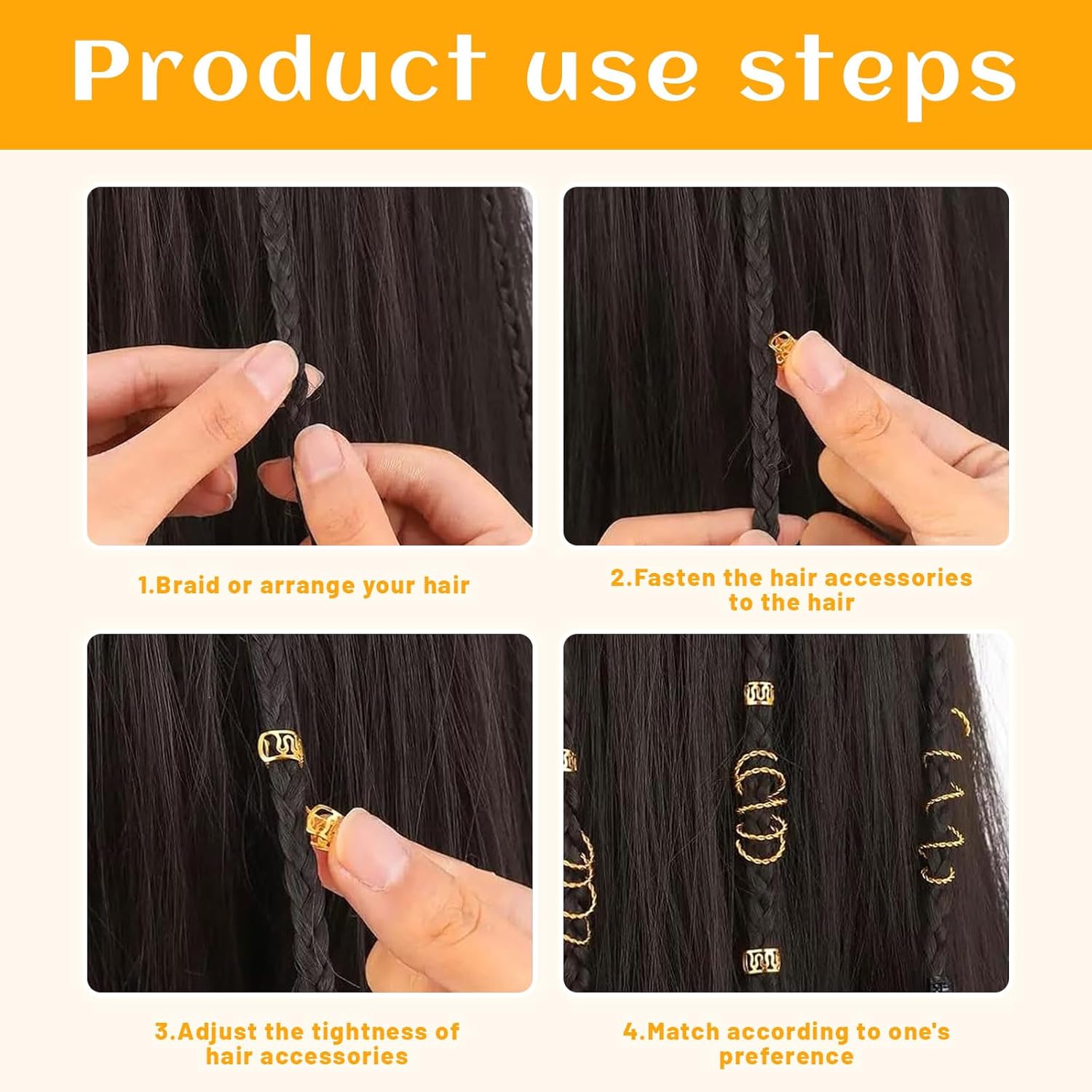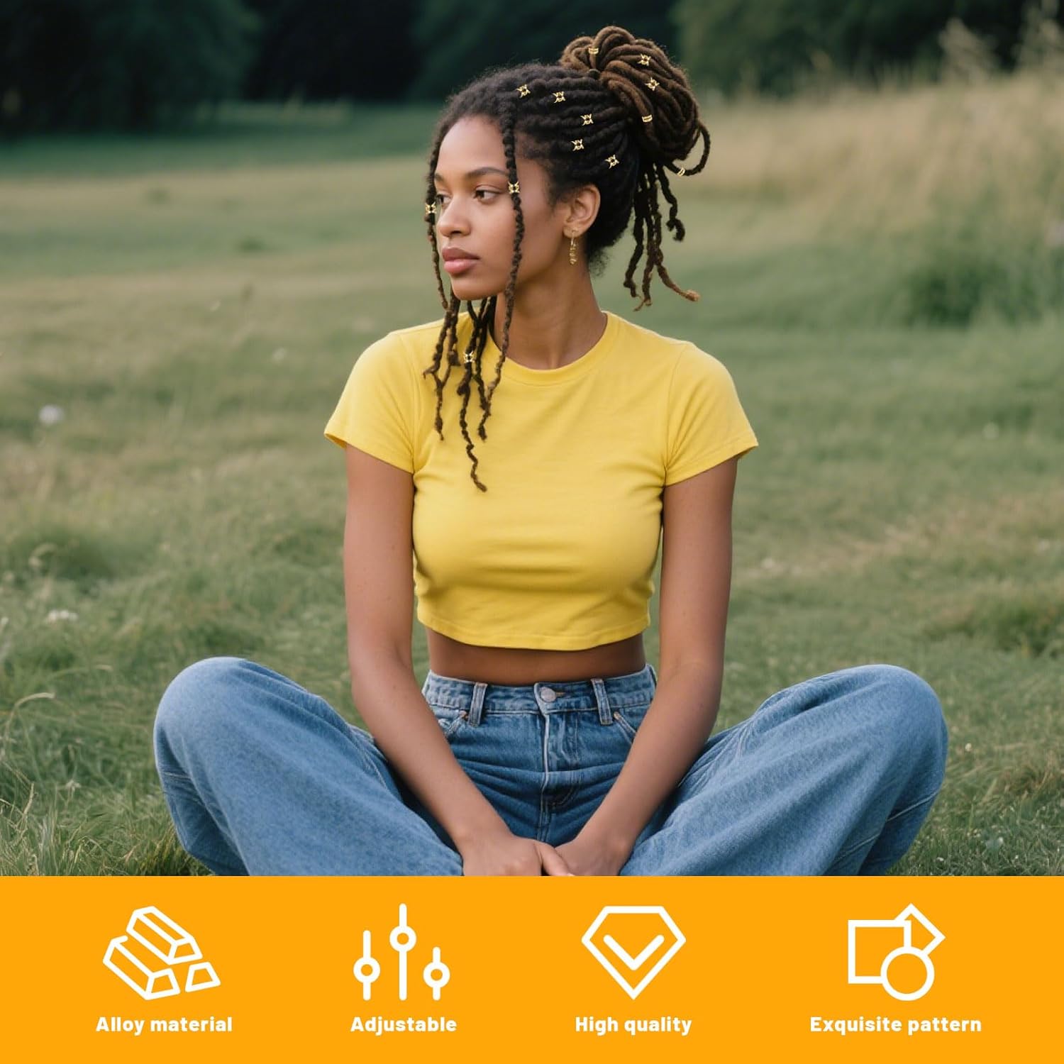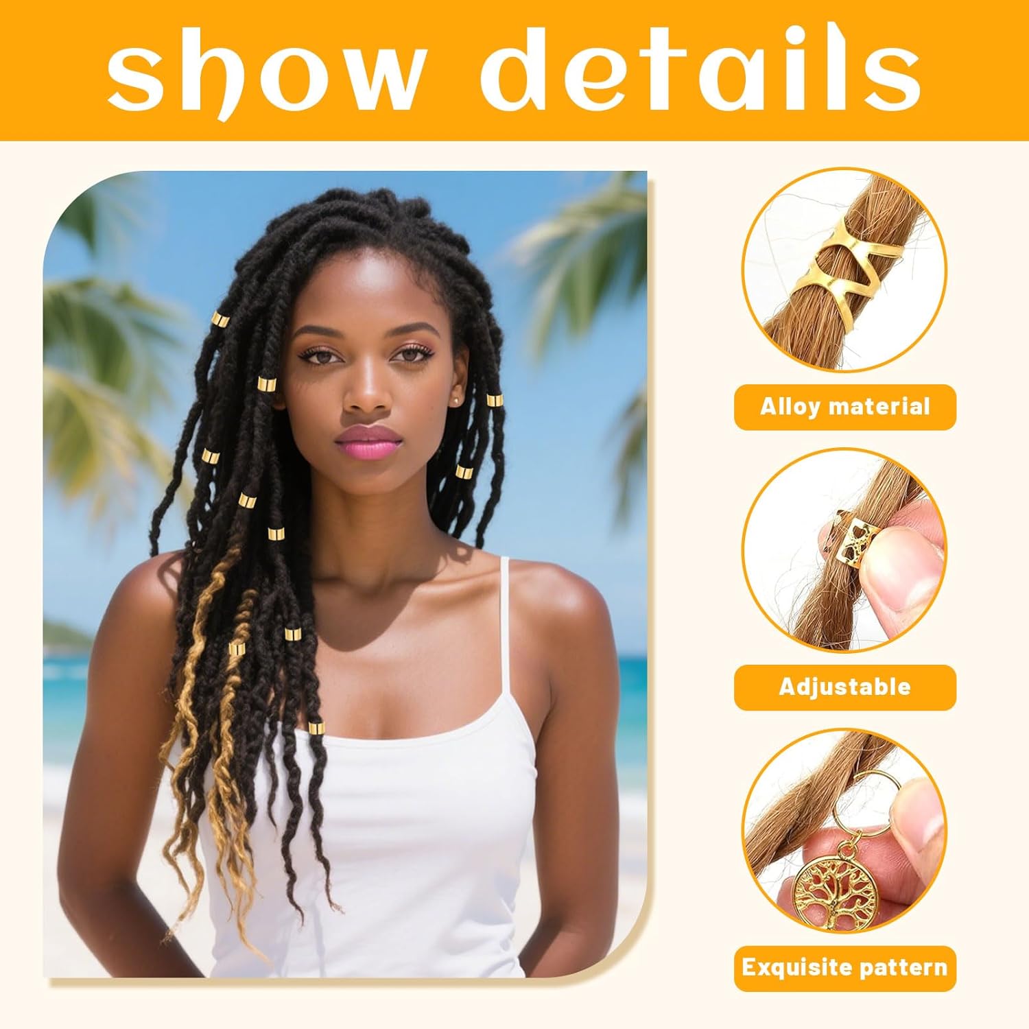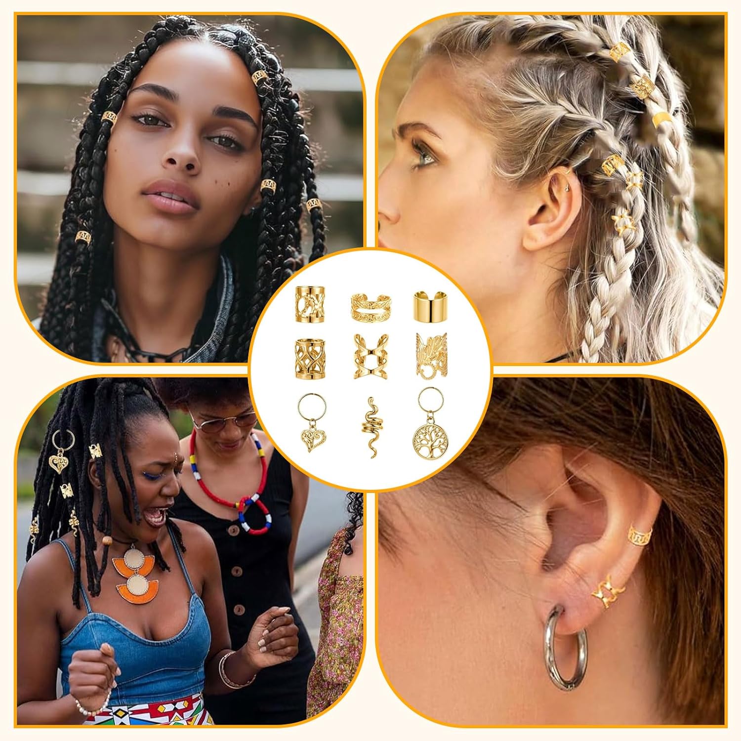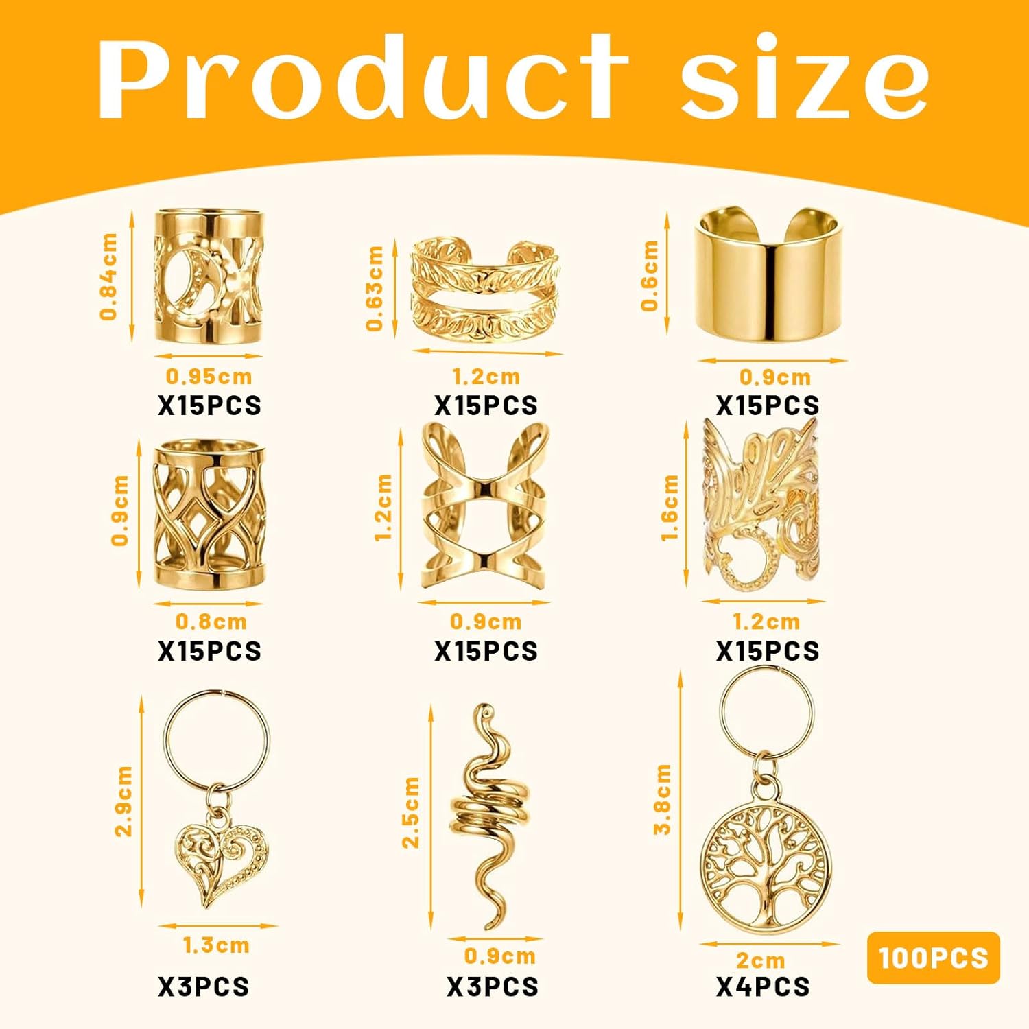 PER CLIP, NON COLLA: chi ha bisogno della colla quando hai perline per capelli da tagliare? I nostri accessori per festival rendono tutto più semplice che mai. Basta agganciarlo, si siede, non traballa e rimane al suo posto anche dopo il terzo colpo alla testa. Se hai bisogno di accessori per capelli da donna, vuoi decorare i dreadlocks o semplicemente vuoi distinguerti, questo accessorio per capelli in stile festival è un must. Anelli per capelli dorati, gioielli per capelli e accessori per capelli da donna – anche la tua treccia balla volontariamente. Capelli da festival? Ovviamente! VARIETÀ PER LA TUA FANTASIA DI ACCONCIATURA: Che sia classica, giocosa o totalmente pazza, con questo set di accessori per capelli dorati hai infinite possibilità. Modella i tuoi dreadlocks, crea capelli creativi per i festival o dai un tocco di glitter al tuo look quotidiano. I 100 pezzi offrono perline per capelli, anelli per capelli e accessori per capelli per ogni occasione. Accessori per capelli per bambini o accessori per festival per donne: li adorerai. I gioielli per capelli possono essere così semplici: inseriscili, aggiustali e la tua acconciatura da festival è pronta. I TUOI ACCESSORI DA FESTIVAL DA PORTARE: Che si tratti di Wacken, Fusion o di una festa di compleanno per bambini, il nostro set da festival di gioielli per capelli è il tuo fedele compagno. Accessori per capelli dorati, anelli per capelli, perline per capelli: tutto è a portata di mano e pronto per l'uso immediato. Con i nostri accessori per capelli da donna puoi donare splendore alla tua testa e al tuo cuore. Questo set di accessori da festival da donna è così versatile che non vorrai più farne a meno. Gioielli per capelli che mantengono ciò che promettono. Gioielli Dreadlocks che durano. Accessori per capelli che festeggiano davvero!