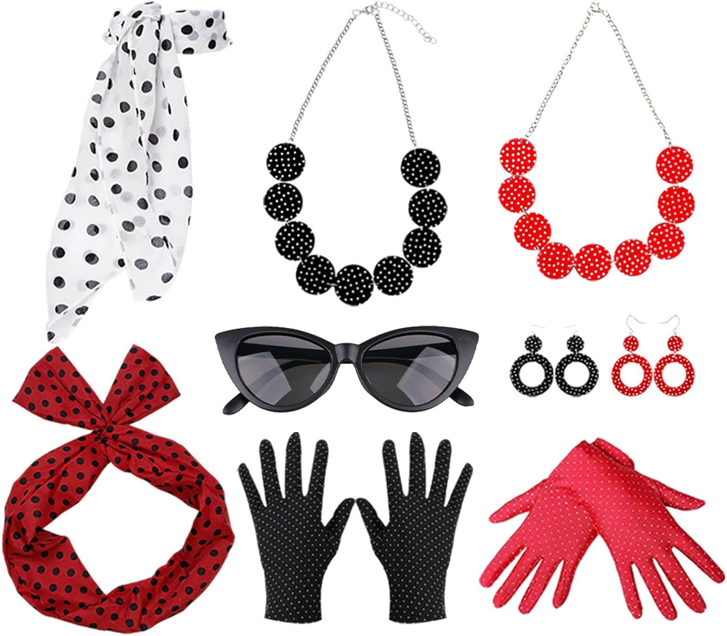 Puntini di Carattere: Accessorio moda anni '50 con pois chic che aggiunge un tocco retrò ad ogni outfit. L'abbinamento essenziale con occhiali a gatto e cintura crea un effetto visivo unico per attirare sguardi. Abbiamento intuitivo: Design sofisticati e vivaci che ti catapultano negli anni 50. Affascina gli altri e mostra il tuo gusto, abbinandosi senza sforzo a qualsiasi outfit femminile. Utilizzo versatile: Ideali per Halloween, feste di compleanno anni '50, anniversari o qualsiasi evento a tema retrò. Questi accessori evocano ricordi felici 'epoca iconica creando momenti indimenticabili. Ideale per Feste: Accessori ben realizzati con collane, orecchini, sciarpe, occhiali e guanti coordinabili a qualsiasi costume anni 50. combinazioni raffinate per un look memorabile che stupirà gli amici durante eventi festivi e occasioni speciali. Taglia Modificabile: Aggiungi stile retrò con questi accessori per costumi anni 50. La sciarpa in chiffon è abbastanza lunga per avvolgerla al collo o legarla sui capelli, mentre la fascia contiene un filo metallico flessibile per adattarsi alla forma desiderata.