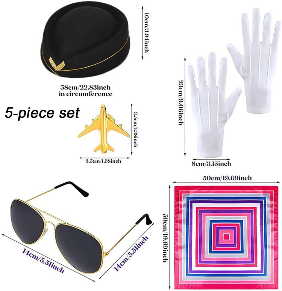 【Regali】 Il set hostess è adatto a tutti. È un regalo ideale per i familiari, si preme il ed è quindi adatto per essere indossato a lungo. 【Accessori durevoli】Il cappello hostess è realizzato in poliestere e cotone, guanti con cuciture robuste; spilla è realizzata in lega di alta qualità, robusta e durevole, che non sbiadisce facilmente. 【Taglia】 circonferenza del cappello hostess è di 58 cm, adatta alla maggior parte delle circonferenze della testa femminile; Esistono molti modi per indossare una sciarpa, senza limiti di taglia. Le persone possono usarle in base alle diverse esigenze. 【Set 5 pezzi per hostess】Il costume hostess di volo include cappello, sciarpe, spilla, occhiali sole e guanti. Il semplice set hostess ti aiuta a completare rapidamente un look elegante, soddisfacendo le tue esigenze di abbigliamento per le feste. 【Vari】Tutti si vestiranno con questo set di costumi hostess. È perfetto per feste a tema volo, addii celibato, feste in uniforme, feste di Halloween, addii nubilato, feste di compleanno, eventi cosplay, feste in maschera e molto altro. Diventa unico a una festa in maschera.
