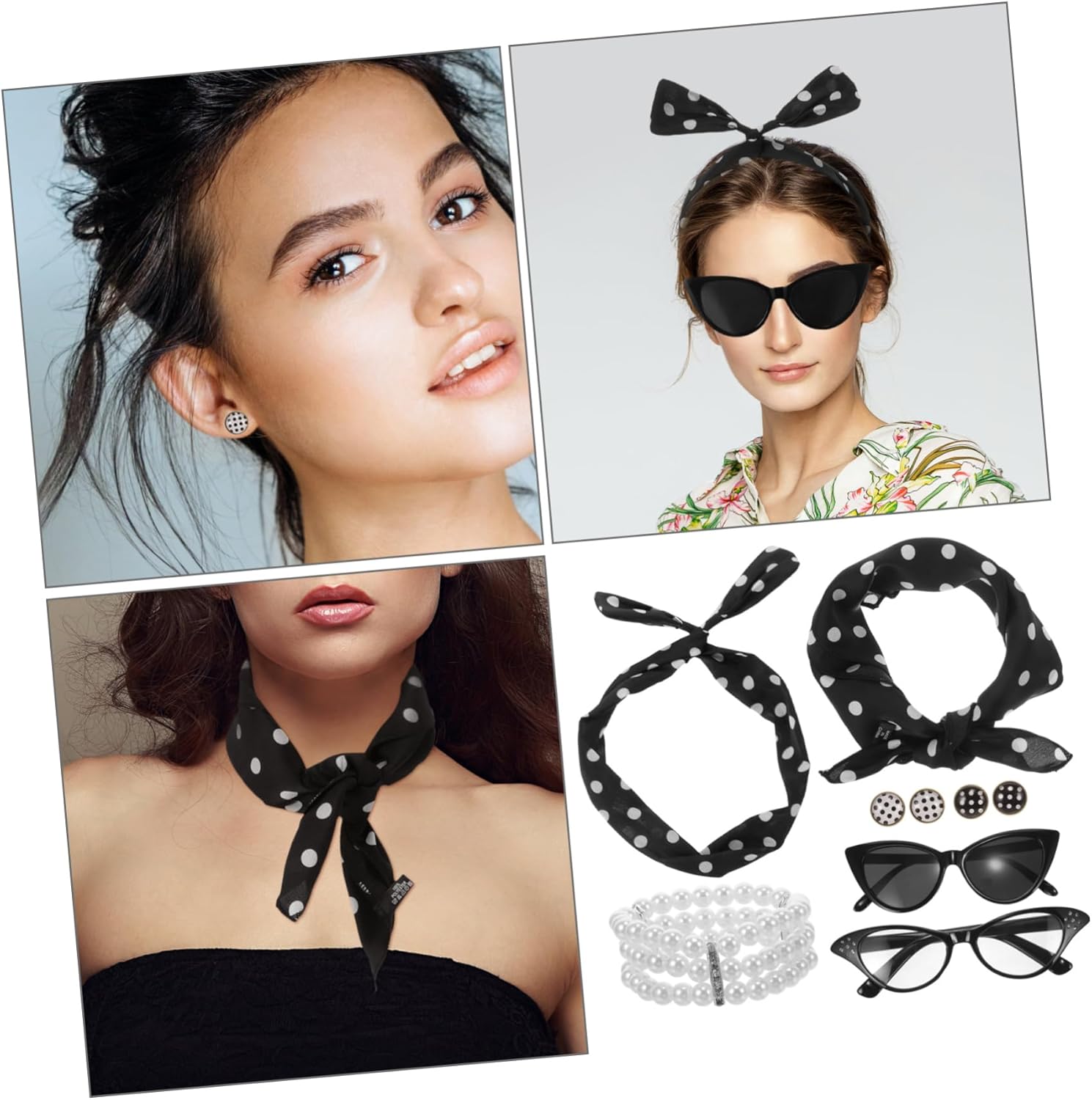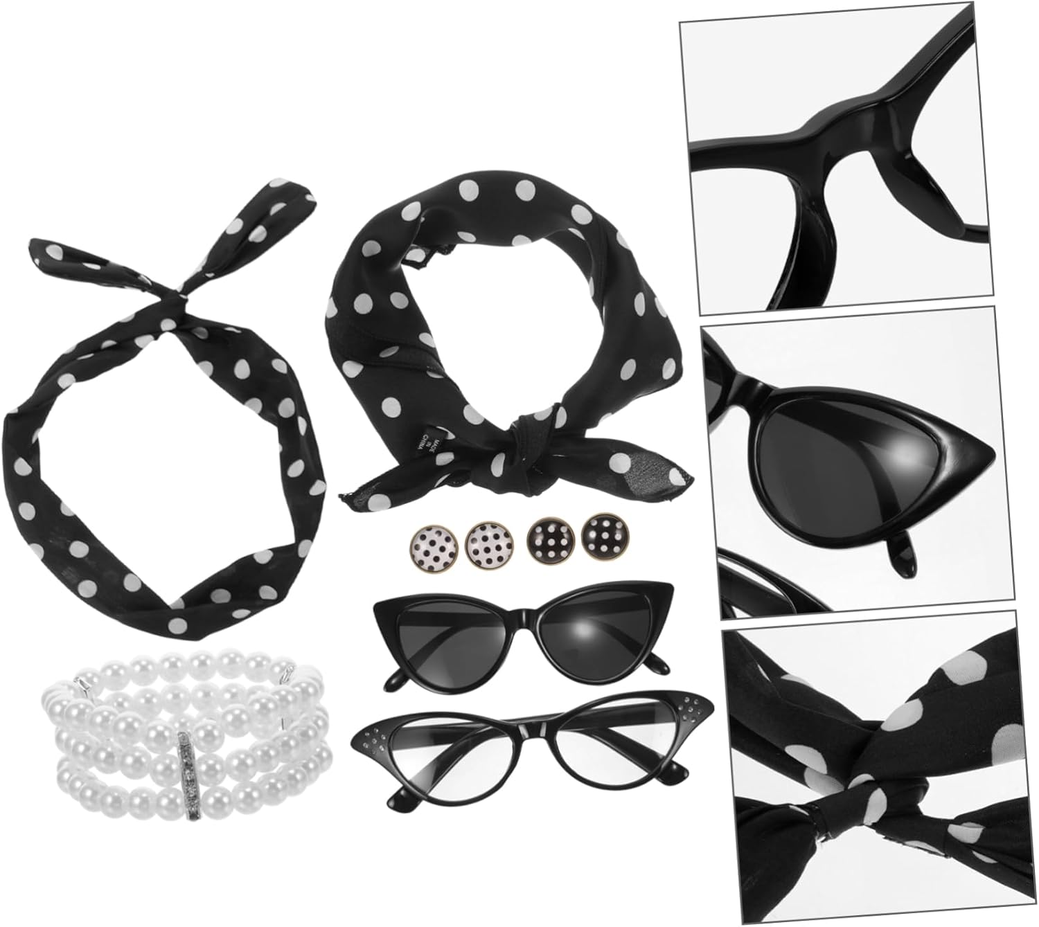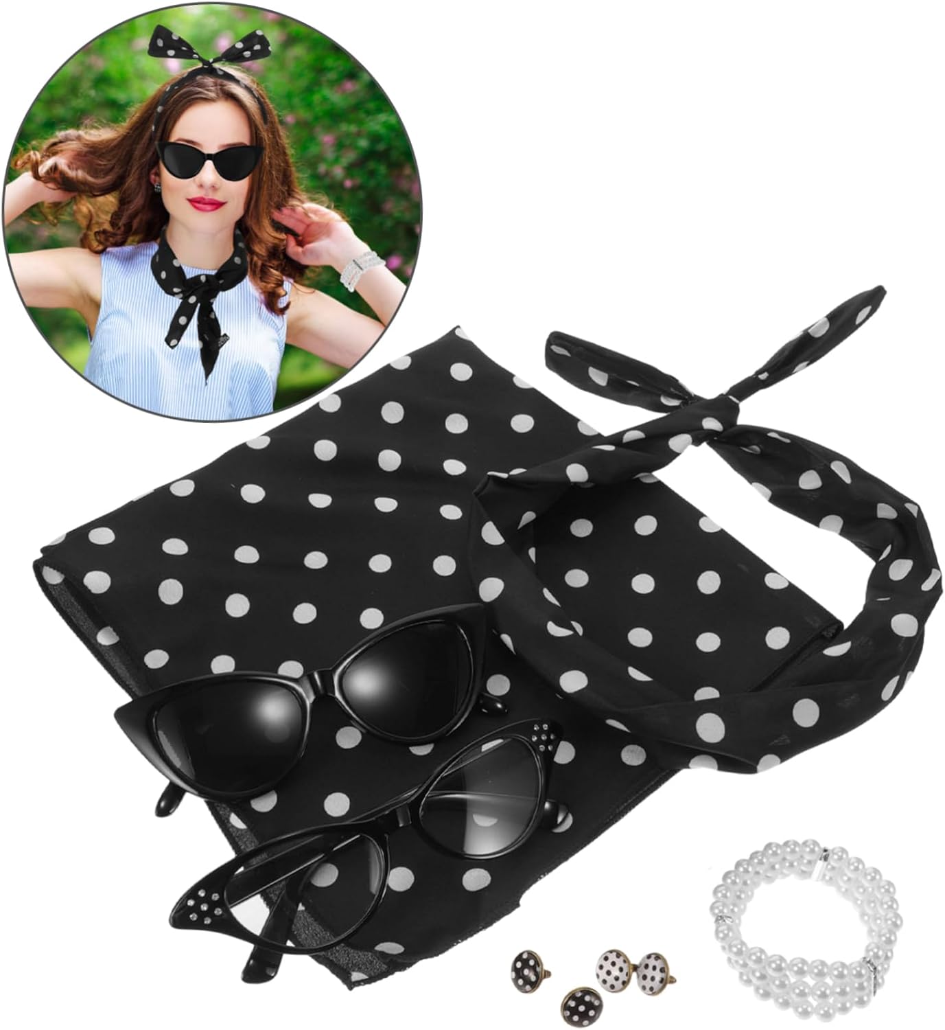 Il pacchetto include 1 x braccialetto 1 x fascia per 1 x sciarpa 2 x occhiali 2 x paia di orecchini Caratteristiche -Dimensioni: 75,00X5,50X0,20 cm/29,48X2,16X0,08 pollici oggetti di scena per costumi da gioco di ruolo -Materiale: poliestere, oggetti di scena per cosplay in plastica per donne -Colore: accessori per costumi assortiti per adulti -Dimensioni: 46,00X46,00X0,20 cm/18,08X18,08X0,08 pollici oggetti di scena per cabina fotografica Informazioni sulle merci Questo set di accessori per feste a tema anni '50 è un classico accessorio per cosplay adatto a feste, balli e occasioni di gioco di ruolo. Accessori per costumi in maschera È comodo e resistente, con una varietà di stili tra cui scegliere per soddisfare diverse esigenze. Accessorio per cosplay Perfetto per aggiungere un tocco di divertimento a qualsiasi evento, questo set di fasce per per feste anni '50 è un accessorio indispensabile per chi ama l'atmosfera retrò