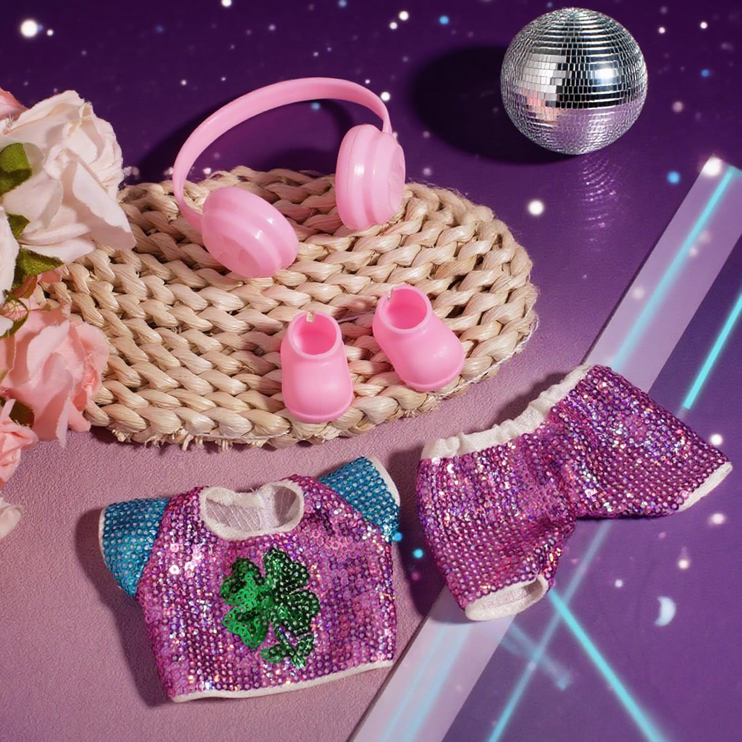 Contenuto del pacchetto: questo pacchetto contiene 1 bambola, tra cui 1 cuffia rosa, 1 scarpa rosa, 1 costume con paillettes blu-viola e 1 pantaloni paillettes viola, creando un aspetto irresistibilmente carino per le tue bambole lussuose. Sono fantastici per le bambole da 17 cm. Bambola non inclusa. Materiale di qualità: gli abiti delle bambole sono realizzati con paillettes di ottima qualità e plastica, affidabili, resistenti e durature, difficili da rompere, sbiadire o danni. Design carino: il nostro set di abbigliamento per bambole è progettato con un look adorabile ed elegante, con un look da paillettes retrò degli anni '70. Che si tratti di indossarli per un'occasione casual o speciale, questi accessori delle bambole renderanno le tue bambole ancora più deliziose e alla moda. USAGGI AGGIUNTI: gli abiti delle bambole sono perfetti per il gioco, le raccolte di bambole, le sessioni fotografiche, il gioco di ruolo e altro ancora. Sono fantastici per il gioco quotidiano e display speciali, incoraggiando la creatività e offrono un intrattenimento infinito. Regalo ideale: pronto per il regalato a qualsiasi appassionato di bambole o collezionista. Gli accessori delle bambole fanno un regalo ideale per donne, familiari, amici, ecc. Per compleanni, Natale, Halloween, Ringraziamento, ecc.