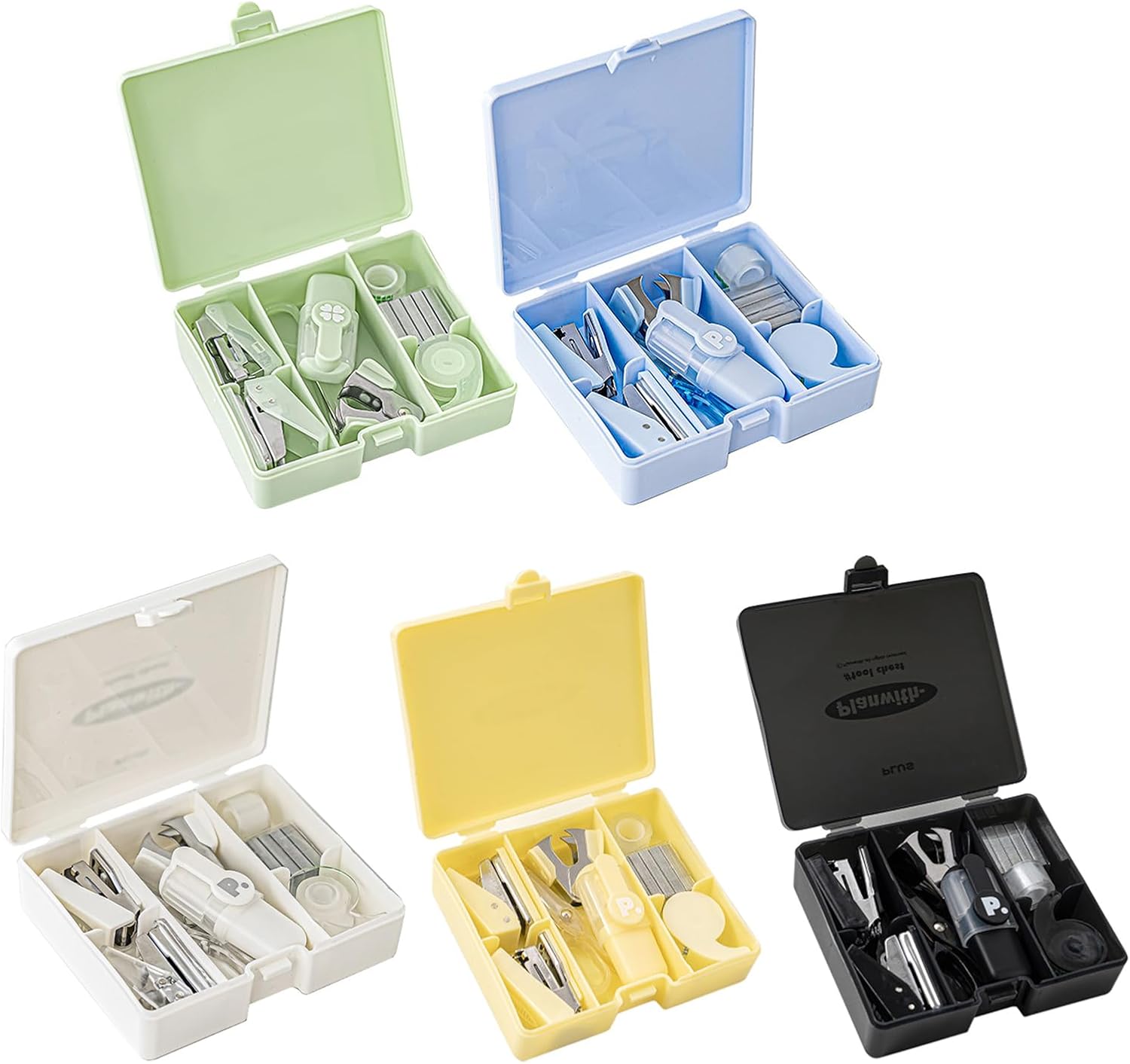 I suoi progetti compatti sono dotati scomparti organizzati per l'archiviazione degli strumenti, con punzatore che gestisce 10 fogli e pinzatrice che protegge 12 pagine senza sforzo utilizzando la base standard Adatto a studenti, insegnanti, professionisti ufficio e appassionati artigianato che necessitano forniture per uffici multifunzionali per documenti, organizzazioni per la scheda organizzazione o progetto journaling e scrapbooking creativo Ampiamente utilizzato per mantenere l'area lavoro ordinatamente in uffici, aule e camere casa o artigianato durante l'organizzazione documenti, foto o pagine album album in modo sicuro pacchetto viene fornito con punzoni fori, pinzatrice, rimozione della base, graffette, forbici, marcatore e nastro adesivo, realizzato con plastica e metallo lunga durata per l'uso uffici o scolastici Questo set multifunzionale eleva l'efficienza del lavoro con strumenti coordinati a colori progettati per attività quotidiane ergonomiche