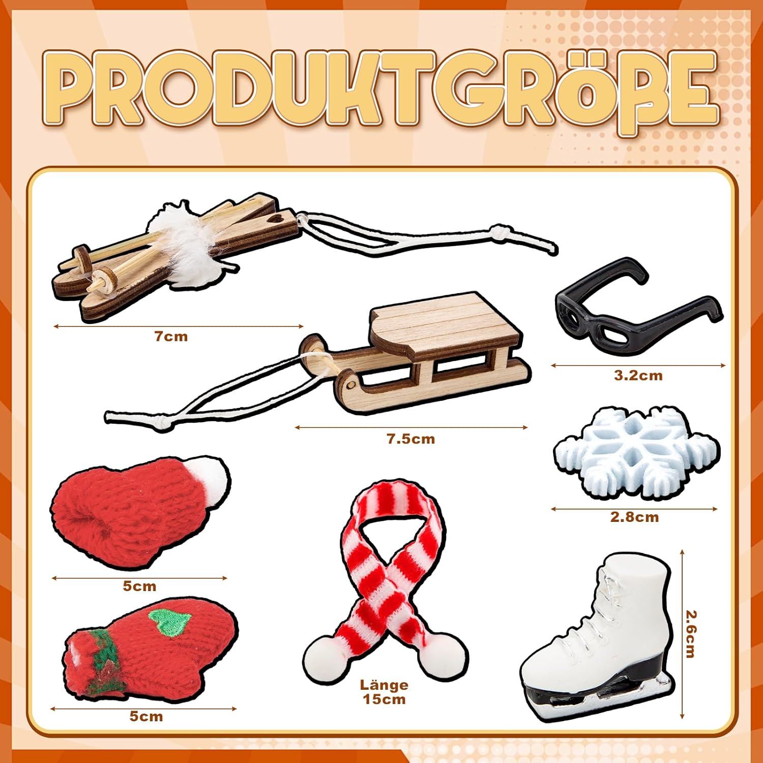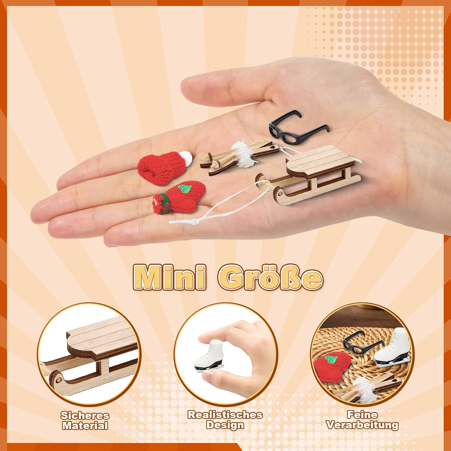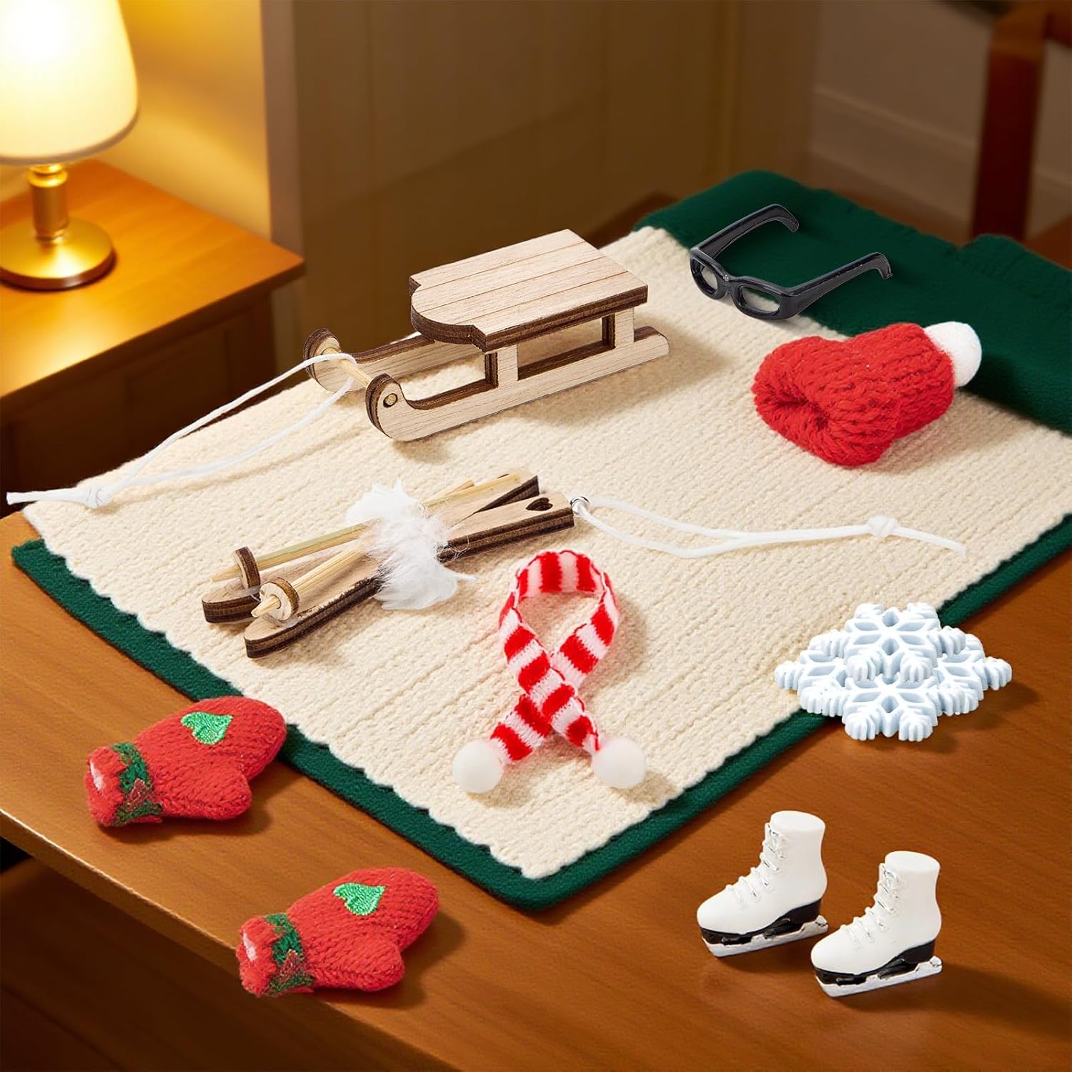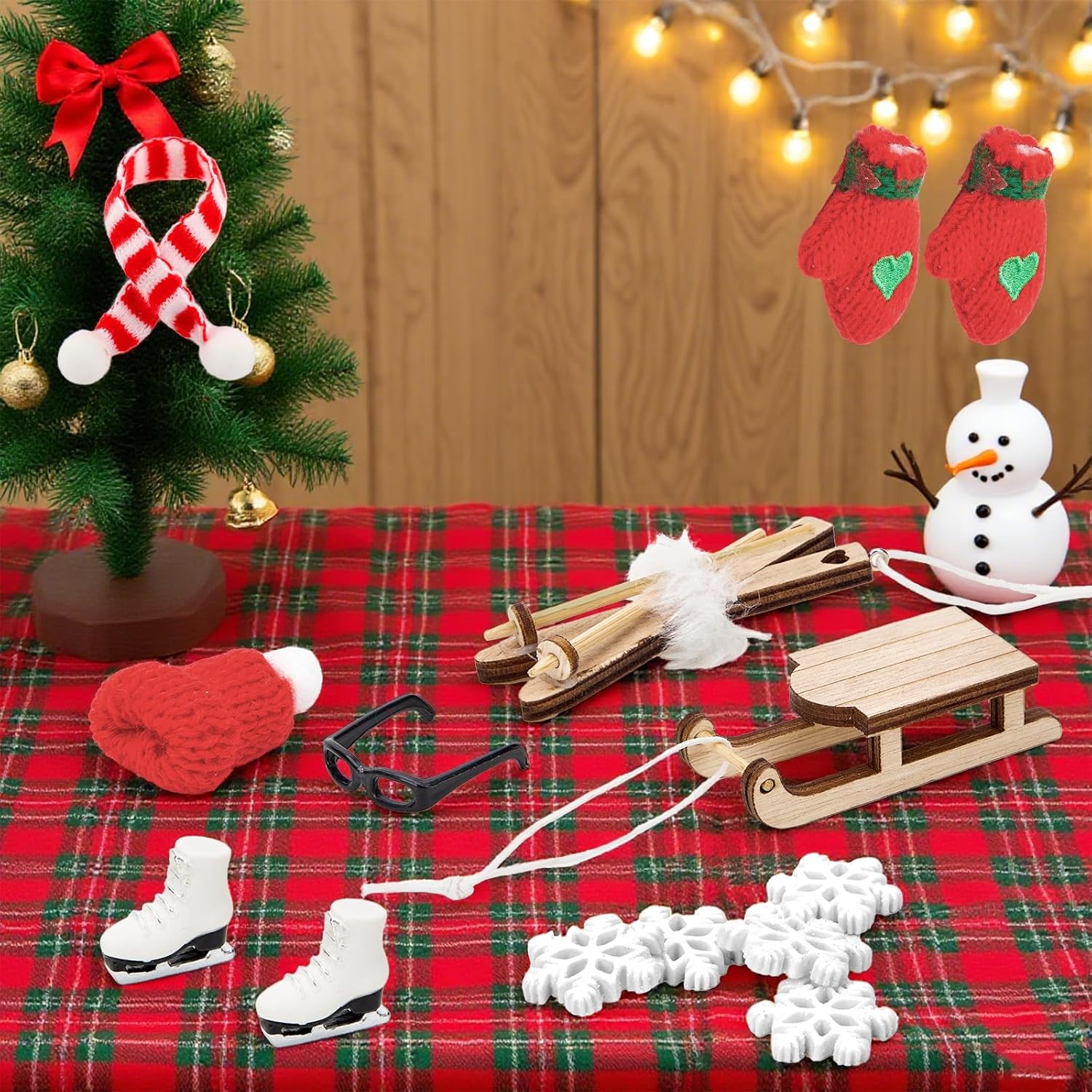 Set casa delle bambole in miniatura: composto da 1 slitta, 1 berretto, 1 sciarpa, 1 paio di guanti, 1 paio di sci, 1 paio di scarponi da sci, 1 maschera da sci, 5 fiocchi di neve, è la decorazione ideale per la casa delle bambole dei bambini Mini design: slitta, sci, scarponi da sci, ecc. Sono gli accessori più popolari per paesaggi invernali in miniatura. Sono anche combinati con fiocchi di neve, cappelli e sciarpe, per rendere la casa delle bambole ancora più ricca Materiali sicuri: questo accessorio per casa delle bambole in miniatura è realizzato in legno di alta qualità, resina, maglia e plastica sicura e ha un effetto realistico. È piccolo e fine, rotondo e liscio, sicuro, in modo che i bambini possano usarlo e giocare senza problemi Regalo ideale: gli accessori a forma di gnomo non sono solo una scelta ideale per gli amanti della casa delle bambole e gli appassionati di mondo in miniatura, ma anche un regalo unico per amici e familiari. Che si tratti di una vacanza, di un compleanno o di altre occasioni speciali, questo set da slitta a forma di gnomo è una Mini decorazione natalizia: questa casa delle bambole in miniatura può essere utilizzata come decorazione natalizia o per decorare la camera da letto, l'albero di Natale o anche il tavolo da pranzo. Puoi posizionarlo ovunque. Usa questi accessori fai da te mini casa per decorare la tua mini casa che sia bella e unica
