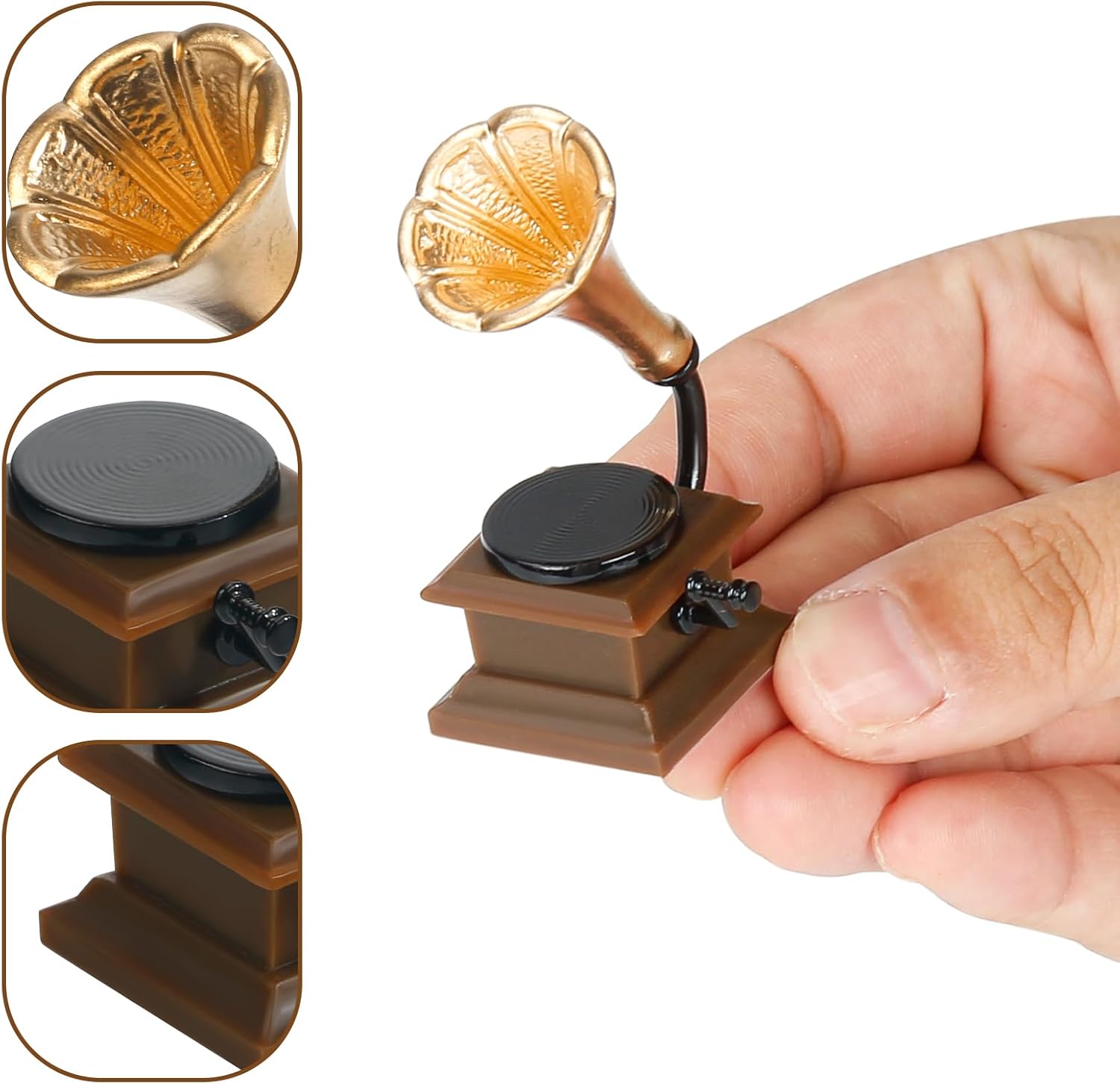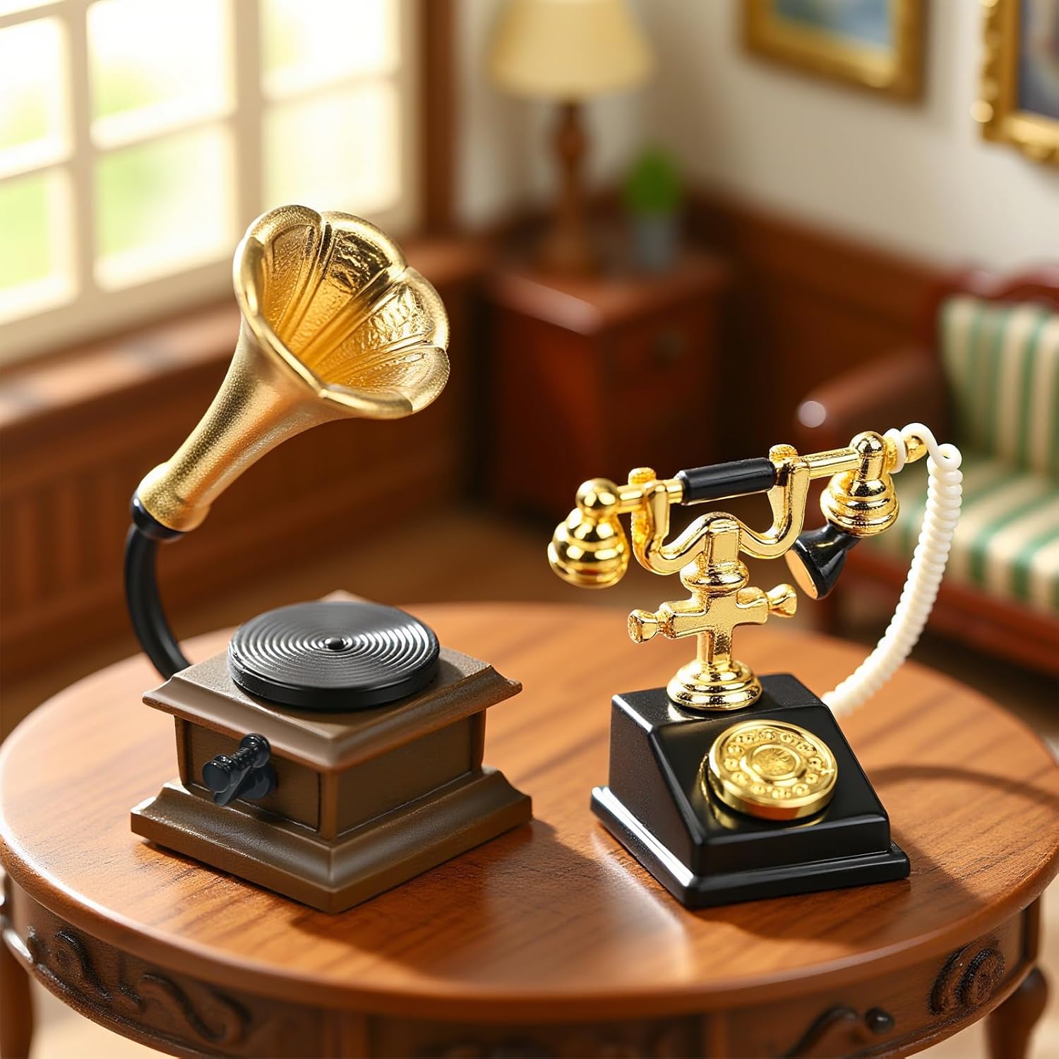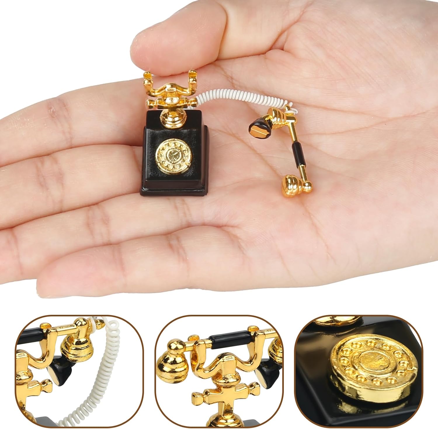 【Telefono retrò in miniatura】Una perfetta replica di un telefono a disco vecchio stile con auricolare rimovibile per una maggiore interattività. Telefono in miniatura perfetto per una casa delle bambole vintage o vittoriana. Grammofono per giradischi in miniatura: il design a forma di tromba dà la squisita sensazione meccanica di un fonografo antico. Nel soggiorno o nello studio di una casa delle bambole, crea immediatamente un'atmosfera artistica. Perfetto per scene retrò: che si tratti di un classico soggiorno, una camera da letto retrò o uno studio letterario, questo set di decorazioni può essere facilmente integrato per creare uno spazio estetico nostalgico. 【 Massimo grado di restauro】Dal quadrante del telefono al supporto in metallo del grammofono, ogni dettaglio è strettamente ispirato al design antico e la lavorazione artigianale in miniatura è sorprendente. Regalo per la casa delle bambole: decorazione vintage per la casa delle bambole con un tocco di nostalgia. Il telefono in miniatura e il fonografo sono un ottimo regalo per gli amanti della casa delle bambole e gli appassionati di miniatura!