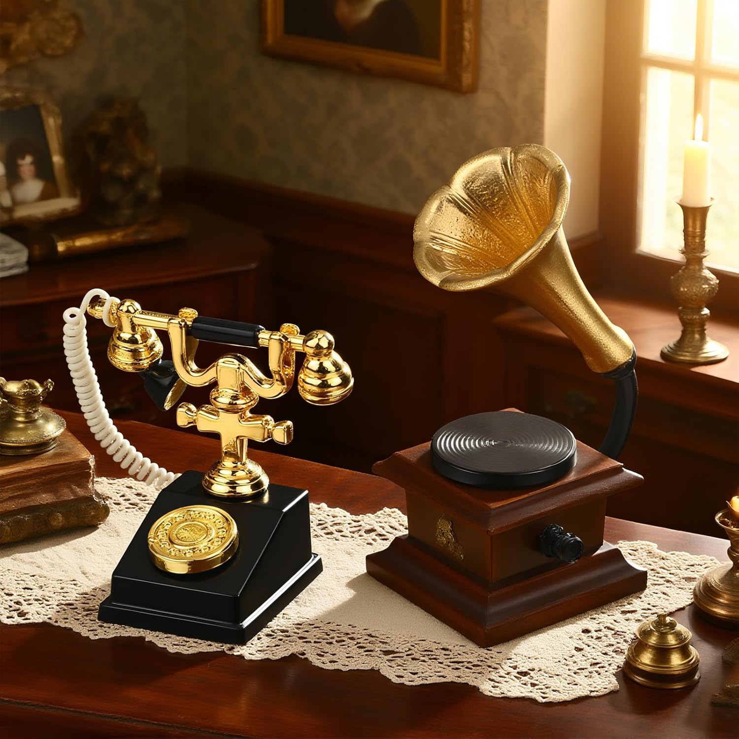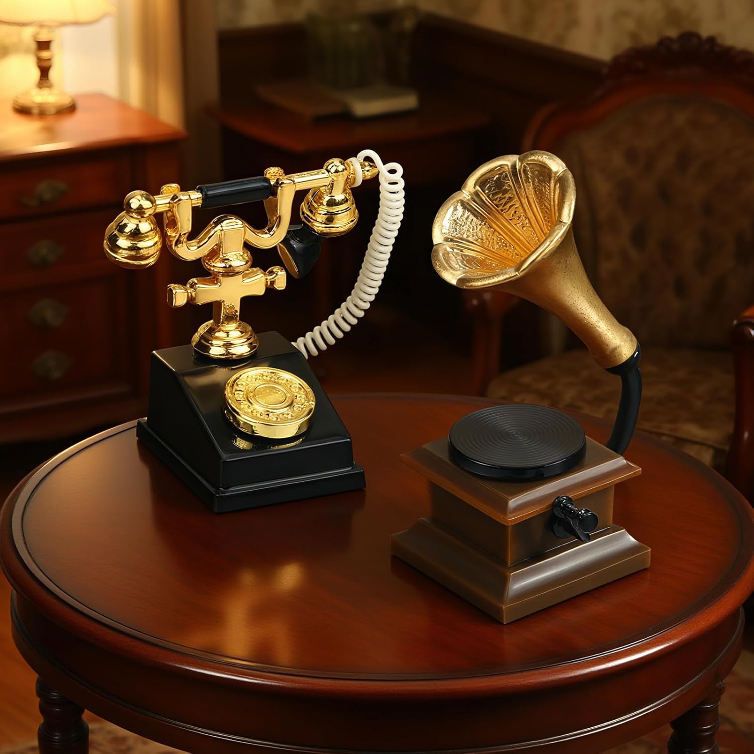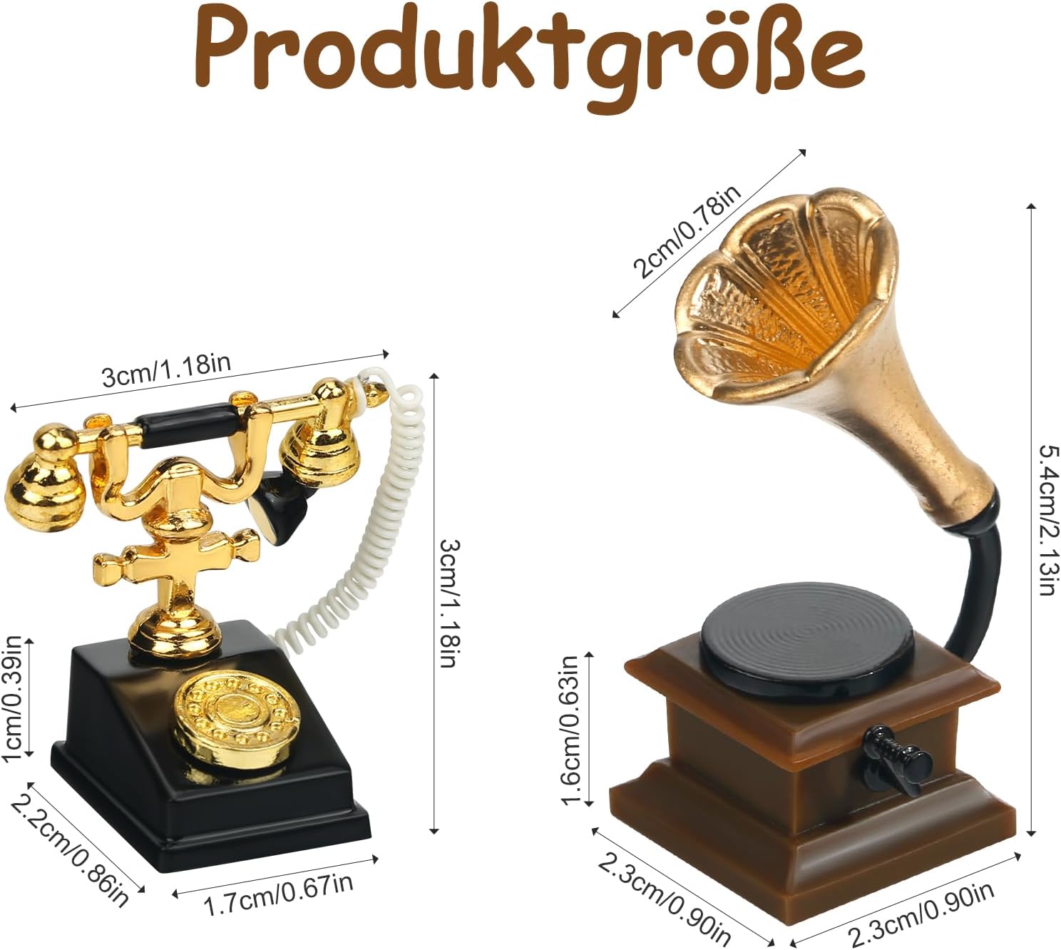 【Telefono retrò in miniatura】Una perfetta replica di un telefono a disco vecchio stile con auricolare rimovibile per una maggiore interattività. Telefono in miniatura perfetto per una casa delle bambole vintage o vittoriana. Grammofono per giradischi in miniatura: il design a forma di tromba dà la squisita sensazione meccanica di un fonografo antico. Nel soggiorno o nello studio di una casa delle bambole, crea immediatamente un'atmosfera artistica. Perfetto per scene retrò: che si tratti di un classico soggiorno, una camera da letto retrò o uno studio letterario, questo set di decorazioni può essere facilmente integrato per creare uno spazio estetico nostalgico. 【 Massimo grado di restauro】Dal quadrante del telefono al supporto in metallo del grammofono, ogni dettaglio è strettamente ispirato al design antico e la lavorazione artigianale in miniatura è sorprendente. Regalo per la casa delle bambole: decorazione vintage per la casa delle bambole con un tocco di nostalgia. Il telefono in miniatura e il fonografo sono un ottimo regalo per gli amanti della casa delle bambole e gli appassionati di miniatura!