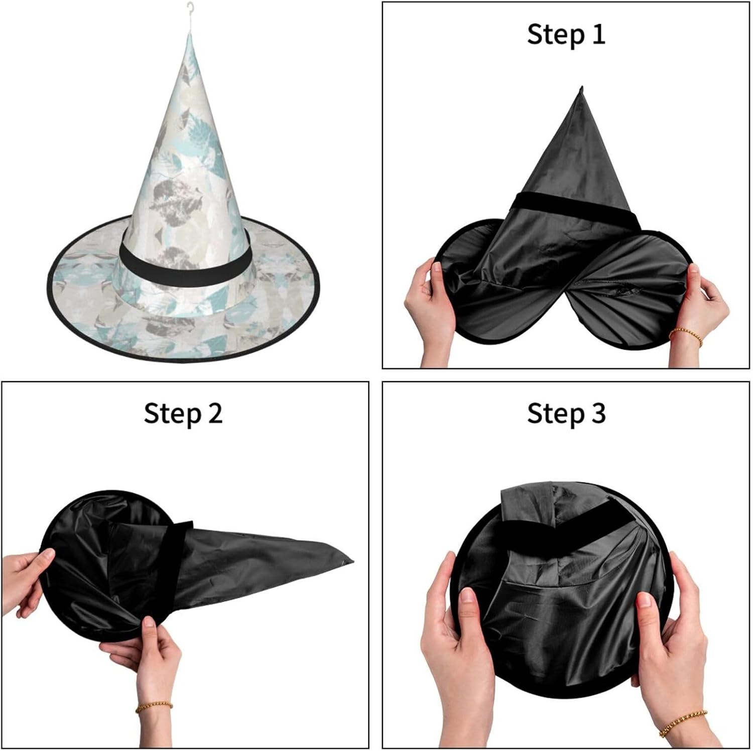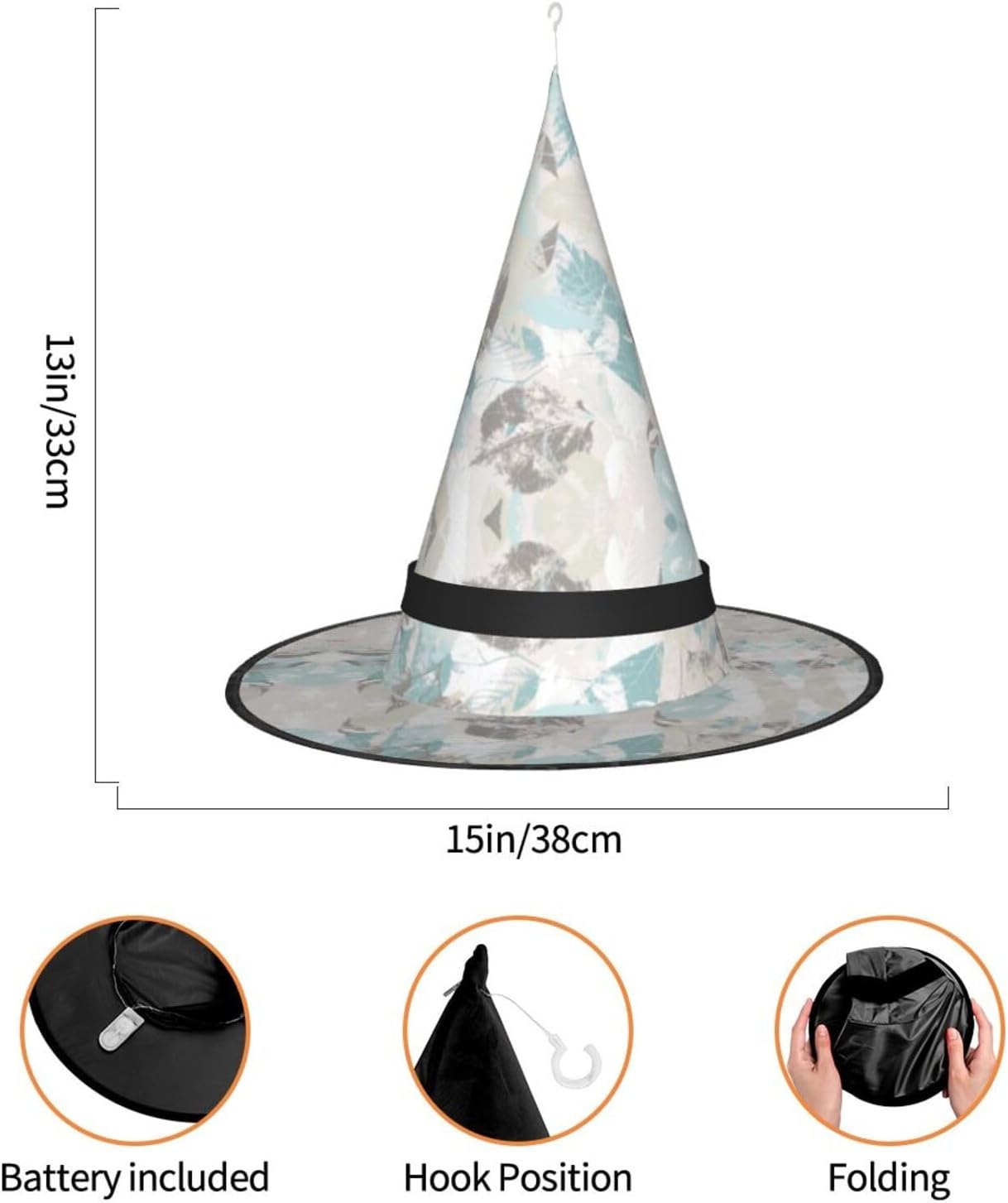 Foglie grigio menta Aggiungi un tocco stravagante al tuo costume con il nostro incantevole cappello da strega, l'accessorio perfetto per una varietà di eventi festivi e divertenti. Presenta un accattivante design a stampa completa ed è realizzata in morbido tessuto Oxford resistente. Design intelligente, la parte superiore del cappello può essere ridotta e la tesa attorcigliata e piegata per risparmiare spazio, rendendolo portatile e facile da trasportare. Una delle sue caratteristiche distintive è la stringa luminosa interna a LED che si illumina per creare un'atmosfera magica. Comodamente, il cappello può anche essere appeso come decorazione utilizzando il gancio sulla parte superiore. Indossa questo affascinante cappello da strega alla tua prossima festa, carnevale o evento di Halloween e diventa il centro di attrazione. Nonostante le sue grandi dimensioni, è leggero, il che lo rende comodo da indossare o trasportare senza sentirsi appesantito. Rendi le tue occasioni speciali con il nostro incantevole cappello da strega!