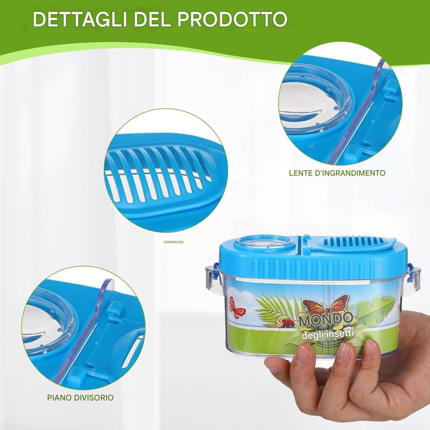 Zona Interazione Trasparente: Realizzata in materiale PP trasparente per massima visibilità, crea spazio simile alla natura che consente ai bambini di osservare da le interazioni tra farfalle in modo diretto e affascinante Maneggevolezza Ottimale: Rafforza la concentrazione sui particolari grazie alla lente per viste ingrandite e pinzette progettate per presa delicata, creando un ambiente stimolante per piccoli esploratori. Pareti ventilate a rete: Progettazione con pareti a rete traspirante e spazi dedicati a specie diverse permette ai bambini di seguire l'intero processo di metamorfosi favorendo un'educazione scientifica interattiva senza soluzione di continuità Strumento per Curiosità: Ideale per attività scientifiche in interni o all'aperto incoraggia l'apprendimento pratico stimolando curiosità e osservazione mentre i bambini esplorano il mondo naturale in modo naturale e interattivo Kit Completo: Equipaggia i bambini con questo set esplorazione contenente gabbia, strumenti e retino, combinando divertimento e apprendimento durante emozionanti scoperte all'aperto
