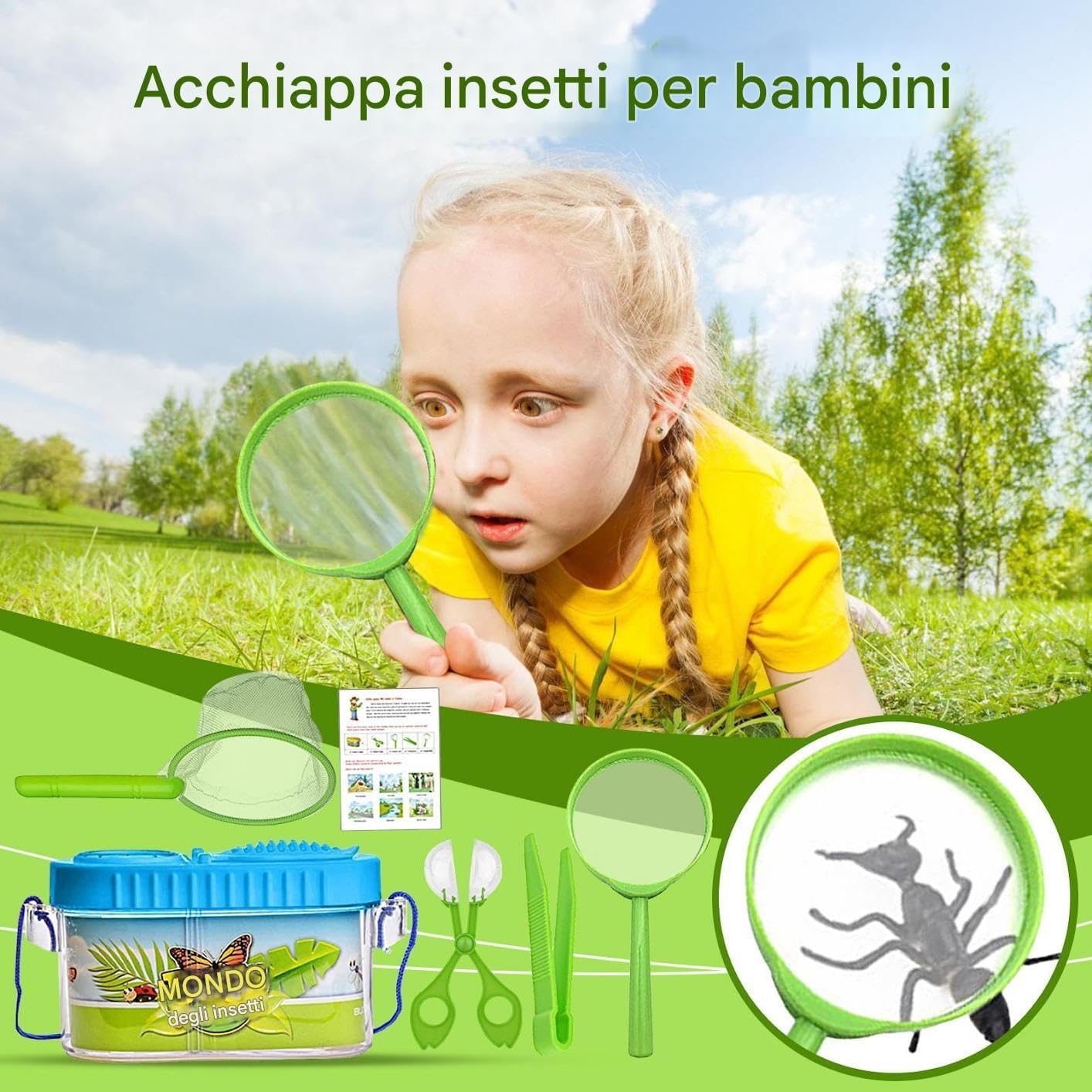 Stazione Osservazione Farfalle: Realizzato in PP trasparente per trasparenza ottimale, questo kit osservazione offre un ambiente naturale i bambini possono godersi facilmente i movimenti e le interazioni delle farfalle Esplorazione Coinvolgente: Favorisce l'osservazione minuziosa usando la lente per esaminare i dettagli, mentre le pinzette consentono una presa delicata, rendendo la scoperta un'esperienza di apprendimento entusiasmante. Strumento didattico metamorfosi: Permette di osservare in sicurezza le fasi di trasformazione grazie alle pareti a rete per ventilazione ottimale e zone separate progettate per specie diverse potenziando l'esplorazione educativa in modo naturale Esplorazione Scientifica: Progettato per interni ed esterni fonde educazione e intrattenimento motivando i giovani a partecipare attivamente all'apprendimento mentre affinano efficacemente le capacità osservative Apprendimento Giocoso: Incoraggia giovani esploratori con kit completo di gabbia, strumenti e retino, progettato per esperienza informativa e coinvolgente nella cattura insetti