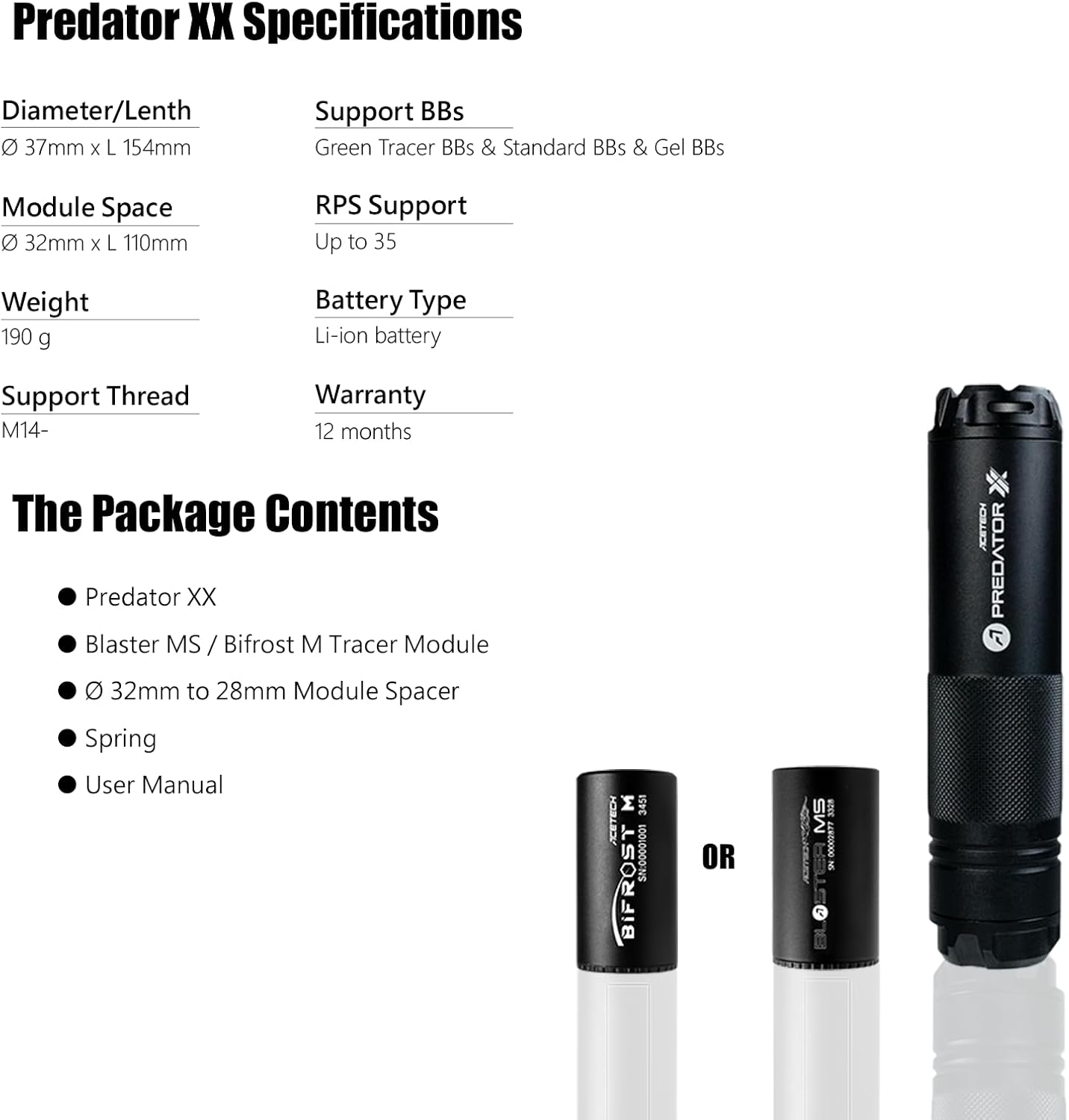 Design di miglioramento metallico: il robusto guscio in metallo di Predator X protegge il tracciante dal colpo casuale BB della concorrenza. Installazione semplice: Predator X è facile da tenere, installare o rimuovere con la maniglia a scacchi 【Batteria ricaricabile 10440 Li-Poly】Viene fornito con un cavo di ricarica USB e una porta di ricarica per liberare le borse da batttery a secco. Supporta sia Green Tracer BB che Red Tracer BB: Green Tracer BB non solo si illuminano al buio, ma puoi anche illuminare il BB rosso. Supporta sfere luminose verdi e rosse
