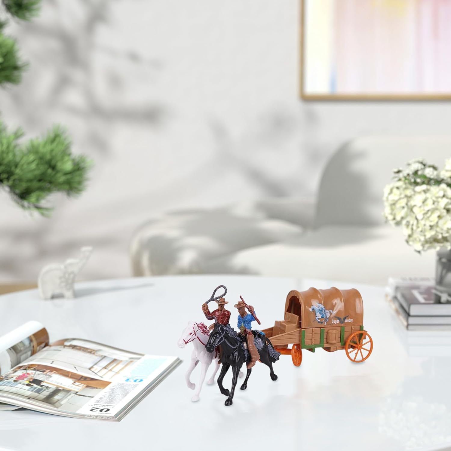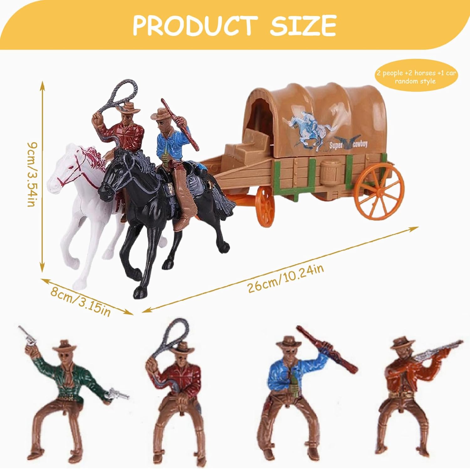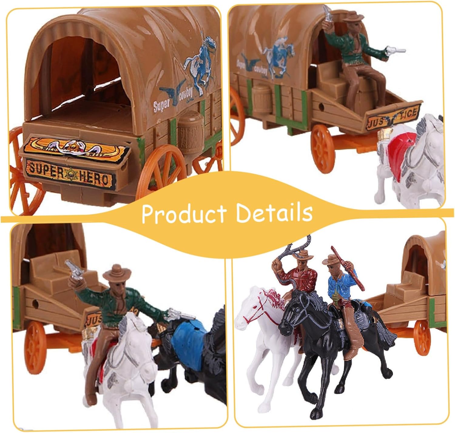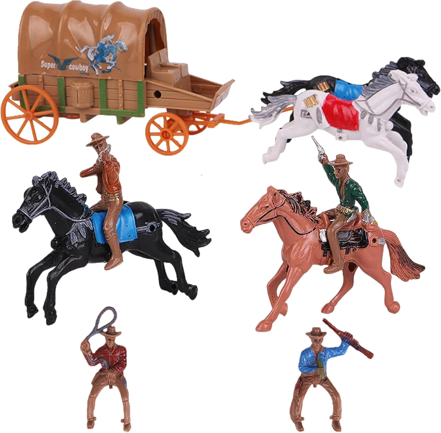 Set completo da cowboy: questo set di action figure include 2 persone +2 cavalli +1 carro, consentendo infinite possibilità di gioco nella creazione di scene western divertenti e avventurose. Perfetto per i giochi da tavolo: queste action figure sono anche un'ottima aggiunta agli oggetti di scena dei giochi da tavolo, permettendoti di incorporare il tema del cowboy nei tuoi giochi personalizzati, rendendoli più divertenti e coinvolgenti. Ideale per collezionisti e bambini: che tu sia un collezionista di giocattoli a tema cowboy o cerchi un divertimento per i bambini, questo set è un'aggiunta perfetta a qualsiasi collezione e un ottimo strumento per sviluppare abilità narrative. Costruzione in plastica: realizzati in plastica, questi giocattoli sono progettati per durare e resistere a giochi difficili, rendendoli perfetti per le mani dei bambini o come personaggi da collezione per adulti. Stimola la creatività e l'immaginazione: questo giocattolo incoraggia il gioco mentale fantasioso..I bambini possono creare le proprie avventure da cowboy, promuovendo la creatività e aiutando lo sviluppo sociale durante le sessioni di gioco di ruolo.