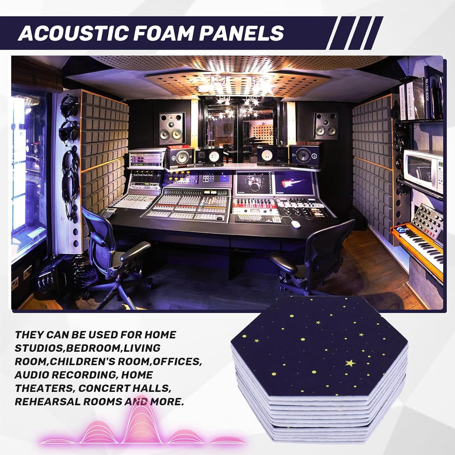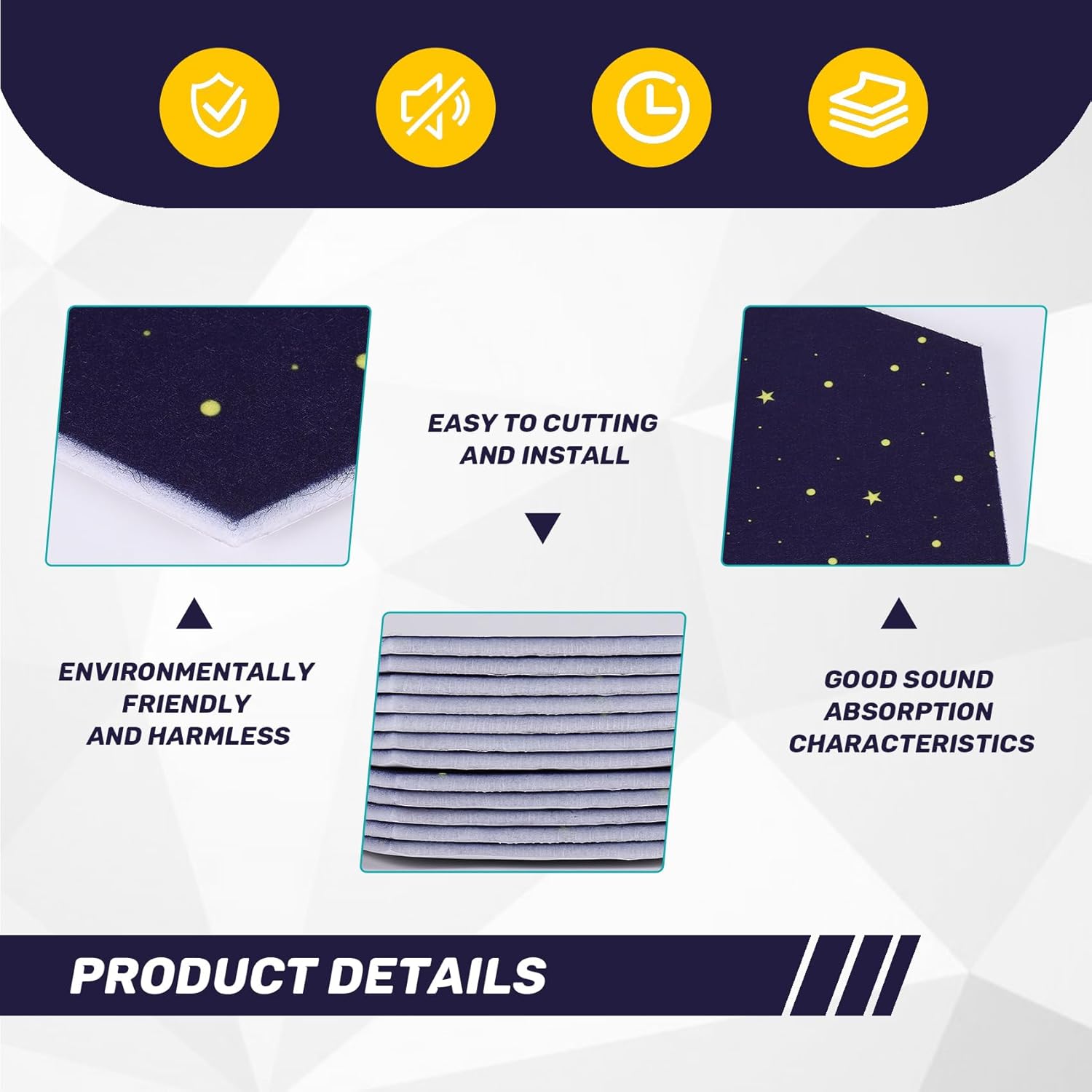 [ECO-FRIENDLY E AD ALTA DENSITÀ] È sicuro per adulti, bambini e animali domestici! Eccellente per assorbire i suoni indesiderati e ridurre gli echi. Migliora la qualità acustica in una stanza come studio di registrazione. Se stai mixando in studio, devi ridurre il suono ambientale. [MIGLIORA LA QUALITÀ ACUSTICA] Questi insonorizzanti insonorizzanti sono multiuso e aiutano ad assorbire gli echi e il rumore dall' circostante per migliorare la qualità del suono e aumentare la privacy. Possono essere utilizzati per home studio, camera da letto, soggiorno, camera dei bambini, uffici, registrazione audio, home theater, sale da concerto, sale prove e altro ancora. [FACILE DA TAGLIARE E INSTALLARE] Facile da tagliare con un coltello affilato, puoi creare diversi stili di arte murale decorativa nel tuo spazio preferito! E il set di acustici assorbenti viene fornito con un nastro resistente alcun acquisto aggiuntivo, puoi facilmente incollare i di riduzione del rumore al muro la necessità di strumenti. [ELEVATE LA TUA DECORAZIONE DELLA CASA] La nostra insonorizzante funge anche da arte murale decorativa, per l'isolamento acustico, lo smorzamento, l'isolamento acustico, la riduzione 'eco, il diffusore di riverbero e altri fonoassorbenti. I colori del stellato aiutano a trasformare la tua stanza in spazio da sogno e allo stesso tempo migliorano la qualità del suono. Il rumore non necessario durante la registrazione lo distruggerà. Il pannello fonoassorbente può assorbire il suono prodotto da bassa frequenza, media frequenza e alta frequenza, che è molto adatto per la registrazione.