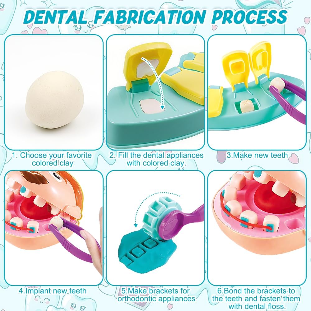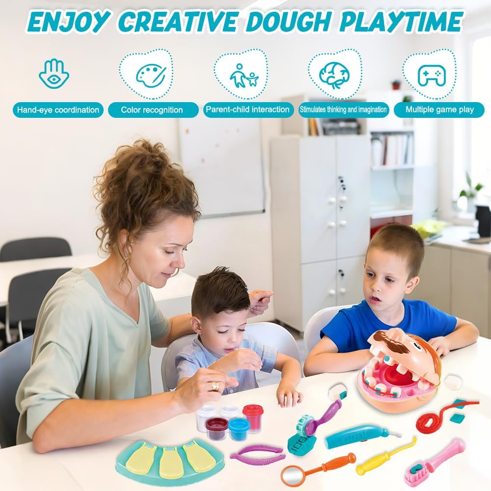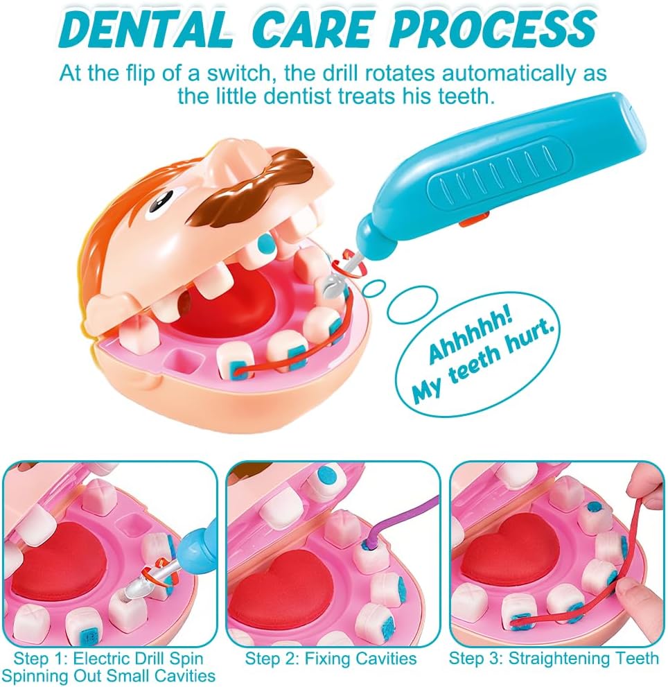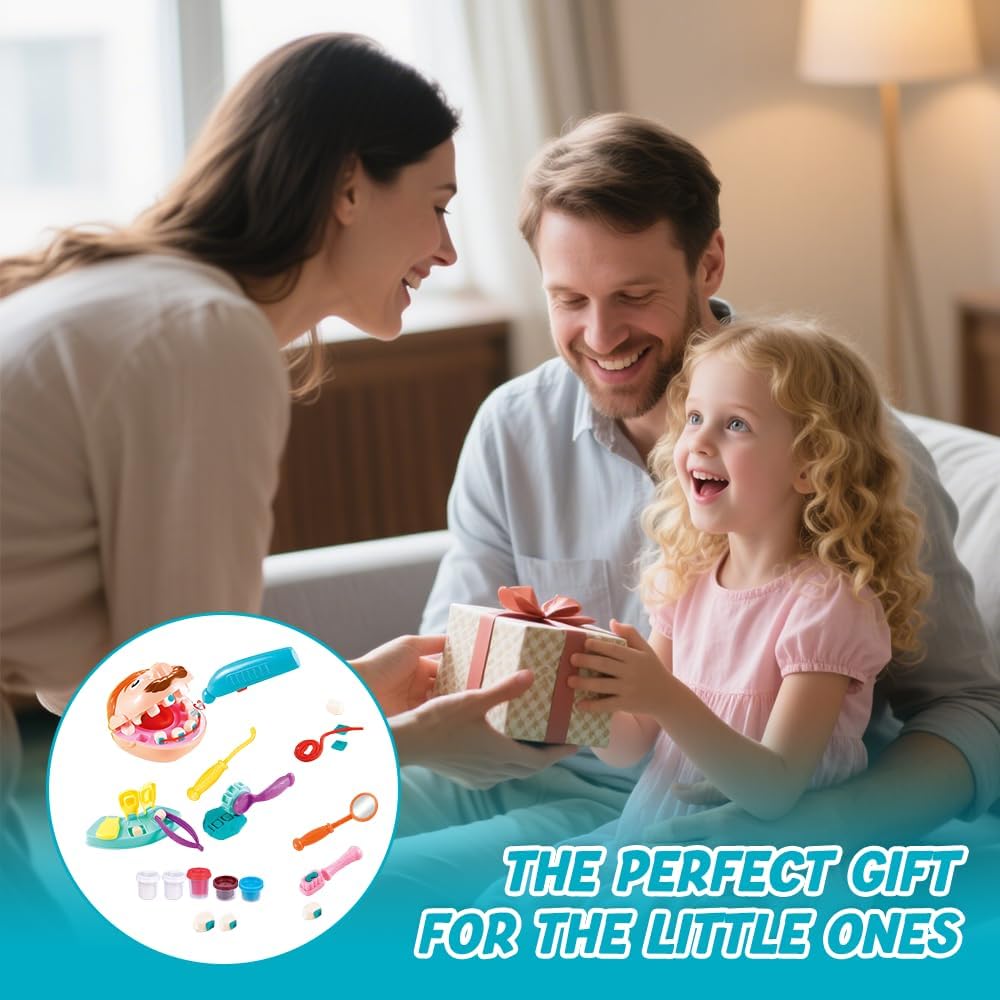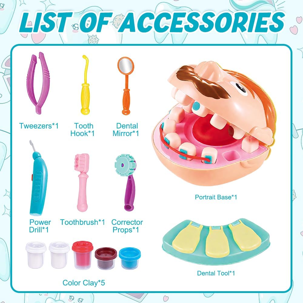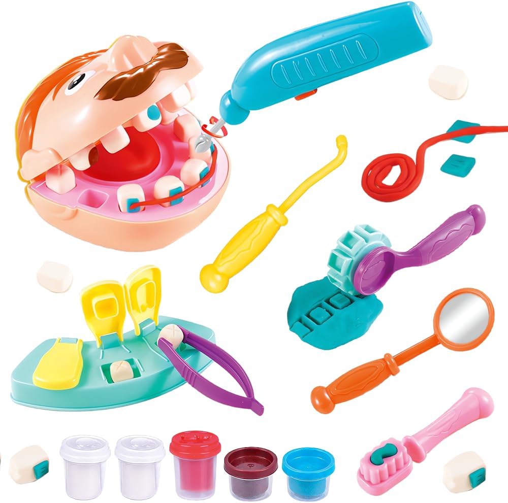 Set di giocattoli in plastilina: il set completo di giocattoli da dentista per bambini contiene vari strumenti odontoiatrici, tra cui 1 personaggio, 1 modello di dente, 1 trapano (richiede 1 batteria AA, non inclusa), 1 spazzolino da denti, 1 apparecchio ortodontico, 1 pinzetta, 1 uncino dentale, 1 specchietto dentale e 5 barattoli di plastilina colorata. Il set è completo, quindi non è necessario acquistare accessori aggiuntivi e i bambini possono immedesimarsi completamente nel ruolo del dentista Materiali di alta qualità: il giocattolo dentista in plastilina è realizzato principalmente in plastica, è di alta qualità, colorato e ha una superficie liscia senza sbavature, in modo da non ferire le mani dei bambini. La plastilina è composta da farina di frumento, sale e acqua pura, è atossica e sicura, non è grassa, non si attacca alle mani ed è riutilizzabile, quindi è perfetta per far giocare i bambini Per la salute orale: il giocattolo dentista per bambini simula la struttura della bocca e offre ai bambini una lezione di scienze vivace e interessante, in cui imparano a conoscere la struttura della bocca, imparano come mantenere la salute orale, comprendono l'importanza della protezione dei denti e sviluppano buone abitudini di igiene orale Giocattolo di ruolo: il giocattolo dentista in plastilina è un giocattolo di ruolo adatto ai bambini che offre loro un ambiente realistico per le cure dentistiche, in modo che possano superare la paura del dentista mentre giocano e non abbiano più paura di andare dal medico. È molto adatto per i giochi di ruolo in famiglia e può anche essere utilizzato come strumento didattico per l'educazione della prima infanzia Molteplici possibilità di gioco: il giocattolo dentista per bambini offre molteplici possibilità di gioco. I bambini aiutano i “pazienti” a esaminare i problemi della bocca, utilizzano plastilina colorata e stampini per riparare i denti, applicano apparecchi ortodontici e molto altro ancora. Il colorato set di plastilina può essere modellato in diverse forme, stimolando la creatività e la fantasia dei bambini, tenendoli occupati per ore e rendendo il gioco del dentista ancora più interessante Un regalo interessante: il set di plastilina dentista è il regalo perfetto per i bambini dai 3 anni in su. Genitori e bambini possono assumere insieme i ruoli del dentista e del “paziente”, consentendo ai bambini di conoscere la struttura della bocca e imparare a prendersi cura della propria salute orale. È un giocattolo educativo per bambini, un regalo creativo per ragazzi e ragazze e ideale come regalo per feste e compleanni