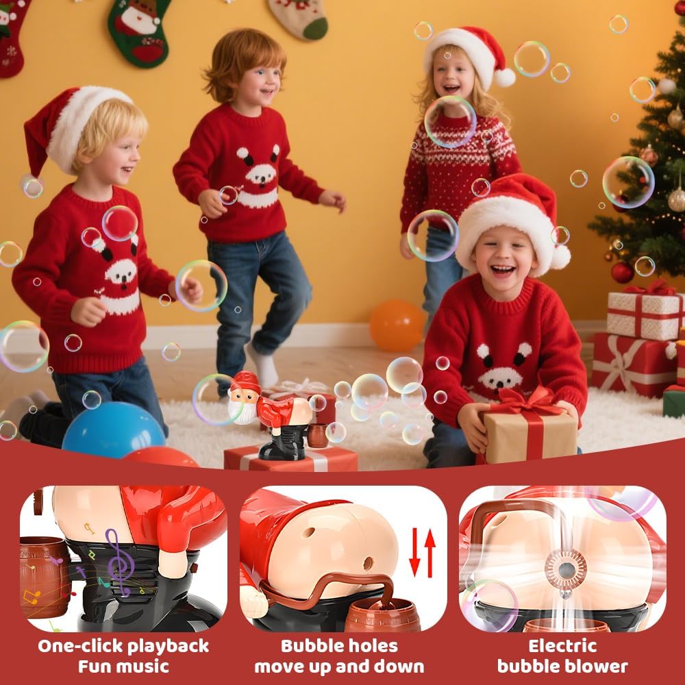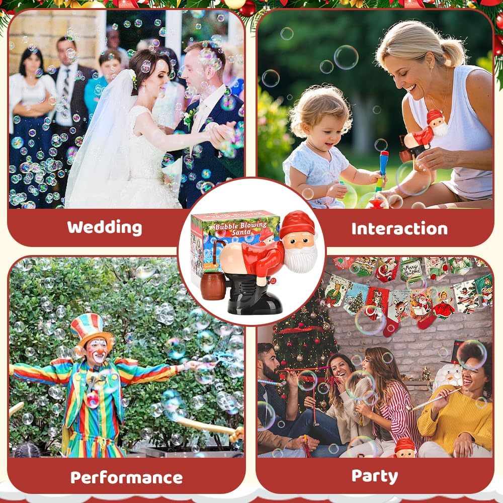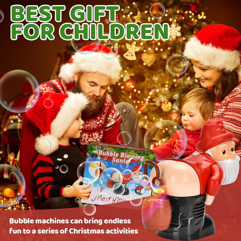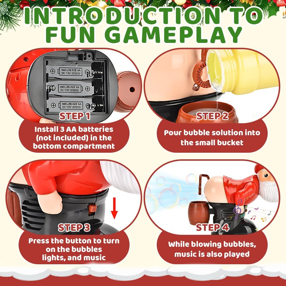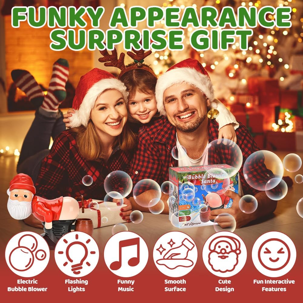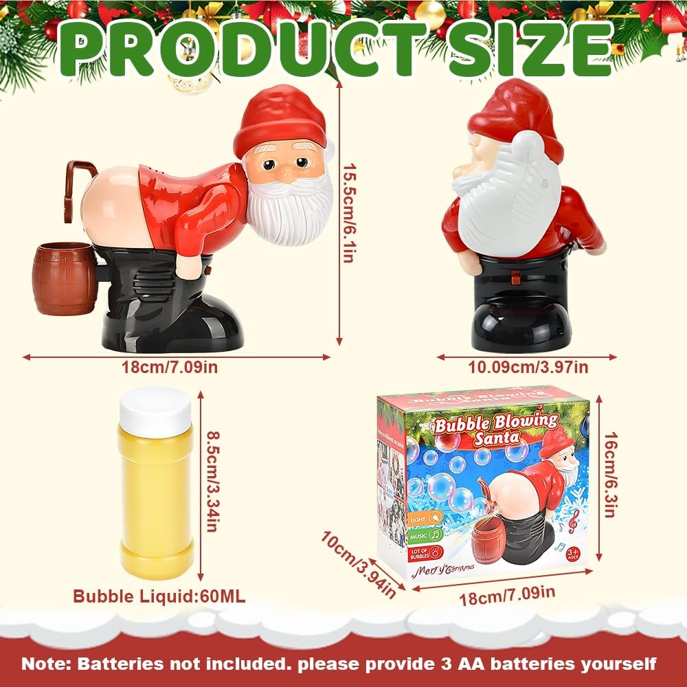 Soffiaggio automatico delle bolle: la macchina per bolle di sapone di Babbo Natale produce bolle in modo automatico e continuo. Basta inserire 3 batterie AA, riempire con la soluzione per bolle e premere il pulsante sotto Babbo Natale per produrre rapidamente un gran numero di bolle per un divertimento senza fine. Il soffiatore di bolle a tema natalizio crea un'atmosfera piacevole alle tue feste di Natale o altre festività Luci a LED e musica: il soffiatore di bolle è dotato di un esclusivo ugello a forma di WC e suoni realistici di scoreggia, insieme a luci a LED che creano bolle vivaci e accattivanti. È perfetto per creare un'atmosfera calda e festosa a Natale, riunioni di famiglia, feste di compleanno, eventi all'aperto e altro ancora Design unico: la macchina per bolle di sapone di Babbo Natale si ispira all'immagine di Babbo Natale, con un aspetto carino e colori vivaci che attireranno l'attenzione dei bambini e li porteranno gioia. La divertente macchina per bolle di sapone di Babbo Natale è realizzata in plastica di alta qualità con una superficie liscia e senza bordi ruvidi, garantendo durata e sicurezza. Può essere riutilizzata più volte senza causare danni Ampiamente utilizzato: la macchina per le bolle di sapone di Babbo Natale è compatta e portatile, facile da usare e può creare bolle colorate per migliorare l'atmosfera di qualsiasi evento. È perfetta per Natale, feste per bambini, feste di compleanno, attività all'aperto, ritrovi e altre occasioni per portare gioia a tutti Regalo divertente: la macchina per le bolle di sapone di Babbo Natale è originale e divertente, il che la rende il regalo perfetto per gli amanti degli scherzi, gli amanti delle novità e i bambini che amano divertirsi. Può anche essere regalata ad amici e parenti per sorprenderli e regalare loro gioia