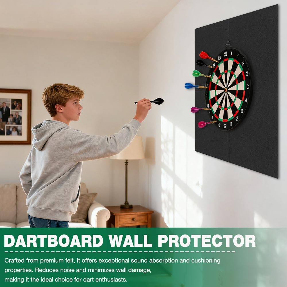 Facile installazione: non sono necessari fori o strumenti complicati. Basta staccare la pellicola protettiva sul retro della protezione da parete del bersaglio per freccette, posizionare il bersaglio esattamente nella posizione desiderata e premere saldamente in posizione. L'installazione richiede meno di un minuto, risparmiando tempo e fatica Ampia protezione: la protezione da parete per bersaglio include 4 pellicole protettive quadrate individuali da 60 x 60 cm per una copertura generale generosa. Questi possono essere disposti in modo flessibile intorno al bersaglio per creare un'efficace zona di protezione e proteggere completamente la parete da forature e graffi causati da lanci mancati Feltro di alta qualità: realizzato in feltro nero denso, questa protezione da parete per freccette non solo cattura efficacemente le freccette, impedendo loro di opacizzare o danneggiare la parete dura, ma la sua struttura in fibra morbida assorbe anche l'impatto delle freccette, riducendo significativamente il rumore e le interruzioni per la tua famiglia Doppia protezione per pareti e freccette: questa protezione da parete protegge in modo affidabile la parete, assorbendo l'impatto di lanci accidentali mancati e mantenendo intatta la superficie. La superficie morbida protegge anche le punte delle freccette, riducendo l'usura da urti con oggetti duri e prolungandone la durata Semplice e bello: la protezione da parete per bersaglio per freccette dal colore nero classico e dalla superficie morbida opaca si fondono discretamente e naturalmente nella maggior parte degli ambienti domestici o in ufficio. Non è solo una protezione pratica, ma preserva anche l'estetica generale della tua stanza ed evita la sensazione di ingombrante spesso associata alla protezione delle pareti