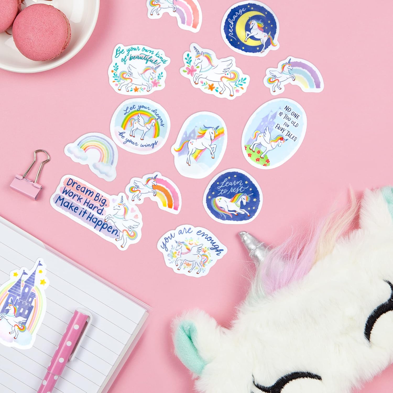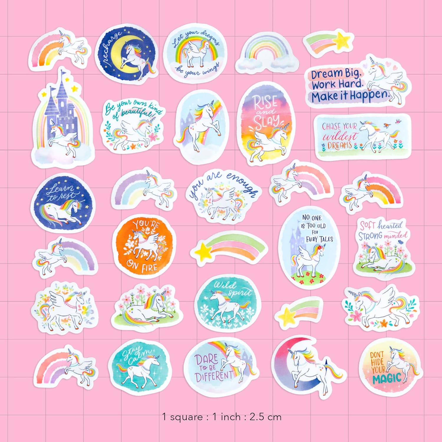 ADESIVI GIOCOSI E FAVOLOSI UNICORNO E ARCOBALENO con affermazioni motivanti e positive. Queste citazioni ispiratrici sono state accuratamente selezionate per incoraggiarti a sognare in grande ma anche per ricordarti di rilassarti e prenderti cura della tua salute mentale. Ideale per tutti gli appassionati di creature mitiche e unicorni - non solo per bambini e adolescenti, ma anche per adulti che vogliono ricordare la propria infanzia con un tocco di nostalgia. ADESIVI FUSTELLATI DA 31 PEZZI offrono una bellissima selezione di adesivi con unicorno da favola, illustrati a mano. Questi piccoli adesivi decorativi si adattano perfettamente al tuo diario o agenda. 11 pezzi sono alti circa 2-2,5 pollici, mentre 20 adesivi misurano circa 1-1,5 pollici. 15 adesivi contengono citazioni ispiratrici, mentre il resto presenta unicorni e arcobaleni giocosi che rappresentano il coraggio e la diversità. IMPERMEABILE, FACILE DA STACCARE E DUREVOLE. Il materiale impermeabile e antistrappo rende i nostri adesivi particolarmente durevoli e resistenti agli influssi esterni. La laminazione opaca garantisce una superficie non lucida. Questi adesivi sono perfetti per laptop, tablet e bottiglie d'acqua. Si consiglia il lavaggio a mano poiché le alte temperature in lavastoviglie possono compromettere rapidamente la forza adesiva. Ideale anche per sigillare regali e buste. UN'ESTETICA FAVOLOSA INCANTEVOLE E AFFASCINANTE. Il mix di toni pastello caldi e freddi crea un'atmosfera calmante, rilassante ma allo stesso tempo energica. Ti invita a fermarti, a sognare e a fissare nuovi obiettivi. Il design giocoso evoca sentimenti nostalgici e offre un fascino creativo unico per gli adulti che mantengono il loro amore per gli unicorni anche in età adulta. CONDIVIDI BUONE VIBES E PERSEGUITE LA TUA PASSIONE. Questi adesivi sono perfetti per l'inserimento nel diario e come regali per gli amici. Il carattere scritto a mano trasmette autenticità e appare particolarmente naturale ed emozionante nel mondo digitale. Il set include citazioni incoraggianti come "Sei in fiamme" e detti motivazionali come "Rise and Slay" che ispirano entusiasmo, passione e senso di avventura. Il design dell'unicorno arcobaleno ispira a vivere "Dare to be Different" e a celebrare la diversità.