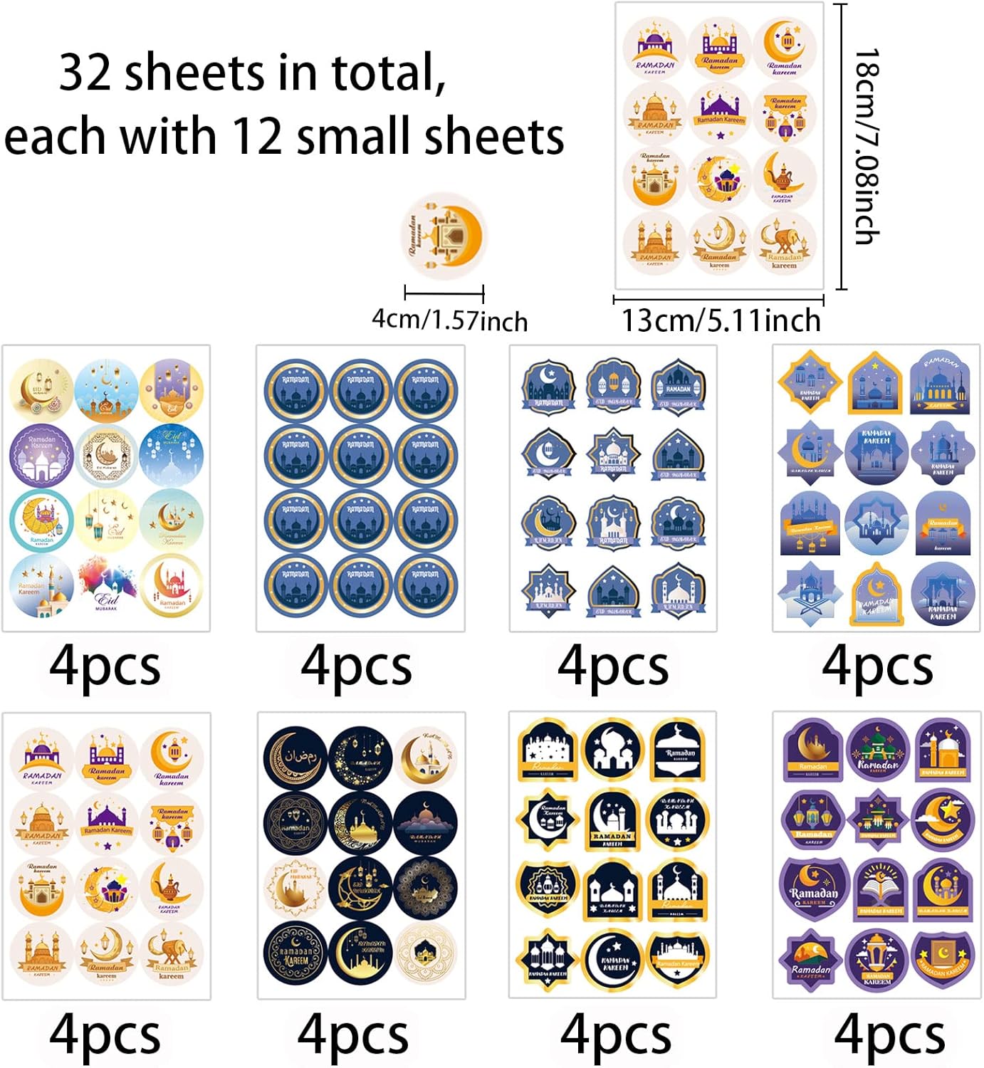 Adesivo Ramadan: adesivo Ramadan con gli elementi classici del Ramadan, adatto per le decorazioni e l'atmosfera del festival durante l'Eid Mubarak. Alta qualità: Eid Mubarak è realizzato con carta autoadesiva di alta qualità, altamente viscosa, che non è facile da rompere. Questi adesivi sono durevoli. Gli adesivi sono sicuri per i bambini. Contenuto: 32 fogli di adesivi Ramadan per un totale di 384 pezzi. Il singolo adesivo Ramadan Kareem ha un diametro di circa 4 cm. Dimensioni perfette e ideali per attaccare regali, borse, scatole di caramelle e lettere. Decorazioni Eid Mubarak: adesivi per sacchetti regalo - Adatti per decorare buste sigillate, scatole regalo, biglietti di auguri, pacchetti di dessert, cartoline, regali, coni carini. Ampio utilizzo: adatto per feste a tema Eid Mubarak, confezioni regalo, eventi commemorativi e celebrazioni, adorabili accessori per feste per dare il benvenuto a Eid Mubarak. Regali perfetti per condividere l'atmosfera festosa con le persone intorno a te.