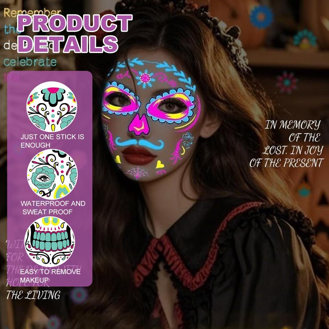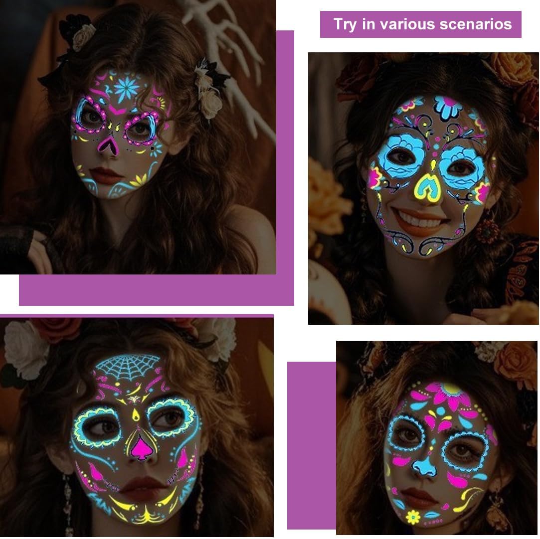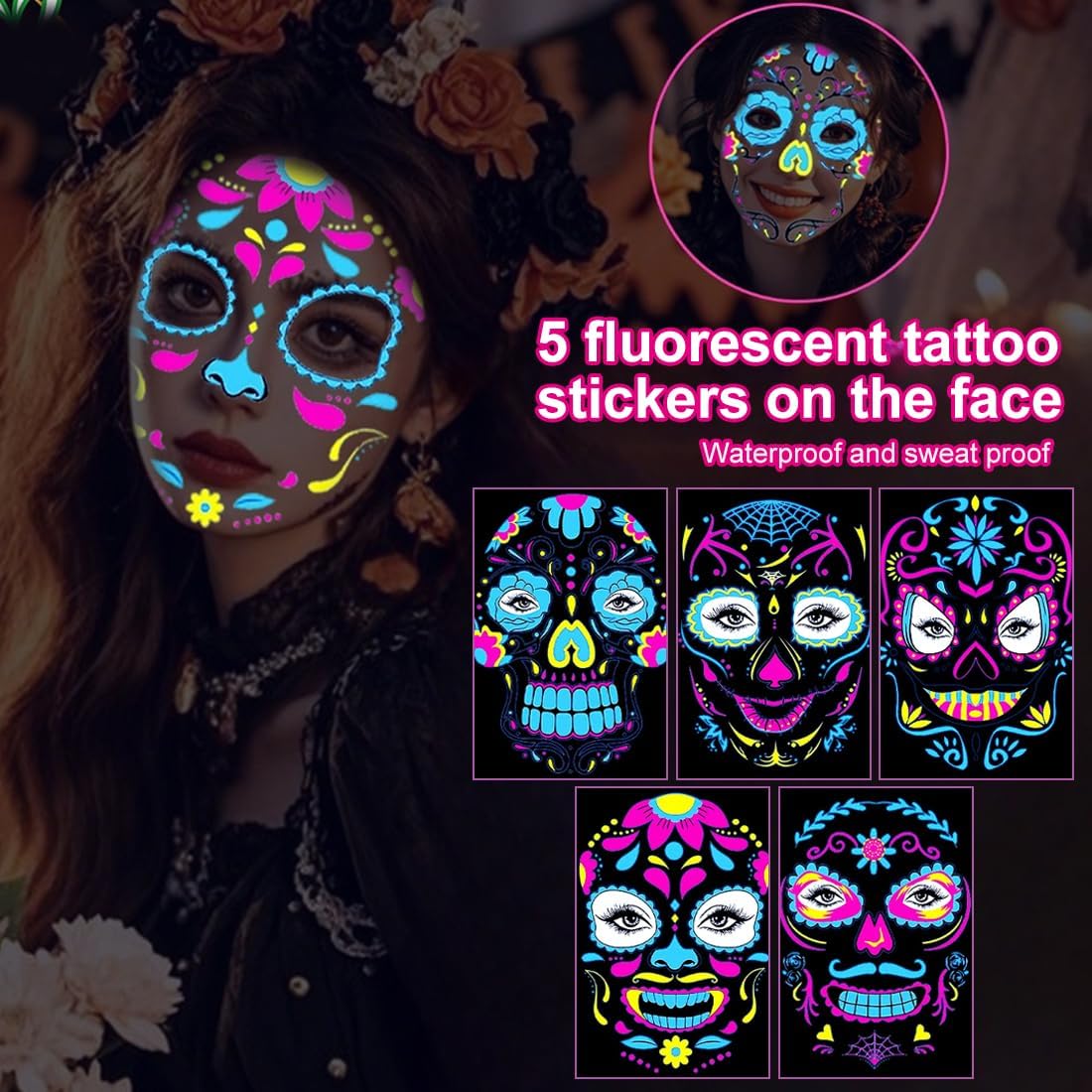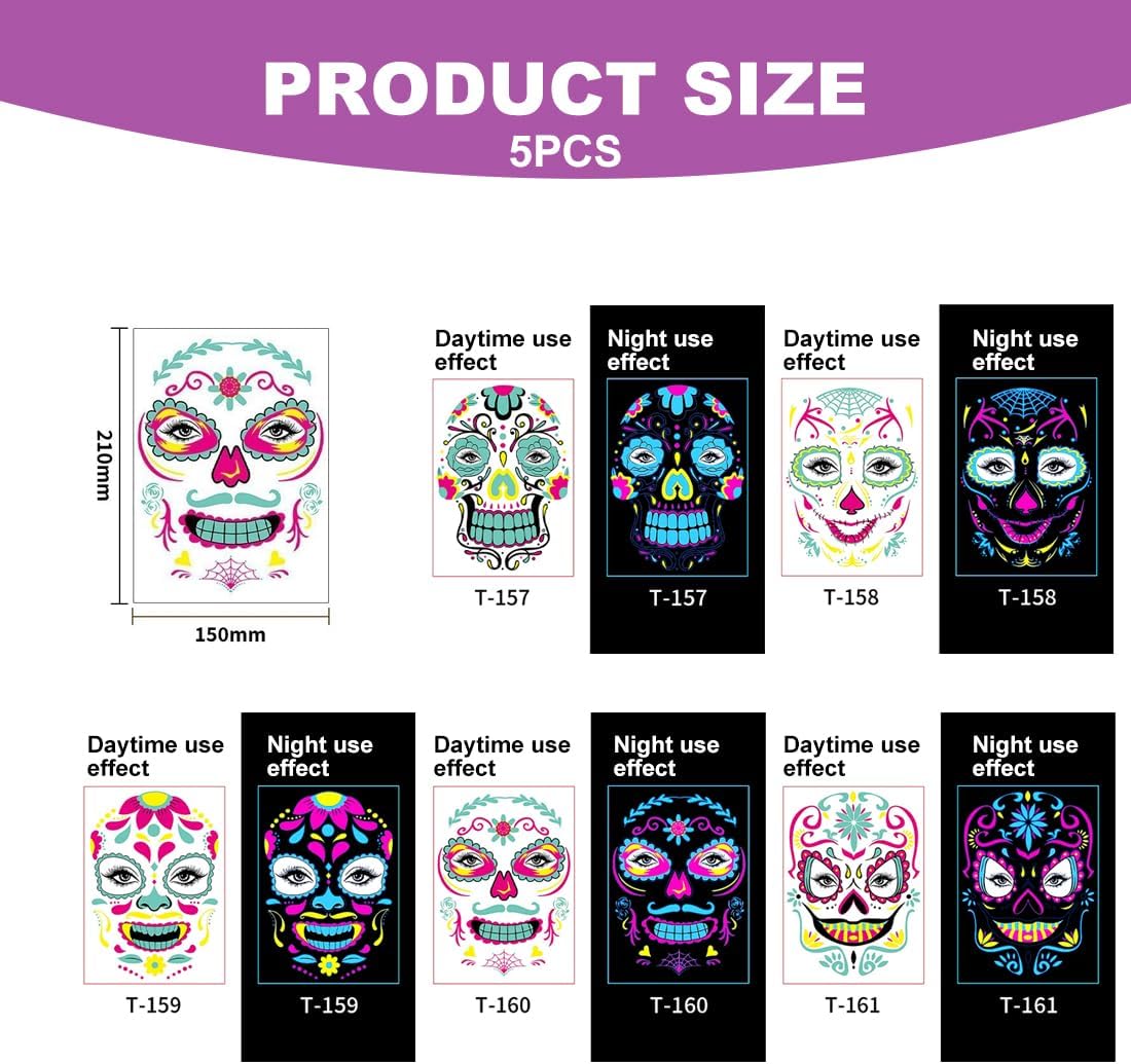 Motivi Colorati di Giorno, Fluorescenza Stylish sotto Luce UV, Atmosfera Unica 5 Adesivi Tatuaggio, Soddisfa Diversi Bisogni come Decorazione, Condivisione, ecc. Elementi Classici di Halloween come Teschio usw., Adatto allo Stile Festivo Colla Semplice, Si Adatta Facilmente alla Pelle, Facile da Pulire senza Residuo Può essere Combinato, Abbinato Libera, Creare Outfit di Halloween Esclusivi