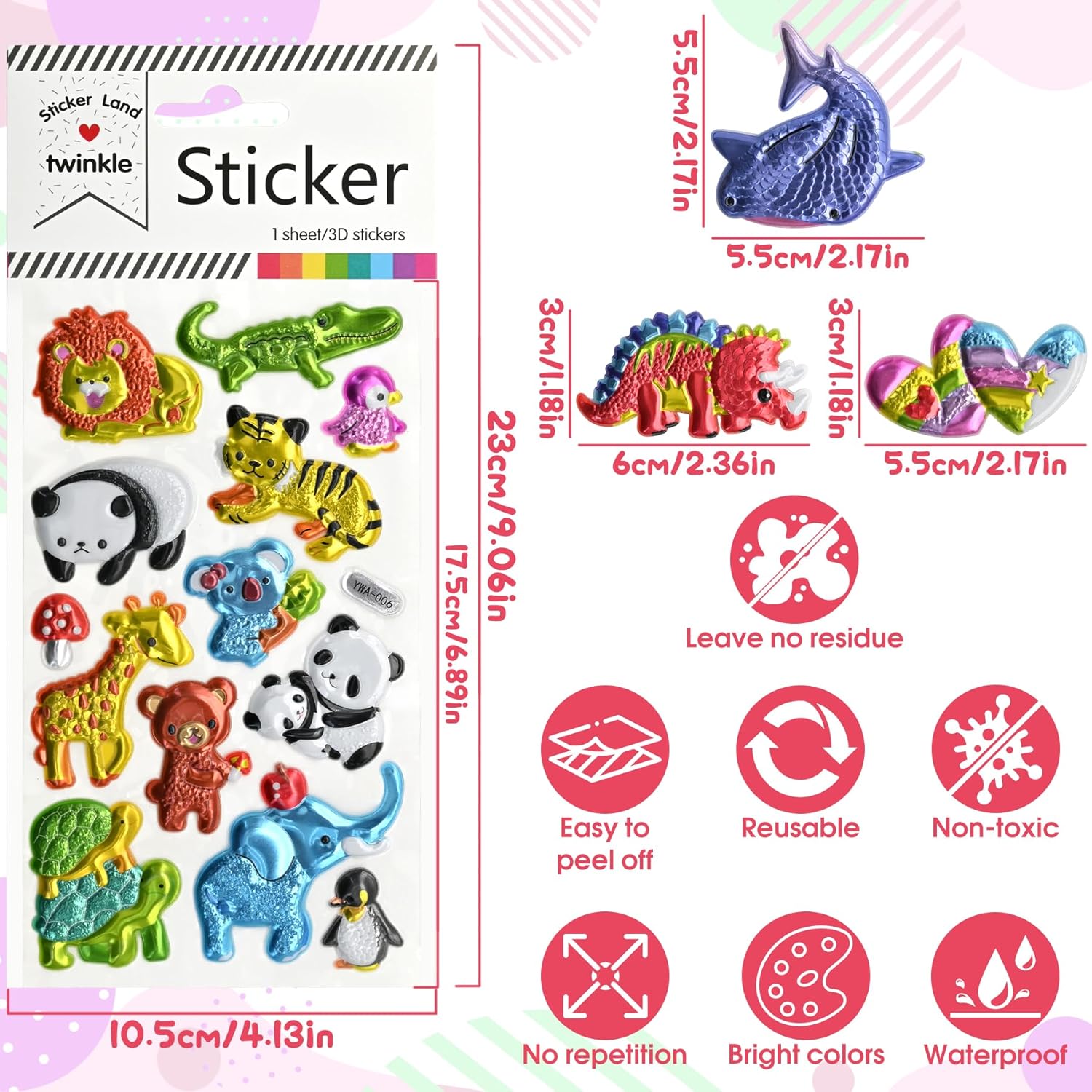 【Cosa ottieni?】Riceverai 8 adesivi scintillanti con animali. Abbiamo utilizzato disegni colorati e i motivi sono: amore, dinosauro, oceano, panda, Hawaii, foca, astronauta. Questo pacchetto di adesivi è adatto a ragazzi e ragazze. Gli adesivi glitterati creano un'atmosfera da favola e ispirano i bambini a essere creativi. 【Colori vivaci】 I nostri adesivi sono progettati con colori unici e luminosi, che rendono più facile per i bambini riconoscere i colori e attirare l'attenzione dei bambini. 【Materiale di alta qualità】 Utilizziamo materiali adesivi di alta qualità con eccellente resistenza all'usura, all'acqua e all'olio. La vivida immagine 3D è facile da strappare e incollare e fornisce una sorpresa sorprendente. 【Alta qualità】 Gli adesivi con animali glitterati sono fortemente autoadesivi, impermeabili e non lasciano residui. Sono facili da attaccare senza colla aggiuntiva. I bordi sono arrotondati e garantiscono un'esperienza di gioco sicura. 【Multiuso】Gli adesivi con animali glitterati sono adatti per libri, album, bottiglie di vetro, album di ritagli, scatole regalo, biglietti d'invito, agende, quaderni, diari, calendari e altre superfici lisce. Vetrate, armadietti, ecc. a casa, consentendo ai bambini di creare opere uniche. Che si tratti di un regalo di compleanno per bambini o di un regalo per una festa, è una sorpresa per i bambini.
