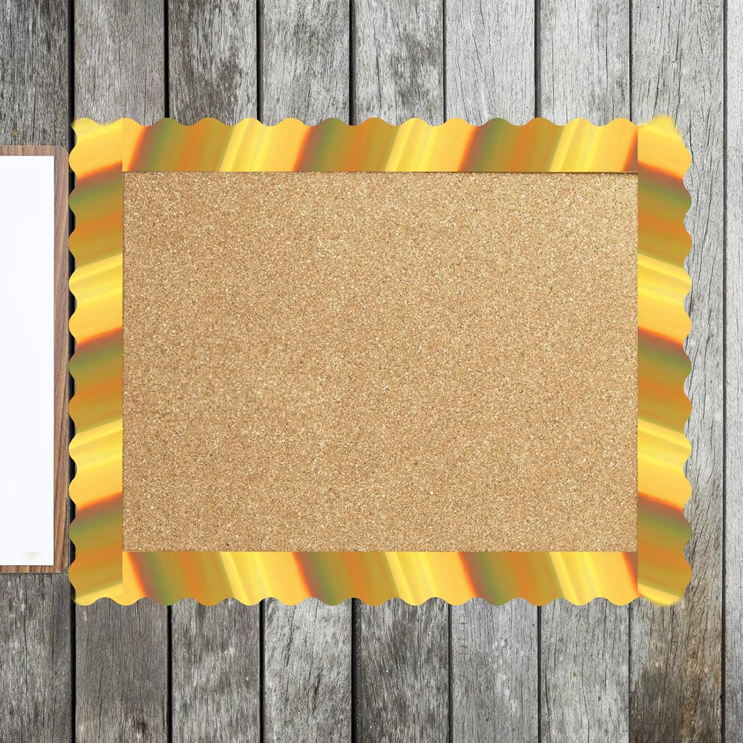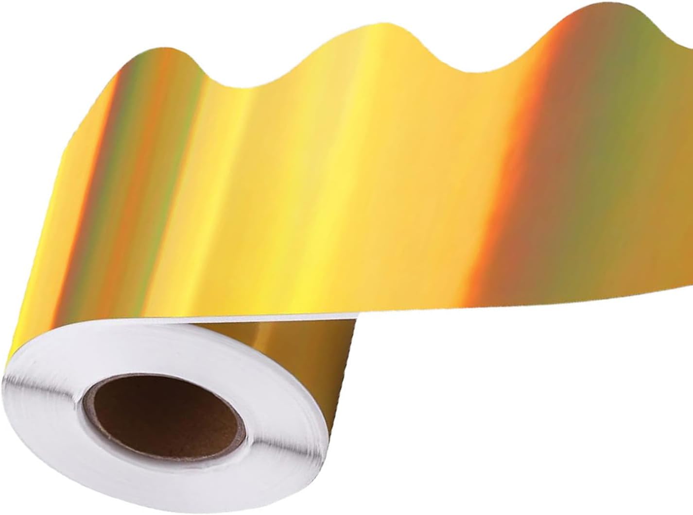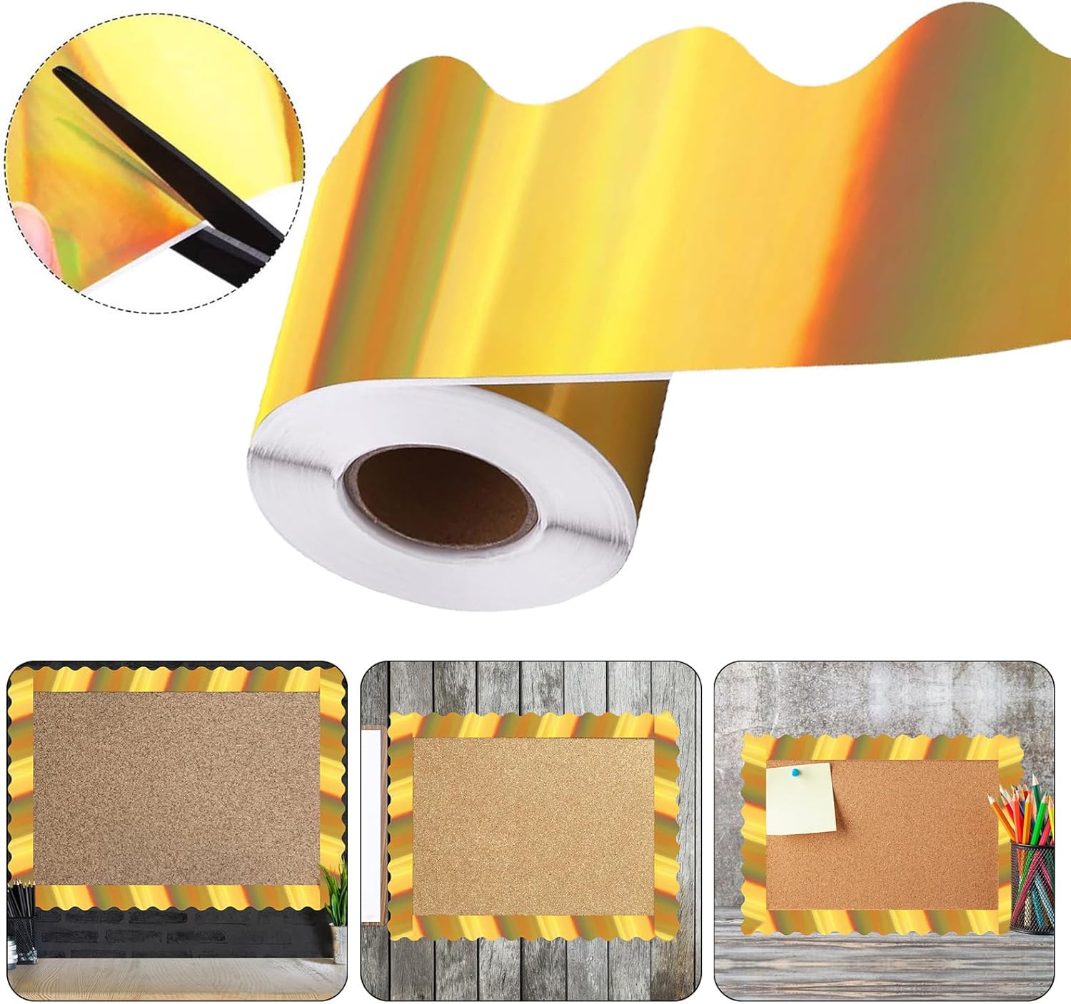 A differenza delle rigide linee rette, il delicato bordo presenta linee flessibili, creano un fascino elegante. È possibile tagliare la lunghezza in base alle proprie esigenze; facile da mantenere e non si piega facilmente. Il rivestimento della bacheca d'oro è adatto per decorare bacheche nella stanza dei bambini e nell'ufficio della classe. L'uso del bordo a forma di ventaglio per la tua classe è una bella opzione, dando un aspetto accattivante per il bordo del bollettino scolastico. I bordi della bacheca d'oro possono essere utilizzati per allineare bacheche, centri di classe.