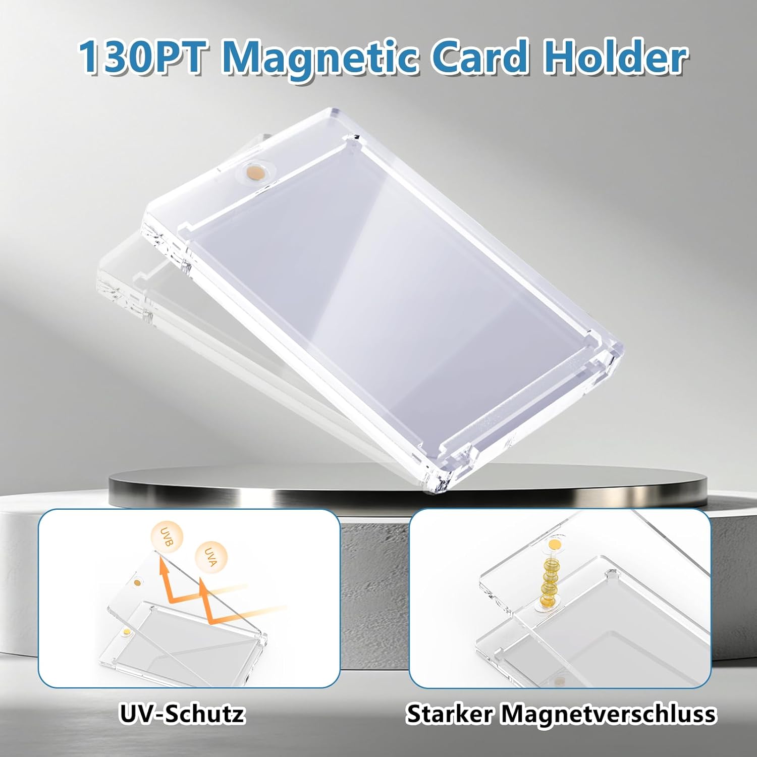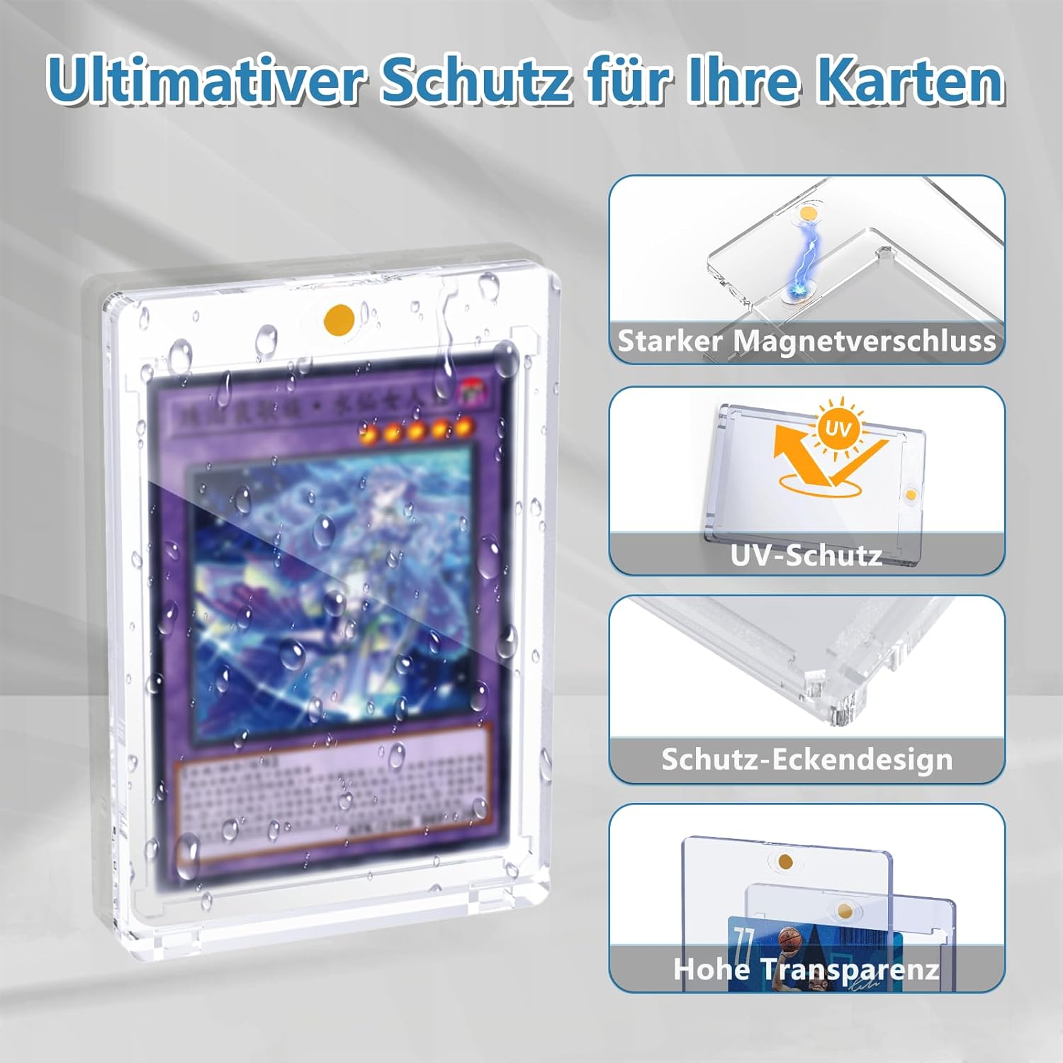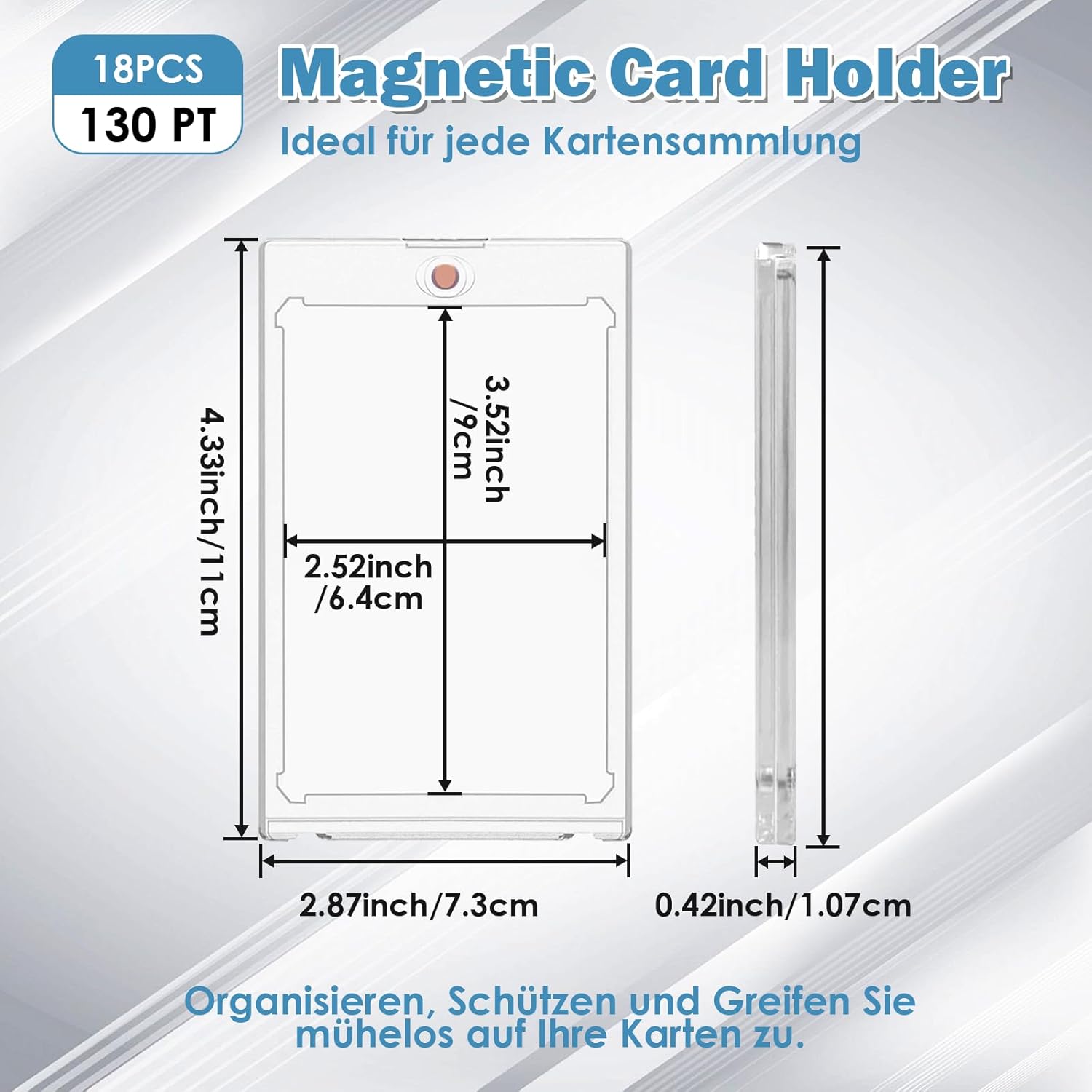 130 PT Magnetic Card Holder: le nostre custodie magnetiche da 130pt per carte collezionabili sono disponibili in confezione da 18 e offrono una visione cristallina delle vostre carte da collezione. Ogni custodia ha una dimensione esterna di 7,3 × 11,0 cm e una dimensione interna di 6,4 × 8,9 cm, con un robusto spessore interno a 130 punti. Perfetto per carte sportive, baseball, Football, Basket e Trading Cards, nonché carte da gioco, carte da hockey e Magic: The Gathering. Protezione di alta qualità resistente ai raggi UV: le nostre custodie per carte magnetiche da 130pt sono realizzate in materiale resistente ai raggi UV di alta qualità, che offre una protezione completa per le tue Non dovrete più preoccuparvi di scolorimento, graffi o usura. Mantieni le tue carte al sicuro da piegature, abrasioni o pieghe con questa robusta custodia protettiva per carte da baseball Sicurezza a lungo termine: le nostre custodie One Card Touch dispongono di una forte chiusura magnetica che offre una migliore protezione per le tue carte. Impediscono piegature e tagli. Realizzate in materiale con caricamento superiore 130 pt, queste custodie sono abbastanza resistenti per mantenere le tue carte al sicuro a lungo termine. Quando si tratta di proteggere le tue preziose carte, questa è la scelta migliore per la sicurezza e la tranquillità! Design angolare tagliato a diamante: le nostre custodie per carte magnetiche hanno un design unico con angoli tagliati a diamante che protegge i quattro angoli delle tue carte. Questa protezione aggiuntiva previene i danni da urti e assicura che le tue preziose carte rimangano in perfette condizioni. Gli angoli diamantati mantengono la stabilità e la forma dei biglietti, rendendoli come nuovi nel corso del tempo! Regalo perfetto: queste custodie per carte magnetiche sono un regalo ideale per collezionisti e appassionati di carte, che si tratti di compleanni, vacanze o occasioni speciali! Sorprendi la tua famiglia e i tuoi amici con un regalo elegante e di alta qualità che useranno quotidianamente.