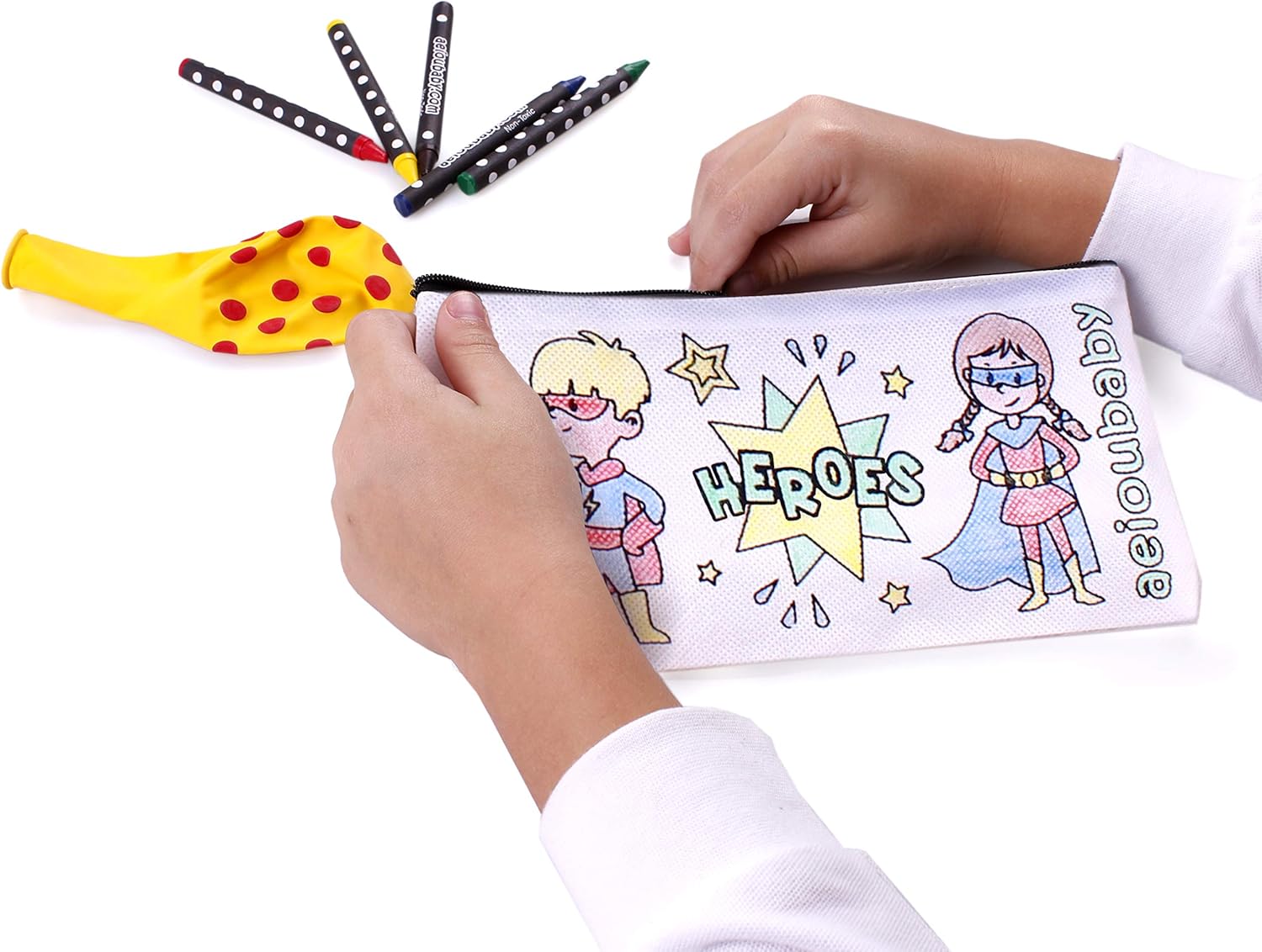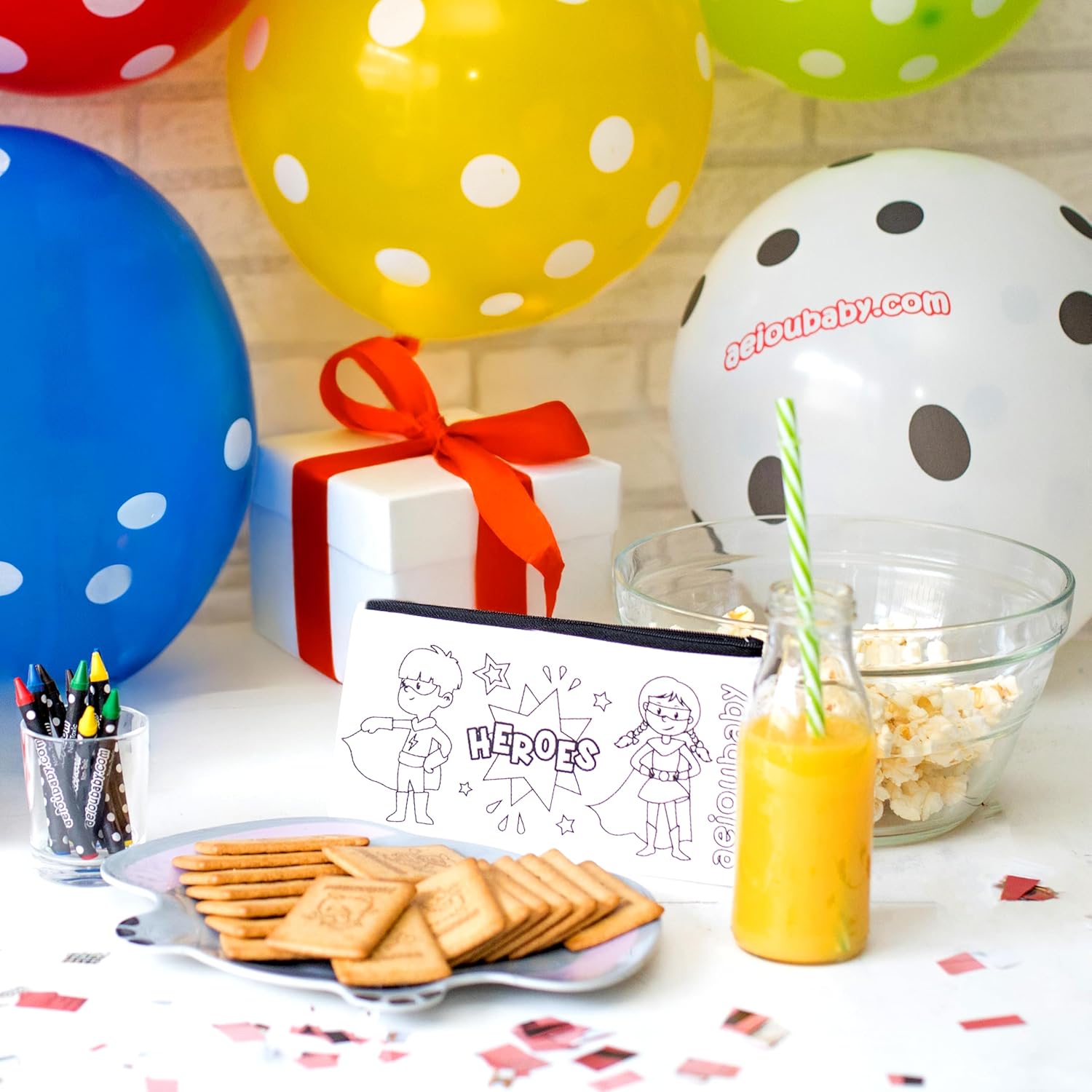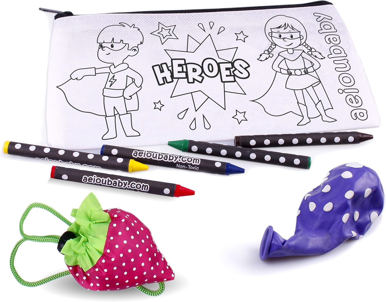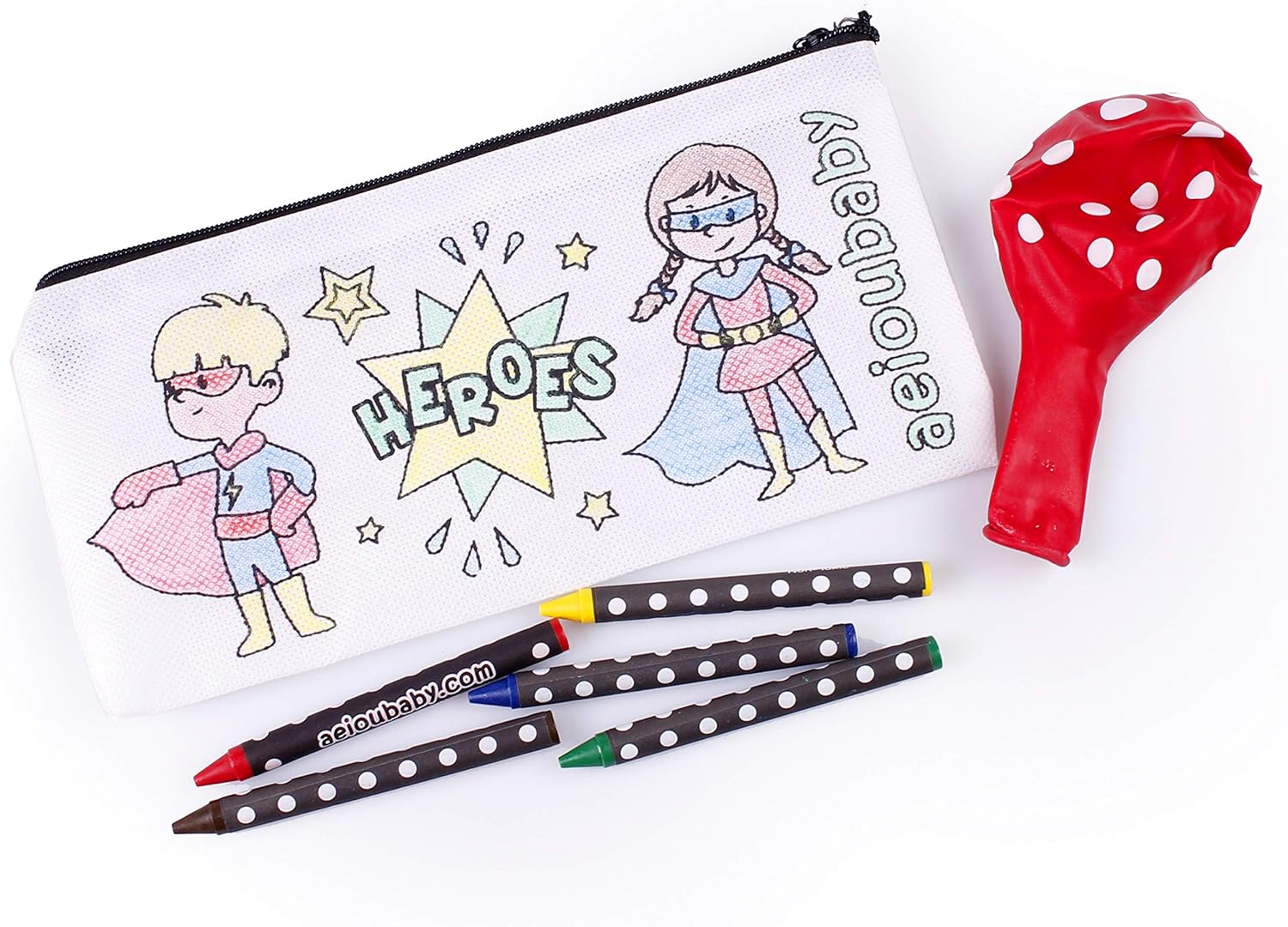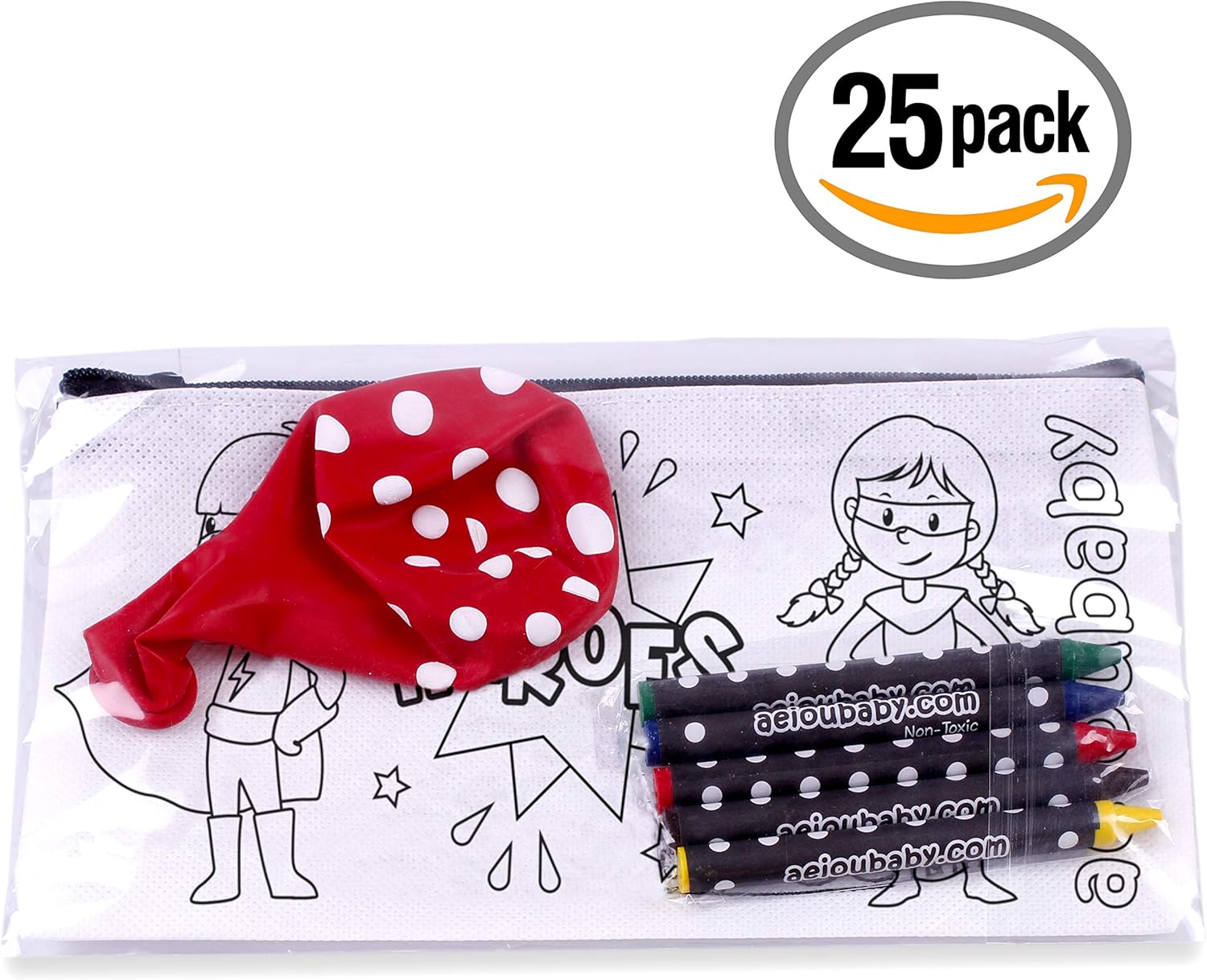 CONFEZIONE RISPARMIO · Set da 25 astucci con 5 colori a cera tondi di 5 colori diversi e un palloncino. Astucci in materiale Non-Woven. SET SINGOLO · Ogni astuccio è venduto con una bustina singola con 5 colori a cera adatti per i più piccoli (non tossici) e un palloncino. IDEALE COME REGALO · Per i compleanni dei bambini, feste, eventi. Presentato in una bella borsetta di aeioubaby. SVILUPPA L'IMMAGINAZIONE · Ogni bambino avrà il suo astuccio personalizzato. Idea didattica e originale. GARANZIA TOTALE DI RIMBORSO! · Siamo così sicuri della qualità dei nostri prodotti che offriamo una garanzia di rimborso al 100%, senza fare domande. Non hai nulla da perdere!