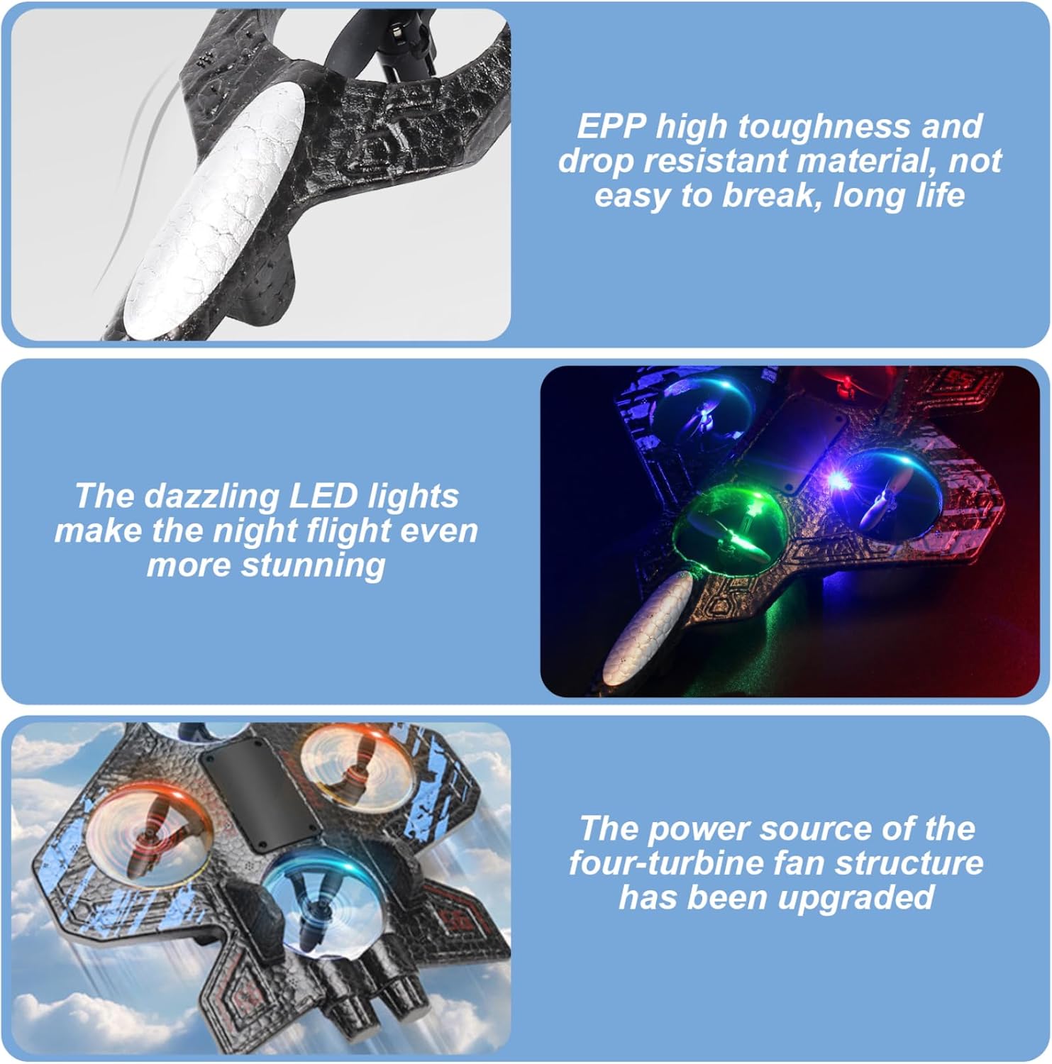 Controlli intuitivi: progettati con semplici telecomandi ideali per bambini di età compresa tra 8 e 12 anni, questo aereo di controllo remoto è facile da operare, incoraggiando la fiducia e migliorando le capacità motorie pregiate attraverso il gioco coinvolgente. Regalo perfetto per bambini: combinare un giocattolo per aereo e un elicottero RC in uno, questo aereo di controllo remoto è un'ottima scelta regalo per ragazzi e bambini che amano i droni e i giocattoli volanti, scatenando la creatività e l'attività all'aperto. Flip interattivo a 360 °: l'aereo RC presenta un flip e giri dinamici a 360 gradi, fornendo capacità di eccitazione e acrobazie che affascono i bambini e i principianti, rendendo ogni volo elettrizzante e divertente. Design impermeabile: costruito per resistere agli incidenti e all'esposizione all'acqua, questo elicottero RC resistente agli urti e impermeabile garantisce un divertimento duraturo senza preoccupazioni, perfetto per le avventure all'aperto in varie condizioni meteorologiche. Vibranti luci a LED: dotato di luci a LED brillanti, questo piano di controllo telecomando migliora la visibilità durante i voli del tramonto o notturni, creando un display abbagliante e estendendo il tempo di gioco per i bambini.