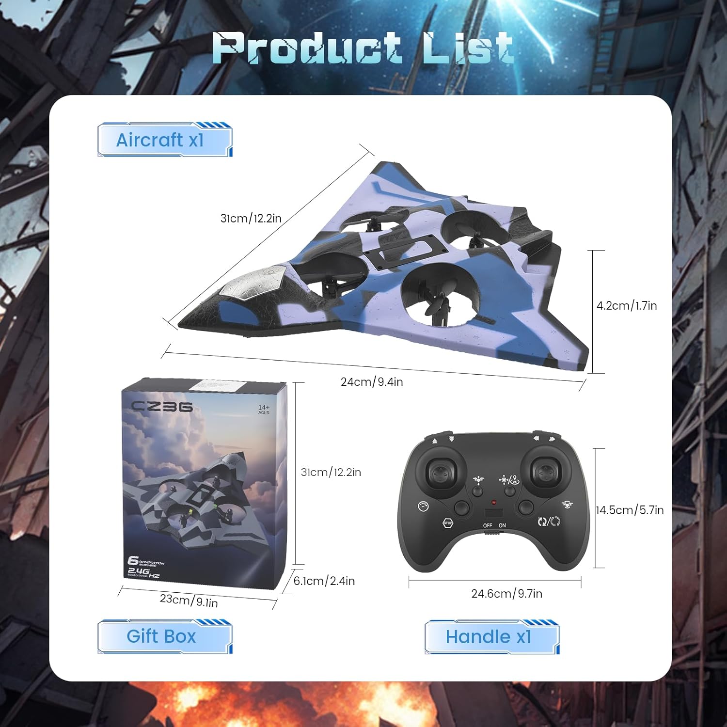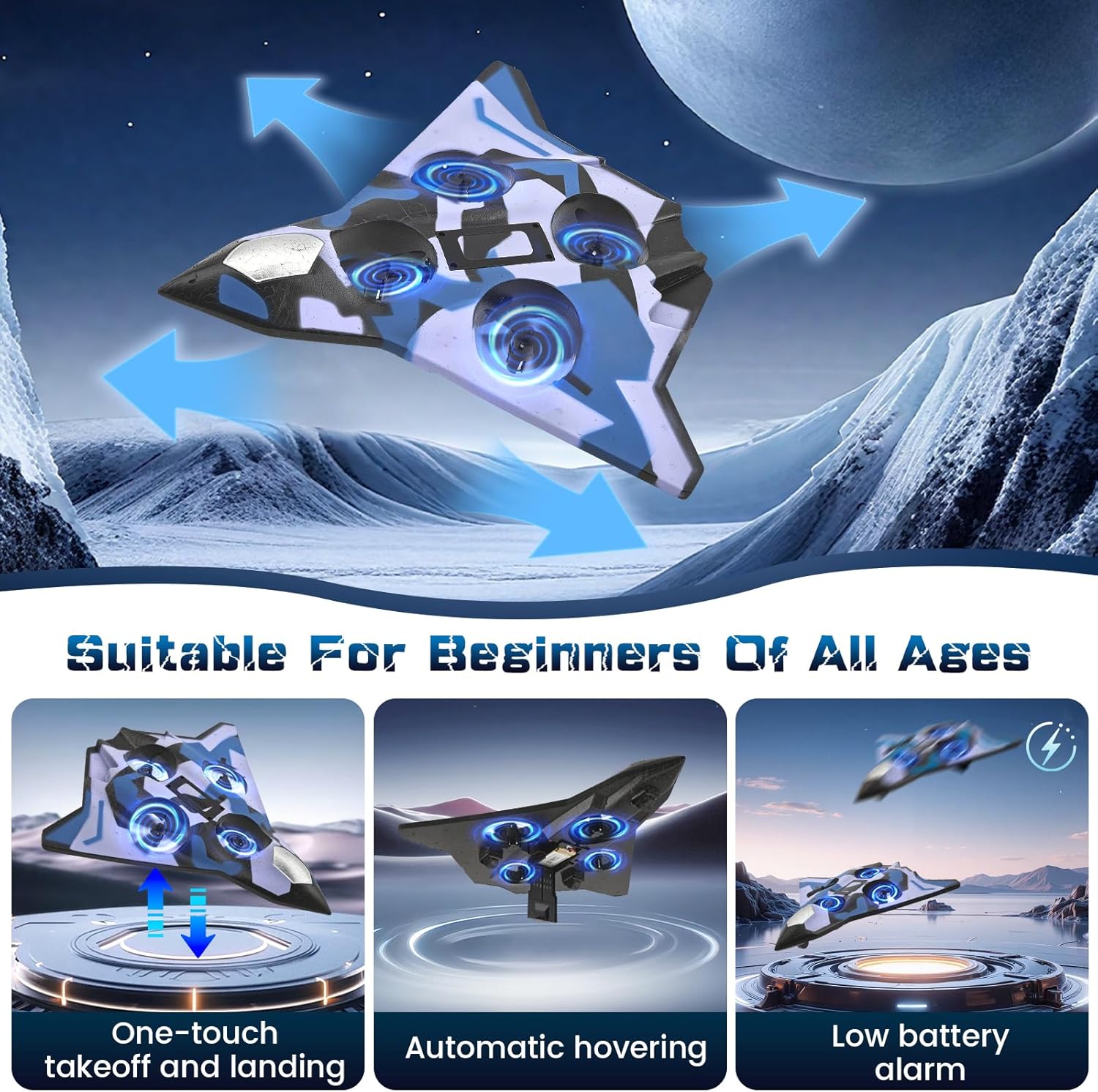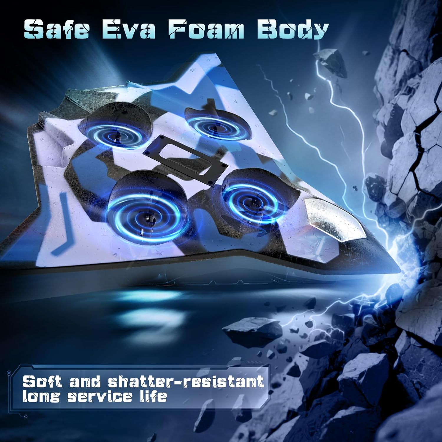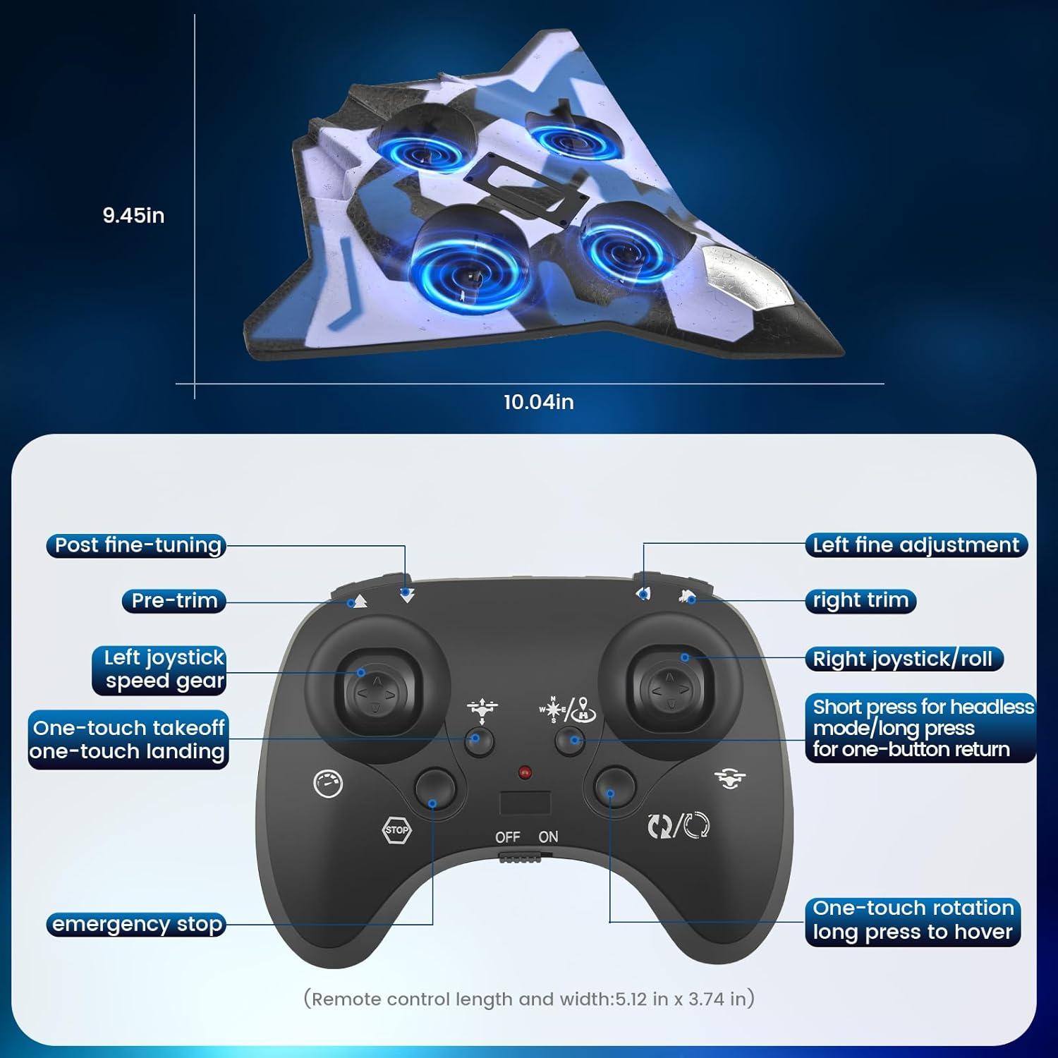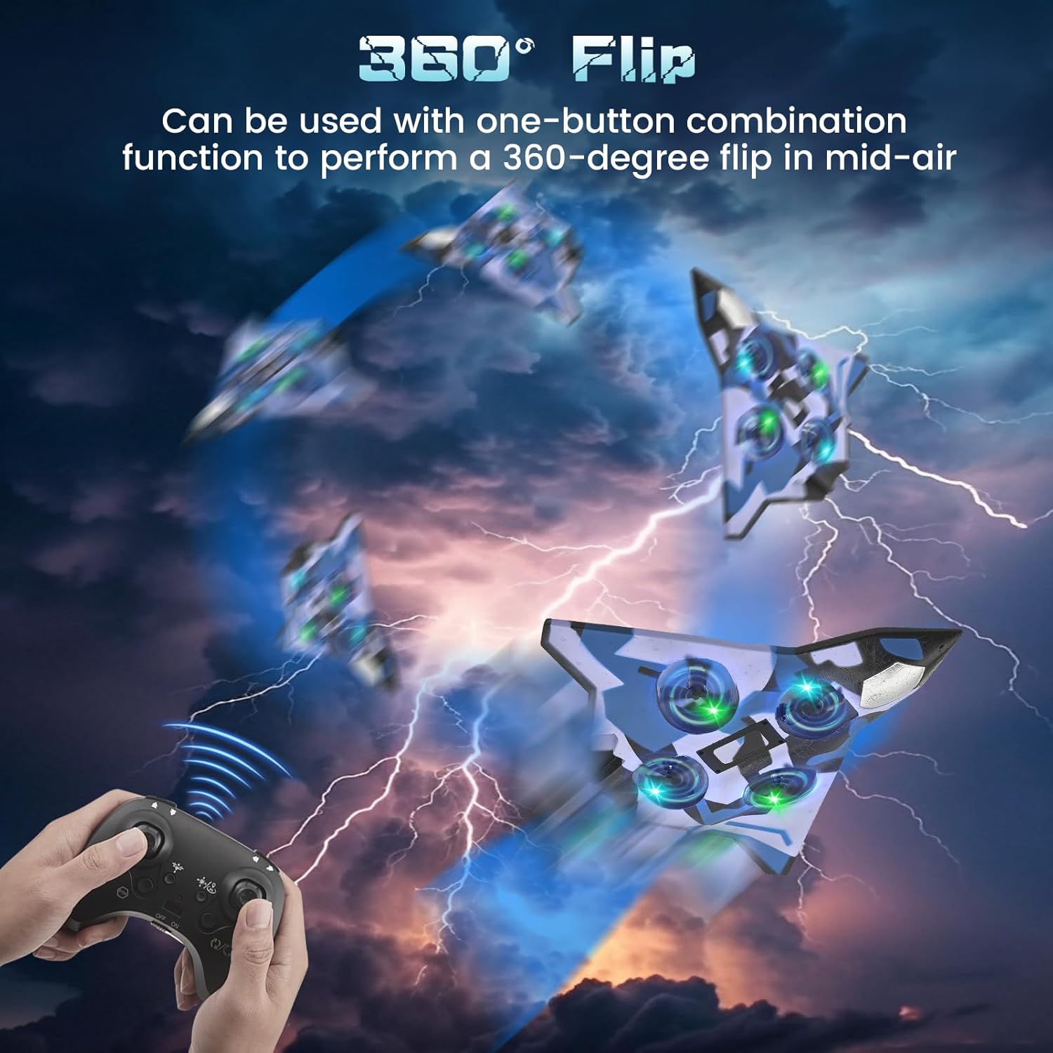 Telecomando da 2,4 GHz: con l'aereo telecomandato ogni partenza. Con un semplice pulsante il drone si avvia o atterra in modo sicuro. La modalità headless e la regolazione dell'altezza garantiscono un controllo intuitivo. Perfetto per bambini e adulti che cercano un aereo RC facile da volare, sia nel parco che in giardino. Spettacolari manovre di volo: vivi splendide alette a 360° e mulinelli acrobatici! Il sensore di gravità consente rotazioni audaci semplicemente inclinando il trasmettitore. Tre livelli di velocità offrono esperienze ricche di azione. Volare questo aereo da remoto significa divertimento illimitato per grandi e piccini. Costruzione durevole e sicura: realizzato in robusto materiale EPP, l'aereo RC resiste facilmente a piccole cadute. La protezione dell'elica integrata protegge ulteriormente. In questo modo l'aereo telecomandato può essere utilizzato anche all'interno. Estremamente resistente e ideale per un uso frequente. Accattivanti voli notturni: le luci a LED integrate permettono all'aereo di illuminare elegantemente di notte. Attrae piste luminose nel cielo di notte. Perfetto per avventure al crepuscolo o in campeggio. L'aereo RC diventa così una vera attrazione e prolunga il tempo di gioco. Pronta all'inizio: nessun fastidioso assemblaggio! Questo aereo telecomandato è pronto per l'uso. Basta caricare la batteria e iniziare a divertirsi in volo. Perfetto come regalo per ogni occasione. Il set completo contiene tutto il necessario per un divertimento immediato: un aereo RC ideale per i principianti.