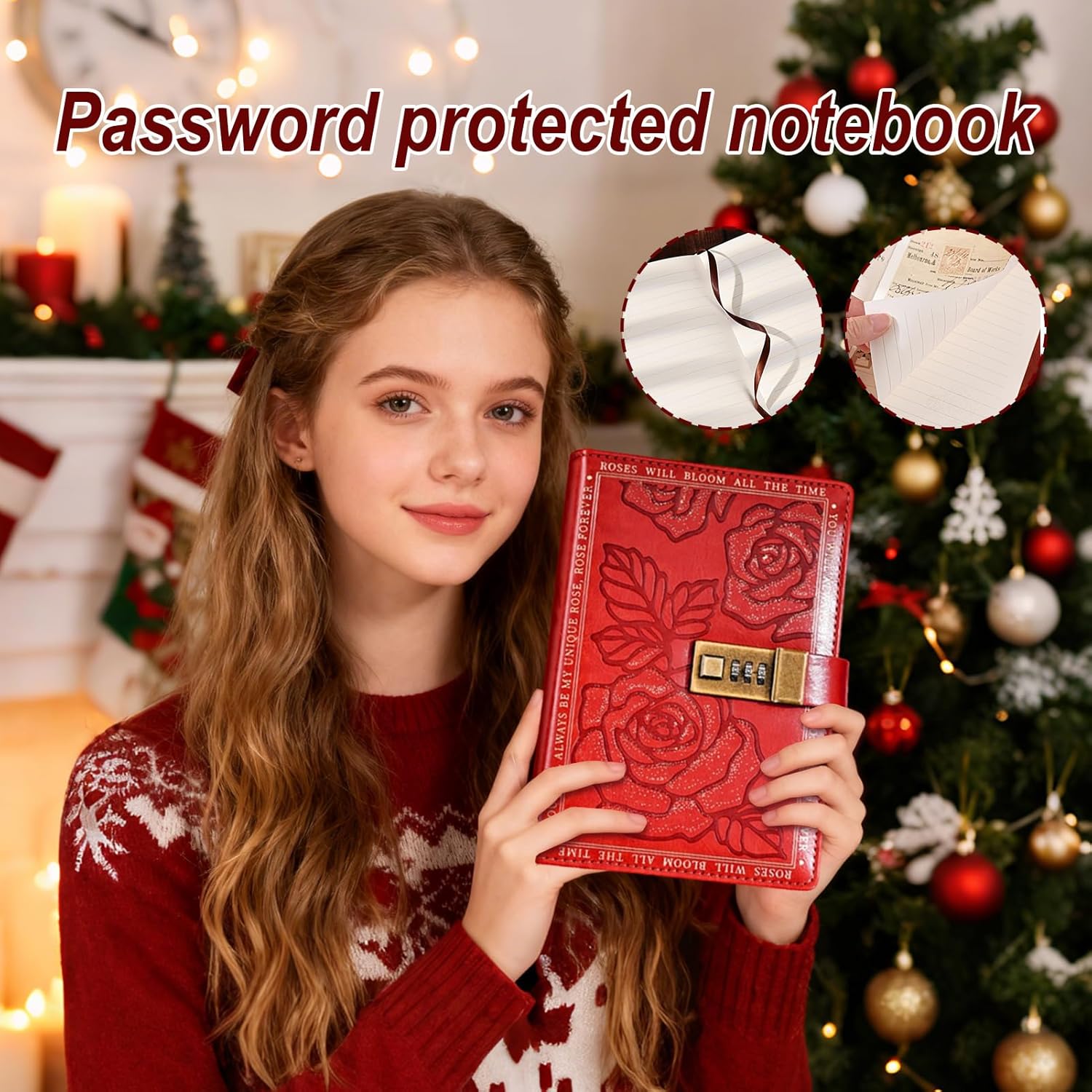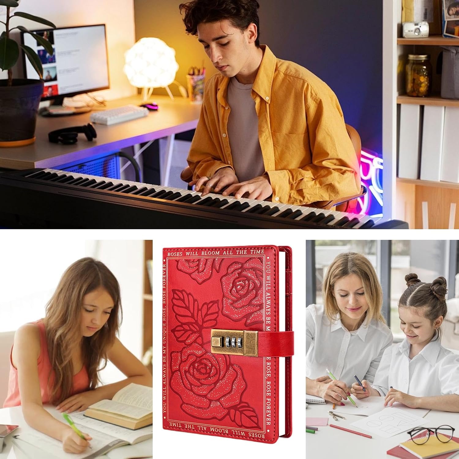 RICORDO IMPRESSIONANTE: questo diario con lucchetto offre uno spazio privato per catturare i pensieri, mentre la combinazione di colori tenui e il classico motivo a rosa aggiungono eleganza. Incoraggia la cura e la celebrazione poiché diventa un ricordo festivo, perfetto per riflessioni personali in occasioni speciali. Protezione della privacy: con un codice numerico a tre cifre, questo diario con serratura garantisce scrittura e pianificazione confidenziali, per un utilizzo tranquillo al lavoro, a scuola o durante i periodi di riflessione personale. Carta robusta: con una superficie di scrittura uniforme e pagine interne spesse che riducono le sbavature. Ti permette di scrivere fluentemente mentre sei in movimento o nei momenti tranquilli a casa. Il diario con lucchetto supporta un'esperienza di journaling ininterrotta. Design retrò: questo diario con serratura combina pelle vintage con goffratura dorata per un look sofisticato e un'archiviazione sicura di pensieri privati, ideale per viaggi o momenti di relax a casa Soluzione di journaling sicura: con 224 pagine a righe, questo diario con serratura ti consente di gestire in modo efficace pensieri e programmi, aumentando la produttività sul lavoro e nello studio e fornendo un'usabilità coerente durante tutto l'anno