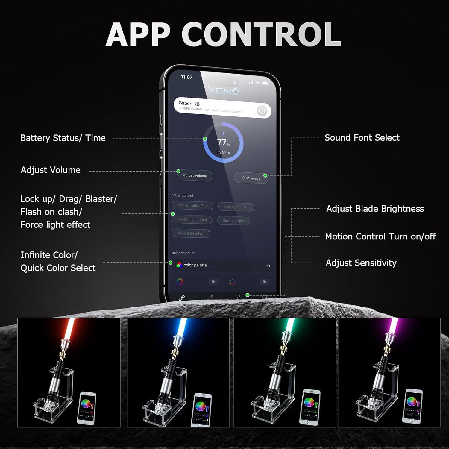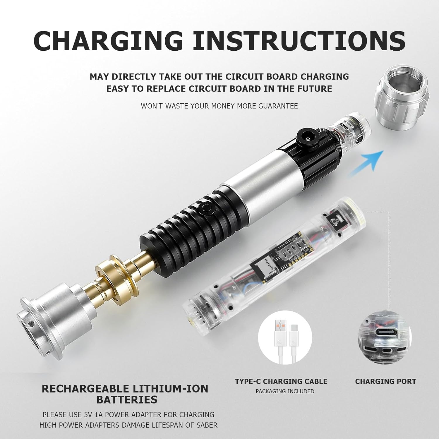 Funzione app di aggiornamento RGB Lightsaber: attraverso il controllo dell'app Stato della batteria/visualizzazione dell'ora, regolazione del volume, selezione di 16 caratteri sonori, blocco/trascinamento/messa a fuoco / forza selezione effetto luce, colore infinito/selezione rapida 16 colori, regolazione della luminosità della lama, controllo del movimento accensione/spegnimento, regolazione della sensibilità, ecc. Effetti sonori ed effetti di luce: 16 effetti di carattere sonoro; 3 effetti di luce (costante, pulsante, instabile); 3 impostazioni di volume (alto, basso, muto). La spada a sciabola luminosa ha un suono reale, super sensibile, più forte e più luminoso. La sciabola da duello RGB combina speciali effetti sonori di combattimento e modalità flash per offrire un'esperienza di combattimento vivida e realistica. Manico in metallo + lama robusta: l'elsa della sciabola leggera è realizzata in alluminio metallico, considera appieno l'effetto gravitazionale della sciabola leggera e la comoda impugnatura, aspetto squisito con speciale design ad anello triangolare appeso. Dotato di lama in PC ad alto impatto e ad alta trasparenza da 92 cm, non facile da piegare o piegare, resistente ai colpi, supporta forti duelli. Batteria ricaricabile integrata da 3000 mAh, la batteria è rimovibile e sostituibile. Componenti facilmente smontabili e sostituiti: design della struttura di fascia alta, qualsiasi componente danneggiato in futuro può essere facilmente smontato e sostituito, garantendo che la spada laser duellante possa essere utilizzata in modo permanente, non sprecherà denaro. (i componenti sono venduti nel nostro negozio) Contenuto della confezione: 1 manico in metallo, 1 lama robusta, 1 cavo di ricarica, 1 manuale utente (lingua italiana non garantita), 1 kit di viti. Forniamo un servizio post-vendita completo, diamo aiuto professionale o guida in tempo. Consigli: si prega di utilizzare l'adattatore 5V1A per la ricarica ogni volta, età consigliata: 14 anni in su.