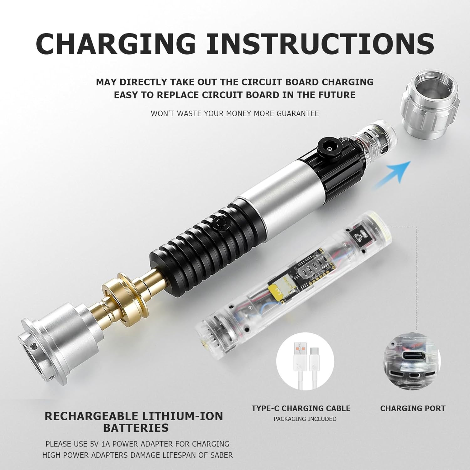 Funzione app di aggiornamento della spada laser pixel: attraverso il controllo dell'app Stato della batteria/visualizzazione dell'ora, regolare il volume, 34 tipi di font audio, blocco / trascinamento / messa a fuoco / forza selezione effetto luce, colore infinito/selezione rapida 16 colori, regolazione della luminosità della lama, controllo del movimento accensione/spegnimento, regolazione della sensibilità, ecc. Effetti sonori ed effetti di luce: 34 effetti di carattere sonoro; 12 effetti di luce; 3 impostazioni di volume (alto, basso, muto). La spada a sciabola luminosa ha un suono reale, super sensibile, più forte e più luminoso. La sciabola da duello Pixel combina speciali effetti sonori di combattimento e modalità flash per offrire un'esperienza di combattimento vivida e realistica. Manico in metallo + lama robusta: l'elsa della sciabola leggera è realizzata in alluminio metallico, considera appieno l'effetto gravitazionale della sciabola leggera e la comoda impugnatura, aspetto squisito con speciale design ad anello triangolare appeso. Dotato di lama in PC ad alto impatto e ad alta trasparenza da 92 cm, non facile da piegare o piegare, resistente ai colpi, supporta forti duelli. Batteria ricaricabile integrata da 3600 mAh, la batteria è rimovibile e sostituibile. Componenti facilmente smontabili e sostituiti: design della struttura di fascia alta, qualsiasi componente danneggiato in futuro può essere facilmente smontato e sostituito, garantendo che la spada laser duellante possa essere utilizzata in modo permanente, non sprecherà denaro. (i componenti sono venduti nel nostro negozio) Contenuto della confezione: 1 manico in metallo, 1 lama robusta, 1 cavo di ricarica, 1 manuale utente (lingua italiana non garantita), 1 kit di viti. Forniamo un servizio post-vendita completo, diamo aiuto professionale o guida in tempo. Consigli: si prega di utilizzare l'adattatore 5V1A per la ricarica ogni volta, età consigliata: 14 anni in su.