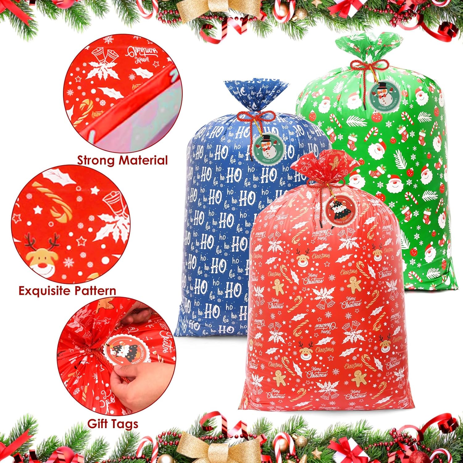 La confezione include: questa confezione contiene un totale di 4/8 sacchetti regalo di Natale extra large con etichette. Le dimensioni della borsa sono 92 x 142 cm. Inoltre viene fornito con cavi da 4/8 pezzi da 60 cm per facilitarti il trasporto dei regali. 【Materiale pratico】 Il nostro sacchetto regalo di Natale è realizzato in materiale di alta qualità, il che è molto pratico. È solido, impermeabile e riutilizzabile. La nostra borsa regalo di Natale è un sostituto perfetto per sacchetti di carta, sacchetti di plastica e cestini. 【Design di alta qualità】Ogni set di sacchetti regalo di Natale ha un design diverso. Il modello della borsa regalo è luminoso e colorato. La nostra borsa regalo di Natale extra large è molto comoda e pratica. Ha ampio spazio ed è comodo da trasportare per soddisfare le esigenze di confezione regalo di Natale e decorazioni per feste. 【Il miglior regalo di Natale】 La nostra borsa di Natale ha una grande capacità, che può essere utilizzata per mettere snack di Natale, coniglietti di bambole e altri regali e creare sacchetti regalo di Natale per i bambini e i tuoi amici. È facile da trasportare. Una borsa natalizia con coulisse è una borsa da regalo ideale. 【Forniture per feste di Natale】 I nostri sacchetti regalo di Natale extra large con etichette sono la scelta migliore per feste di Natale, confezioni regalo di Natale e decorazioni per feste. Può essere utilizzato anche come borsa per la spesa quotidiana e borsa per la conservazione.