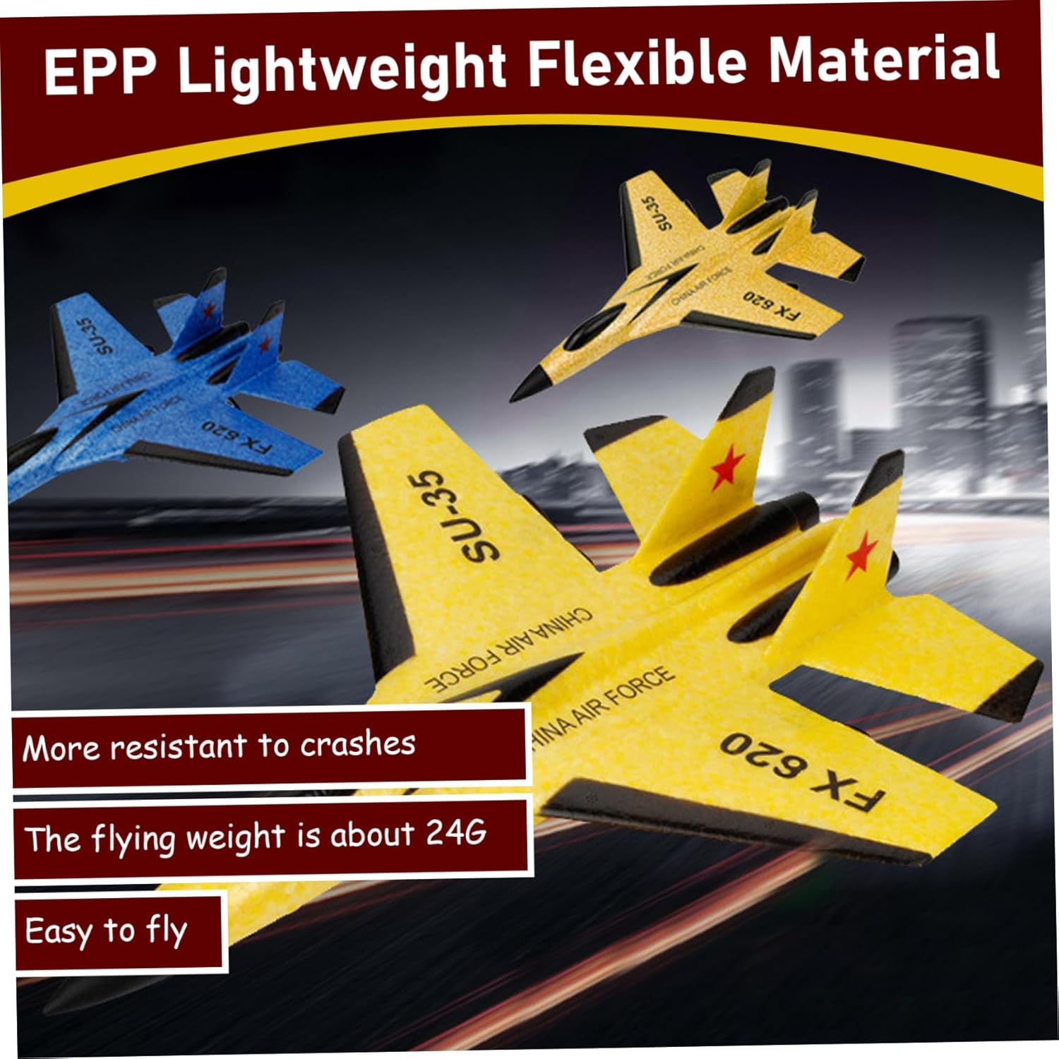 Effetti di illuminazione coinvolgenti: dotato di luci a LED brillanti, il SU-35 non solo migliora la visibilità durante i voli, ma aggiunge anche un tocco estetico divertente, specialmente durante il gioco serale..Goditi un display di luce affascinante mentre si libra attraverso i cieli. Tecnologia di volo stabile: il piano RC SU-35 presenta un giroscopio a 3 assi integrato per l'equilibrio automatico e la stabilizzazione del volo, rendendo facile il controllo di entrambi i principianti e piloti esperti..Goditi un'esperienza di volo regolare senza la preoccupazione di perdere il controllo. Perfetto per tutte le età: questo aereo RC è una scelta eccellente sia per bambini che per adulti..Incoraggia il gioco all'aperto e migliora la coordinazione occhio-mano, rendendolo un regalo perfetto per compleanni, vacanze o qualsiasi occasione speciale. Sistema batteria sostituibile: il telecomando funziona con una frequenza di 2,4 GHz..Alimentato da una batteria al litio da 150 mAh da 3,7 V che è facilmente sostituibile, garantisce tempo di gioco e comodità più lunghi..Il telecomando richiede 2 batterie AA (non incluse), consentendo una configurazione rapida e divertimento ininterrotto. Materiale EPP della durata: realizzato in schiuma EPP di alta qualità, questo aliante di aereo è leggero ma robusto, progettato per resistere agli atterraggi ruvidi e al gioco quotidiano..La sua costruzione di durabilità lo rende una scelta ideale per i voli sia interni che esterni.