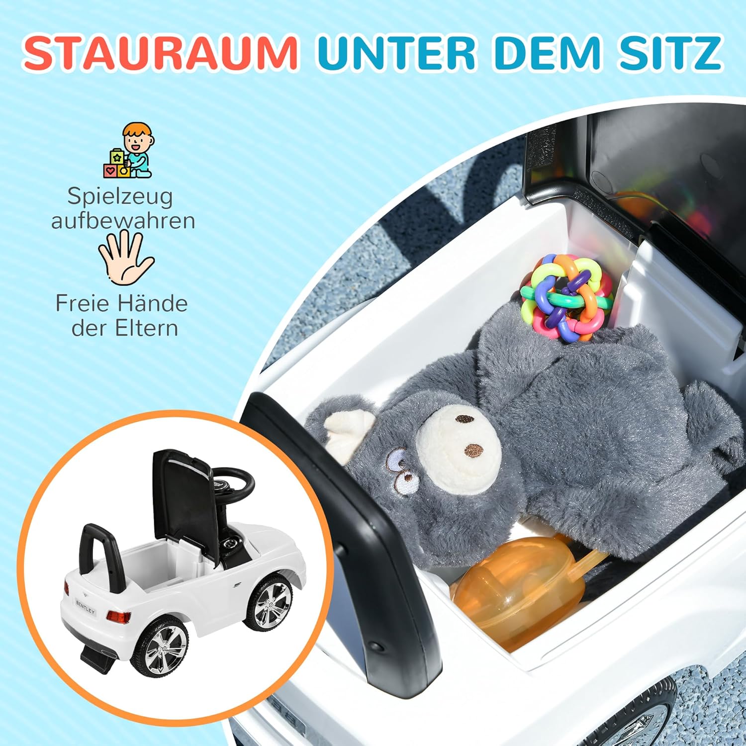 Design ufficiale Bentley: concesso in licenza come Bentley Bentayga, questa macchina da corsa aggiungerà un tocco esclusivo e lussuoso al tempo di gioco del tuo bambino. La sicurezza prima di tutto: grazie alle caratteristiche che impediscono il ribaltamento all'indietro e allo schienale stabile dell'auto da cavalcare, nonché al design vicino al suolo, i bambini possono toccare il suolo con le gambe in sicurezza e spingere il veicolo, il che aumenta la sicurezza dei bambini piccoli. Funzioni interattive: un pulsante del clacson sul volante e funzioni musicali rendono questa macchina per bambini un giocattolo interattivo che non solo è divertente, ma promuove anche la percezione sensoriale. Pratica soluzione di stivaggio: l'auto per bambini offre spazio di stivaggio sotto il sedile, perfetto per tenere pronti giocattoli e snack e darti le mani libere quando sei in movimento. Dimensioni del prodotto dell'auto per bambini: 67 L x 29 L x 39 A cm. Portata: 25 kg, dimensioni seduta: 25L x 23L x 24A (dal pavimento) cm. È richiesto il montaggio. Età adatta: 18-36 mesi.