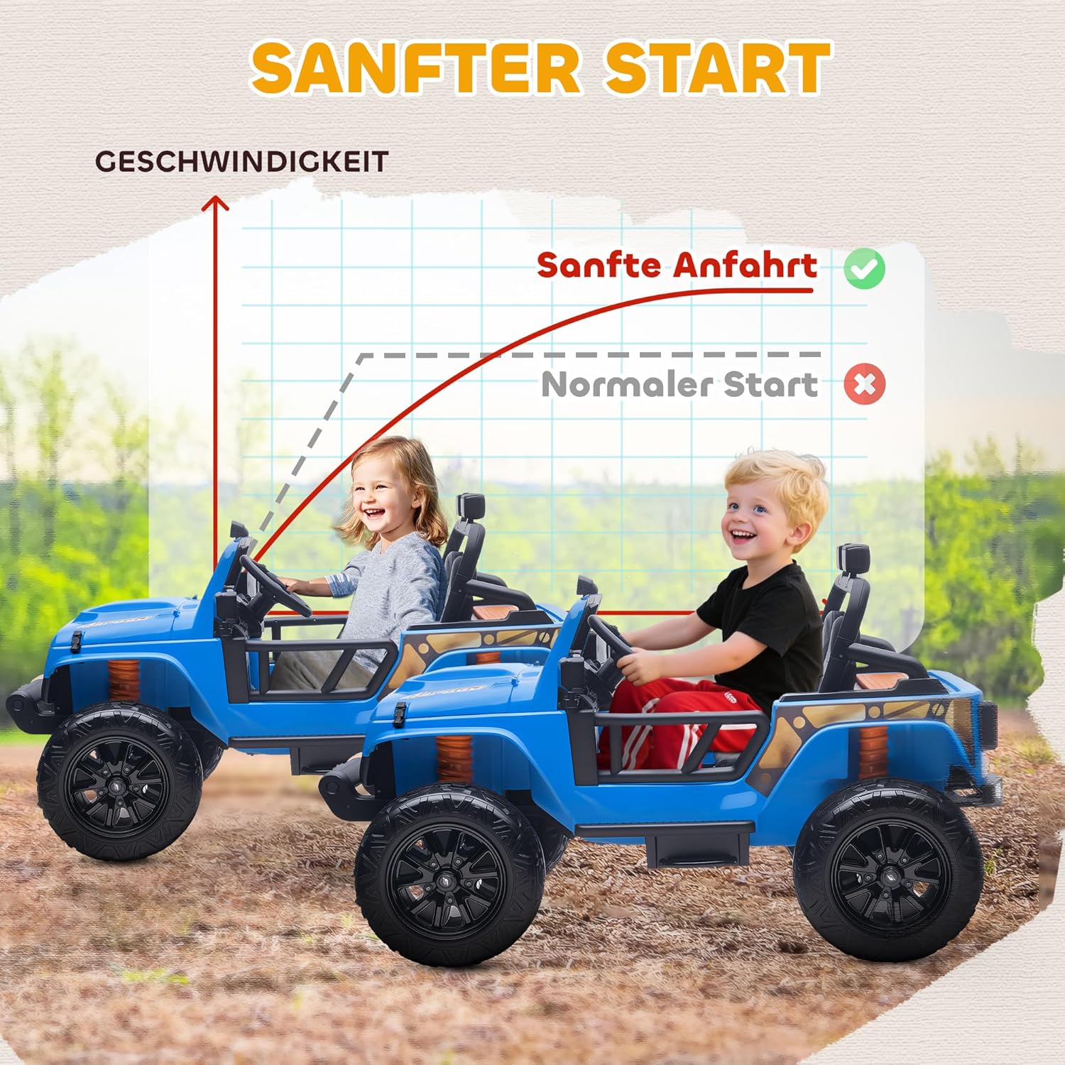 Guida potente: dotata di potenti doppi motori, questa auto elettrica per bambini raggiunge tre velocità regolabili da 3 a 8 km/h. La batteria da 12 V 7 Ah garantisce più di un'ora di divertimento quando è completamente carica. Per bambini e genitori: l'auto elettrica per bambini trasporta fino a 100 kg e offre un sedile posteriore per i genitori con poggiapiedi per maggiore sicurezza e preziosi momenti insieme. Sotto il sedile c'è uno scomparto per gli utensili importanti Doppio controllo e sicurezza: mentre i bambini guidano autonomamente la loro auto elettrica, i genitori possono intervenire utilizzando il telecomando 2.4G, che offre ulteriore sicurezza Pronto per avventure sicure: Dotata di tecnologia di avviamento dolce e cintura di sicurezza, l'auto per bambini garantisce una guida tranquilla e sicura. I doppi motori e le sospensioni indipendenti affrontano anche i prati e garantiscono una piacevole ammortizzazione. Grande divertimento di guida: con la semplice pressione di un pulsante sull'auto elettrica per bambini, rumori realistici del motore, luci a LED e avvio della musica tramite USB o FM rendono ogni viaggio un'esperienza emozionante