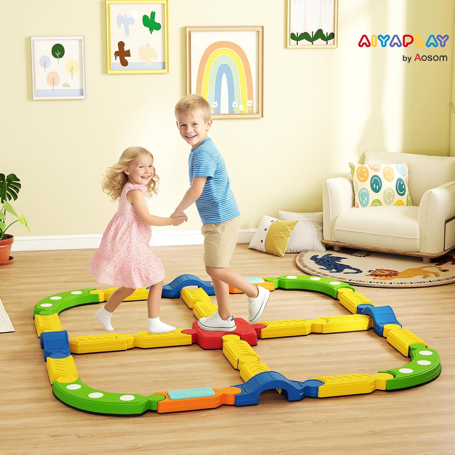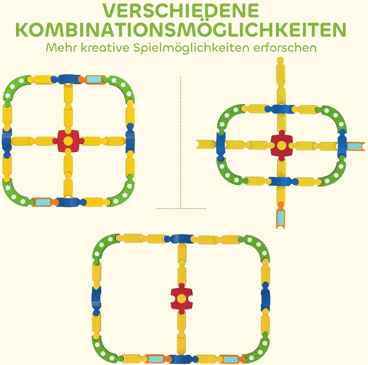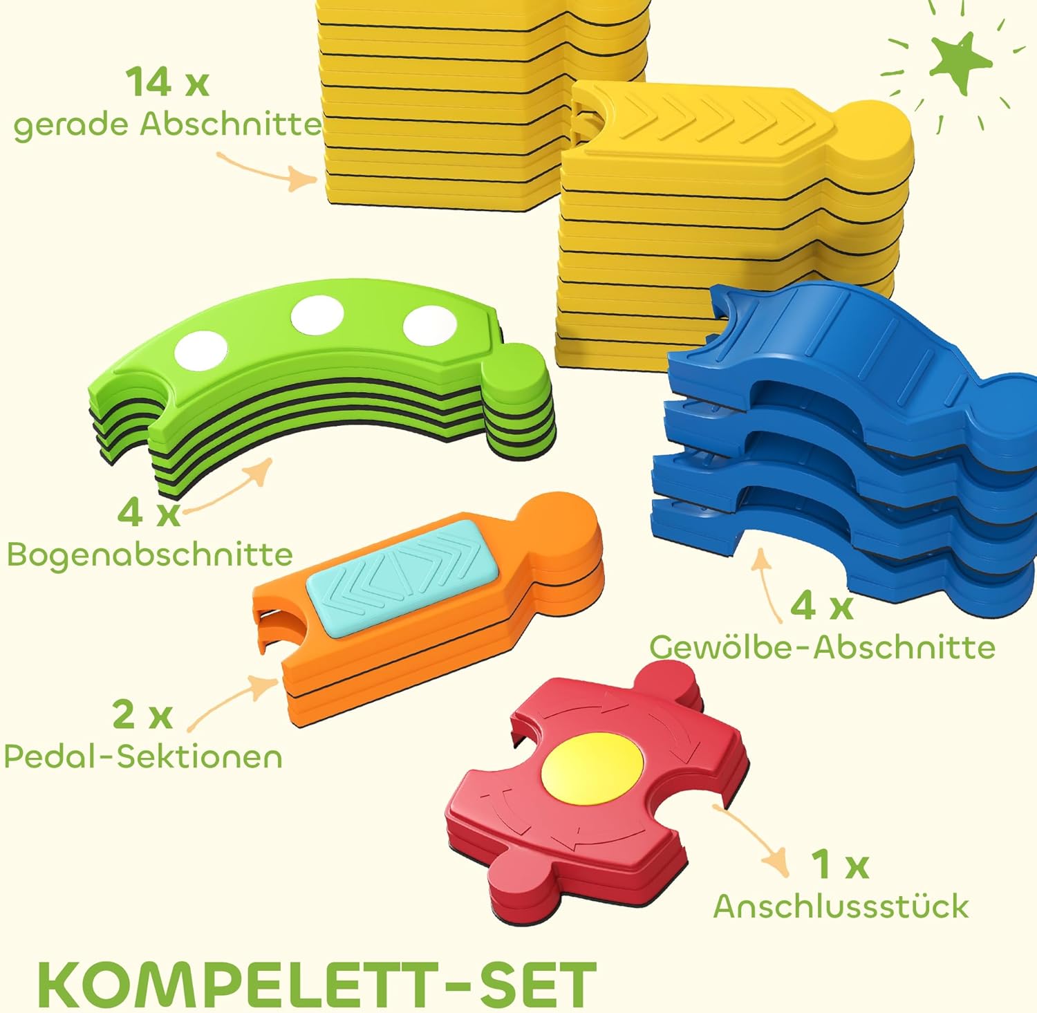 Balance und sensorische Entwicklung: Der Kinder-Balancebalken fördert die Koordination und die motorischen Fähigkeiten durch weiche Punkte im gekrümmten Teil und ein berührungsempfindliches Pedal für aktive Übungen, die sowohl den Körper als auch den Geist stimulieren. Unendliches kreatives Spiel: Mit 25 Elementen, darunter Geraden, Bögen, Gewölbe, Pedale und Verbindungsstücke, können Kinder die Balancebalken leicht montieren und in zahlreichen Varianten immer wieder neu zusammenstellen. Dies regt die Fantasie an und schult die Problemlösungskompetenz. Sicher und stabil: Ausgestattet mit rutschfesten Pads unten und einer strukturierten Oberfläche oben, bietet der Balancebalken eine verbesserte Stabilität. Mit einer Tragkraft von 50 kg sorgt er für zuverlässige Unterstützung und eine sichere Nutzungserfahrung für Kinder. Tragbar und platzsparend: Der Balancebalken ist für eine einfache Stapelung und kompakte Lagerung ausgelegt, ideal für den Einsatz drinnen und draußen. Einfach aufzubauen und schnell verstaut, ist er sowohl im Wohnzimmer als auch im Freien einsetzbar. Produktinformationen: Gesamtabmessungen: 176L x 176B x 10,5H cm (quadratisch). Maximale Belastung: 50 kg. Empfohlenes Alter: 3-8 Jahre.