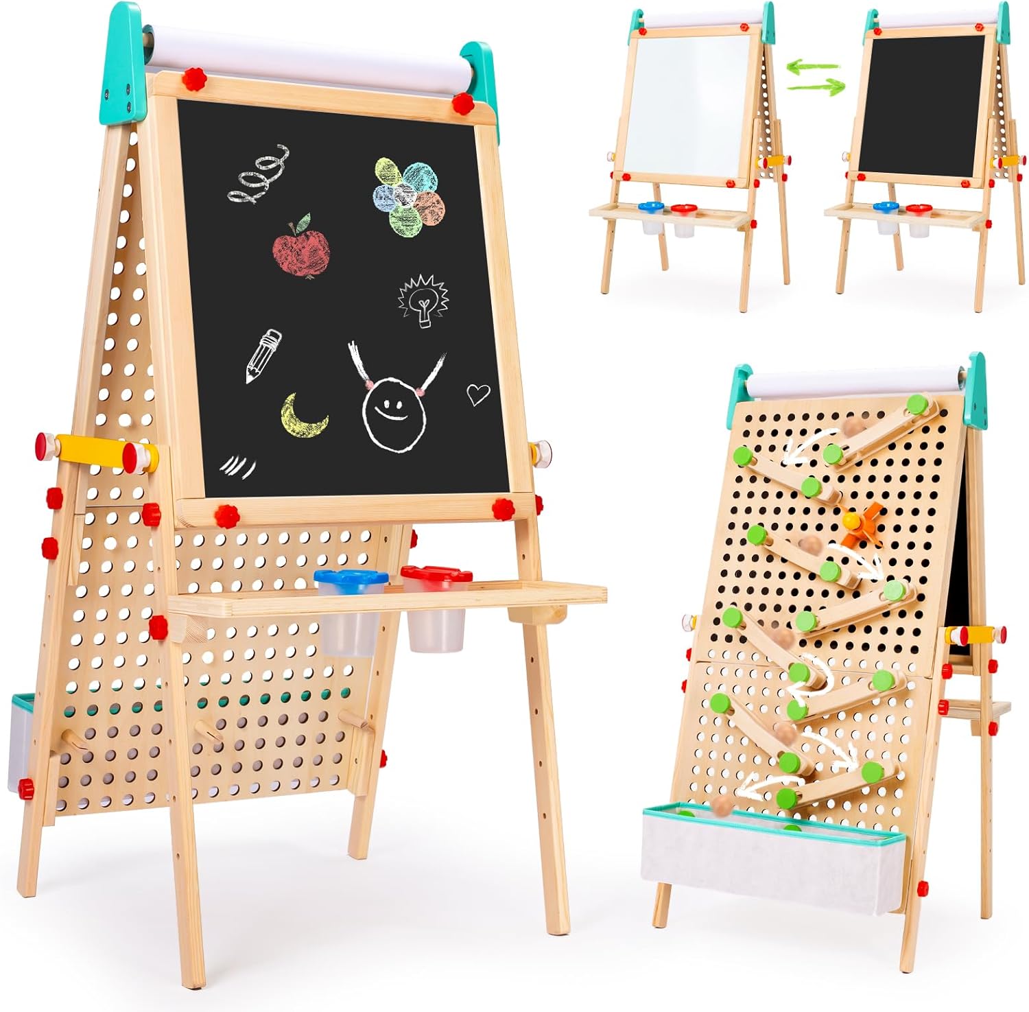 DESIGN 3 IN 1: Il lato della lavagna nera per bambini permette di disegnare con i gessetti, mentre il lato della lavagna bianca è ideale per i pennarelli a base d'acqua. E se lo spazio per disegnare non basta, puoi inserire anche un rotolo di carta. Il cavalletto artistico può essere usato contemporaneamente da due bambini, ed è ideale per i piccoli artisti da 3 a 8 anni 2 CONTENITORI: I due cestini sotto la lavagna per bambini offrono spazio per riporre gessetti, pennarelli e tutti gli indispensabili per disegnare DECORAZIONI CON ANIMALI: La lavagna con cavalletto è realizzata con simpatiche decorazioni colorate, che aggiungono un tocco di originalità a ogni spazio FACILE DA MONTARE E SOLIDO: Dotato di istruzioni facili da consultare, il cavalletto da pittore si monta in poco tempo. Con la sua struttura ad A garantisce una stabilità ottimale e un uso in totale sicurezza da parte dei bambini DIMENSIONI: Dimensioni generali: 54L x 46.5P x 93A cm. Dimensioni lavagna: 47L x 38P cm. Dimensioni di ogni contenitore: 27L x 24P x 14.5A cm