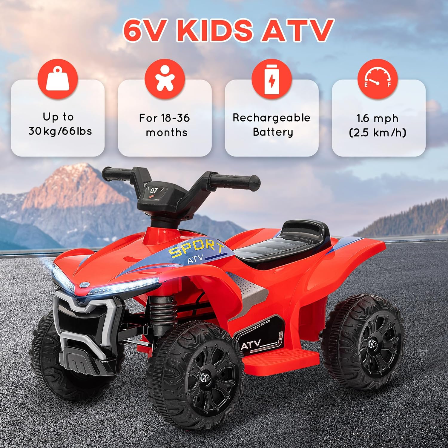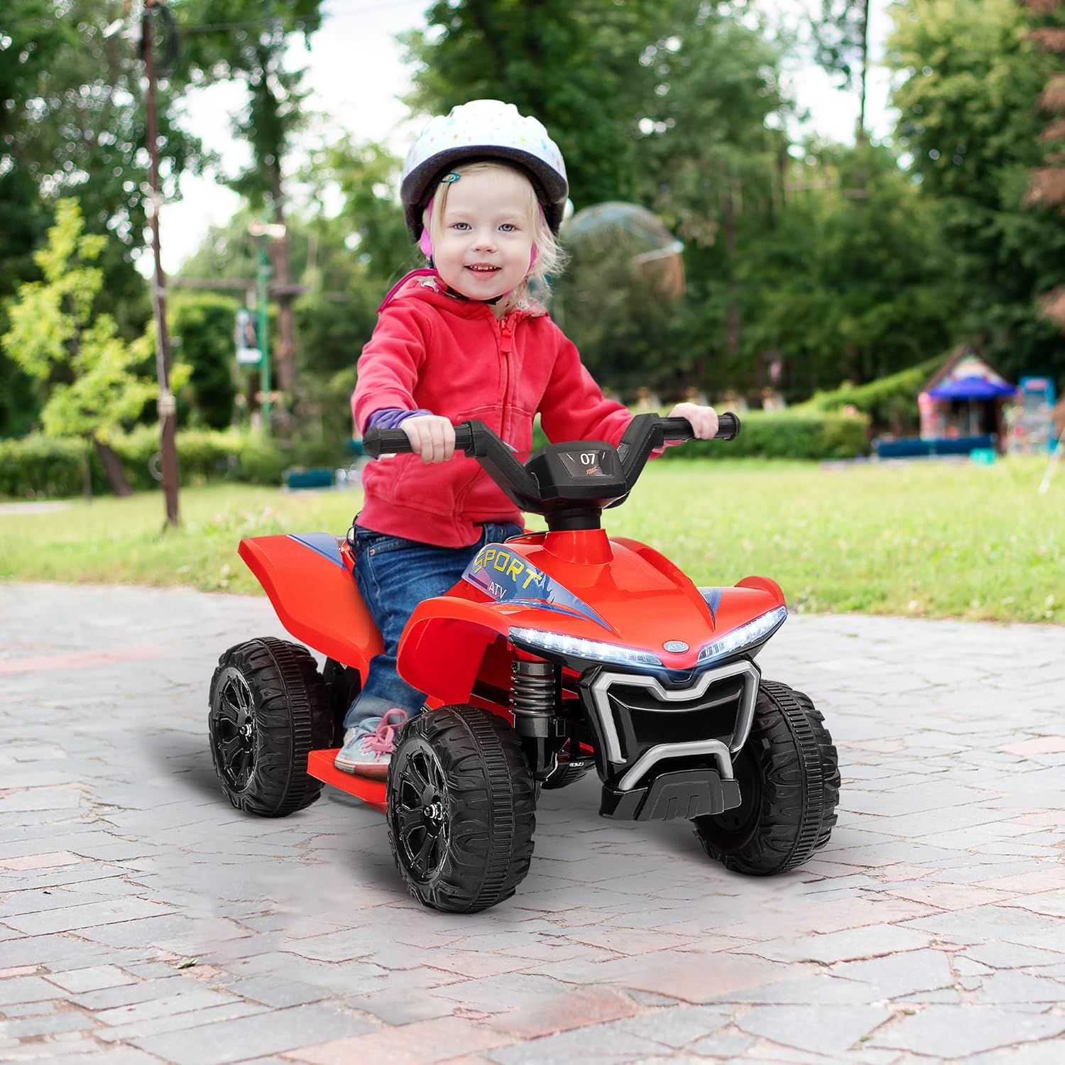 VELOCITÀ SICURA E DIVERTENTE: Dai ai tuoi bambini il loro primo quad elettrico, progettato per una velocità sicura di 2,5 km/h, ideale per bambini dai 18 ai 36 mesi che desiderano esplorare in modo sicuro CARATTERISTICHE REALISTE: Con il suo faro luminoso e una funzione musicale, questo quad arricchisce l'esperienza di guida e risveglia l'immaginazione dei bambini durante i momenti di gioco AVVENTURA SENZA FIN: dotato di una batteria ricaricabile da 6 V, che permette di divertirsi continuamente per 60 minuti dopo una carica completa, ideale per mantenere i giovani conducenti impegnati Prestazioni versatili: questo quad elettrico per bambini, efficace su asfalto, ciottoli o cemento, garantisce un'esperienza divertente sia all'interno che all'esterno INFORMAZIONI DEL QUAD ELETTRICO PER BAMBINI: Dimensioni totali: 71 L x 40,5 L x 45 H cm; - Carico max. Consigliato: 30 kg; - Standard di sicurezza: EN71-1-2-3, EN62115; - Montaggio necessario