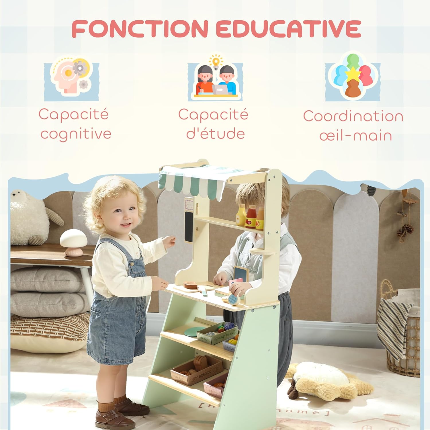 EXPÉRIENCE DE SUPERMARCHÉ IMMERSIVE : Comprend 34 accessoires tels qu'une caisse enregistreuse de jeu, un tableau noir et de faux aliments, cet ensemble marchande pour enfant encourage les jeunes commerçants à simuler des scénarios réels, stimulant ainsi leur créativité pour des aventures infinies dans un supermarché imaginaire. AMUSEMENT À COUPER ET TRIER LES ALIMENTS : Permettant aux enfants de découper sans risque fruits, légumes et viandes, puis de les ranger dans des bacs, cet ensemble de supermarché pour enfant cultive la motricité fine et la coordination œil-main grâce au jeu de rôle. EXPÉRIENCE DE CAISSE INTERACTIVE : Incluant une caisse enregistreuse et un scanner réalistes ainsi qu'une carte pour initier aux mathématiques simples, cet ensemble encourage le partage, l'alternance des rôles et le jeu de rôle enrichissant lors de dynamiques. RANGEMENT GÉNÉREUX POUR UNE ORGANISATION FACILE : Avec quatre bacs de rangement, deux grands compartiments et des étagères supérieures ouvertes, cet espace permet aux enfants d'exposer, d'organiser et de maintenir en ordre tous les accessoires de jeu, contribuant à un espace de jeu ordonné et sans désordre. CONÇU POUR LA SÉCURITÉ : Réalisé en MDF avec des angles doux et arrondis, ce magasin de jeu fictif offre aux enfants un environnement sûr pour explorer tout en rassurant les parents sur leur sécurité.