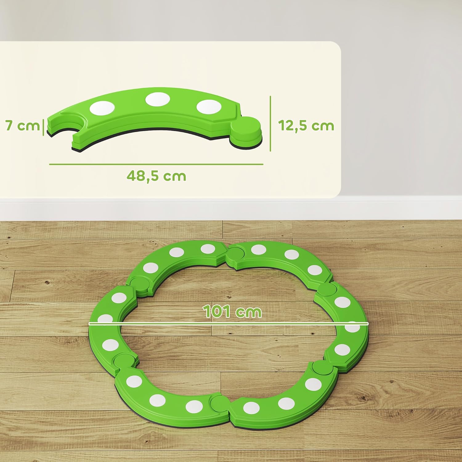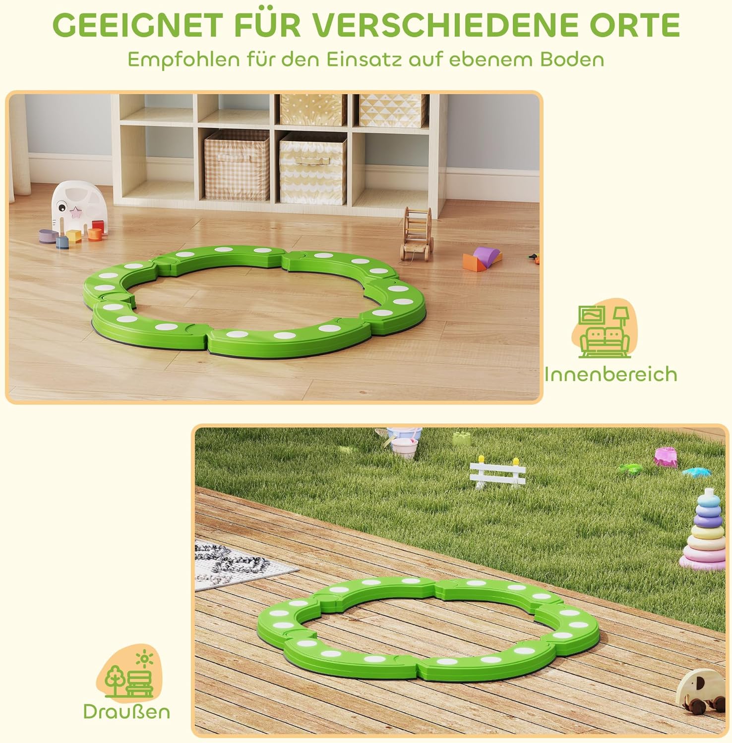 Kreative Kombinationen: Stellen Sie die sechs geschwungenen Elemente des Sets zu Blumenformen oder anderen kreativen Mustern zusammen und wecken Sie so die grenzenlose Fantasie Ihrer Kinder mit diesem Balancierbalken. Sensorischer Spaß: Jedes Element des Balancierbalkens ist mit drei tastbaren Punkten ausgestattet, die beim Betreten gedrückt werden können, was das Spielen zuhause interaktiv und spannend gestaltet. Robust und sicher: Dieses Set eines Kinder-Balancierbalkens bietet stabilen Halt für erste Bewegungsabläufe und ermöglicht Eltern, ihren Kindern mit Vertrauen beim freien und fröhlichen Bewegen zuzusehen. Spiel im Innen- und Außenbereich: Aus langlebigem TPE und Kunststoff gefertigt, widersteht dieser Balancierbalken problemlos aktiven Spielstunden, egal ob an regnerischen Tagen oder sonnigen Nachmittagen, drinnen oder draußen. Produktdimensionen: Ø101 x 7H cm. Maximale Belastung: 50 kg. Empfohlenes Alter: 3-8 Jahre. Zugelassenes Alter: 3+ Jahre. Montage erforderlich.