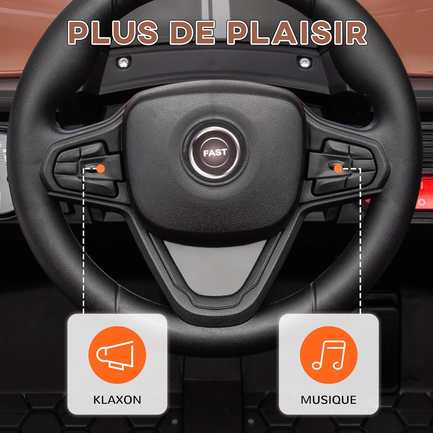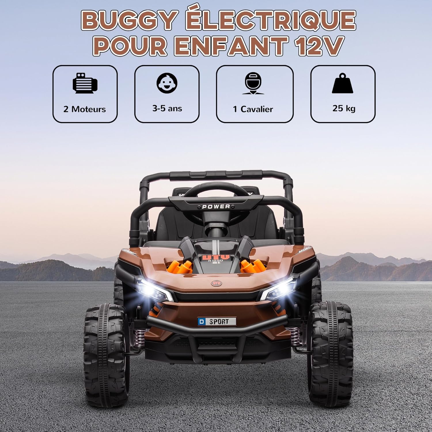 DOUBLE MOTEUR PUISSANT : Équipé de deux moteurs robustes, ce véhicule électrique 12V pour enfants assure jusqu'à 50 minutes de jeu continu, offrant un amusement sans fin pour votre jeune pilote CONDUITE FLUIDE : Doté de quatre roues et d'une suspension efficace, ce véhicule pour enfants garantit une conduite souple sur une variété de surfaces, telles que l'herbe, le béton, l'asphalte, la brique et les chemins de gravier VITESSES AJUSTABLES : Offrant trois vitesses ajustables jusqu'à 6 km/h et contrôlable par télécommande, les enfants peuvent conduire ce buggy par eux-mêmes ou sous la surveillance sécurisée d'un adulte INTERACTIVITÉ ENRICHISSANTE : Avec des fonctionnalités telles qu'une musique entraînante, un klaxon et des bandes lumineuses, cette voiture pour enfants pour les tout-petits stimule l'amusement et l'engagement des enfants lors de chaque trajet SPÉCIFICATIONS : Dimensions totales : 103L x 69l x 59H cm ; - Charge max. recommandée : 25 kg ; - Montage nécessaire ; - Convient aux enfants de plus de 3 ans, idéal pour les 3 à 5 ans