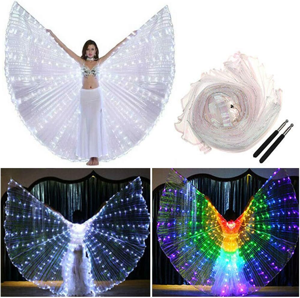 Puntelli per prestazioni: l'ala a forma di mantello ti fa sembrare una farfalla, ti consente di essere una stella più accattivante sul palco. LED incandescente: con molte perline LED che hanno un'elevata luminosità e possono illuminare l'intera area di prestazioni. Sicuro da usare: ottimo filo di rame, più conduttivo, trattamento anti-rottura. Sicuro e stabile da usare, protegge il corpo. Con bastone: l'ala viene fornita con un paio di bastoncini telescopici portatili. Applicazione: perfetto per spettacoli di danza del ventre, rave, palcoscenico, feste di Halloween, abiti di Natale, bar, ecc.