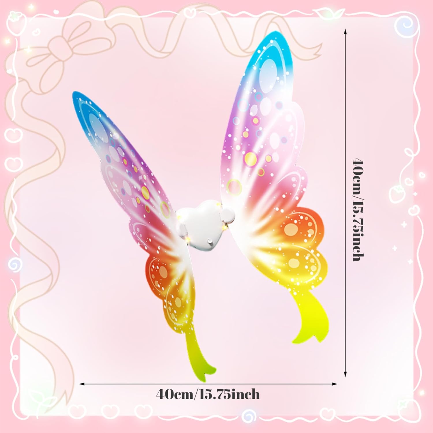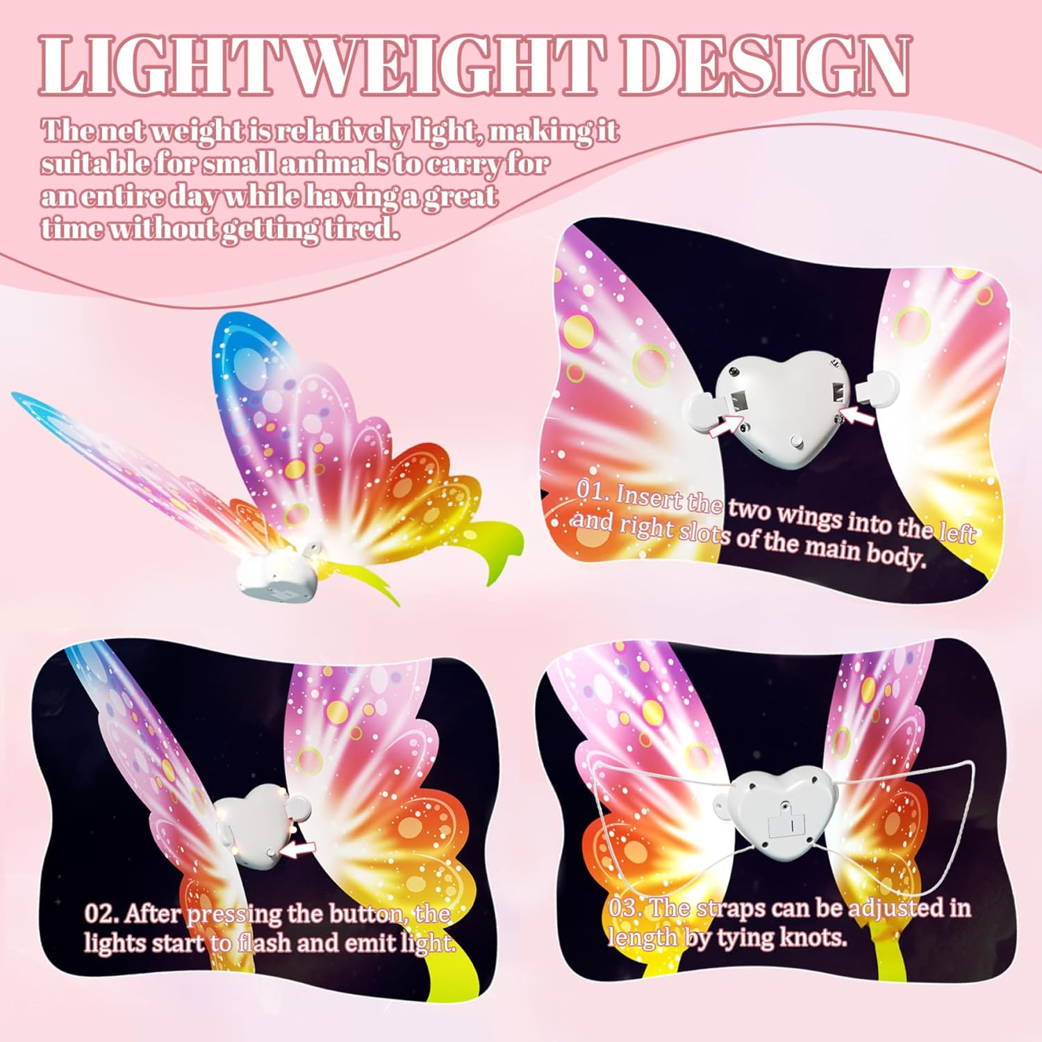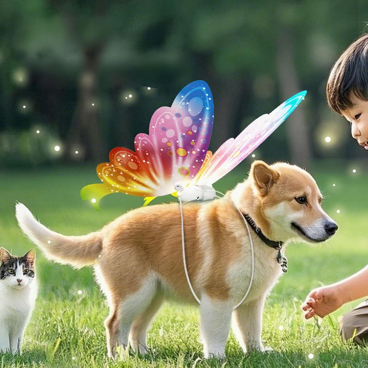 Perfette per tutte le occasioni: che tratti di Halloween, una festa in costume, passeggiate serali o servizi fotografici, queste di farfalla luminose a LED sono un accessorio versatile per costumi per cani che aggiunge un tocco magico a qualsiasi evento, rendendo il tuo amico peloso la star dello spettacolo. Accattivante effetto luminoso: l'ala di farfalla luminosa indefinita è dotata di vivaci luci a LED che creano un'illuminazione incantevole e accattivante, perfetta per far risaltare il tuo cane durante eventi serali o feste..L'illuminazione dinamica abbinata a un design leggero garantisce il massimo comfort e appeal visivo. Design che privilegia il comfort: realizzate con materiali ultraleggeri, le offrono una vestibilità comoda per cani di varie dimensioni senza limitare i movimenti, garantendo che il tuo animale domestico possa indossarle per periodi prolungati senza disagio. Materiali stabili e sicuri: queste luminose di farfalla sono progettate con componenti non tossici e sicuri per gli animali domestici e una struttura robusta, garantendo longevità e sicurezza durante il gioco, le passeggiate o le feste di Halloween. Sincronizzazione musicale interattiva: dotate di sensori musicali integrati, queste luminose muovono e lampeggiano in armonia con il suono o la musica circostante, offrendo un'esperienza divertente e interattiva che delizia sia gli animali domestici che i proprietari.