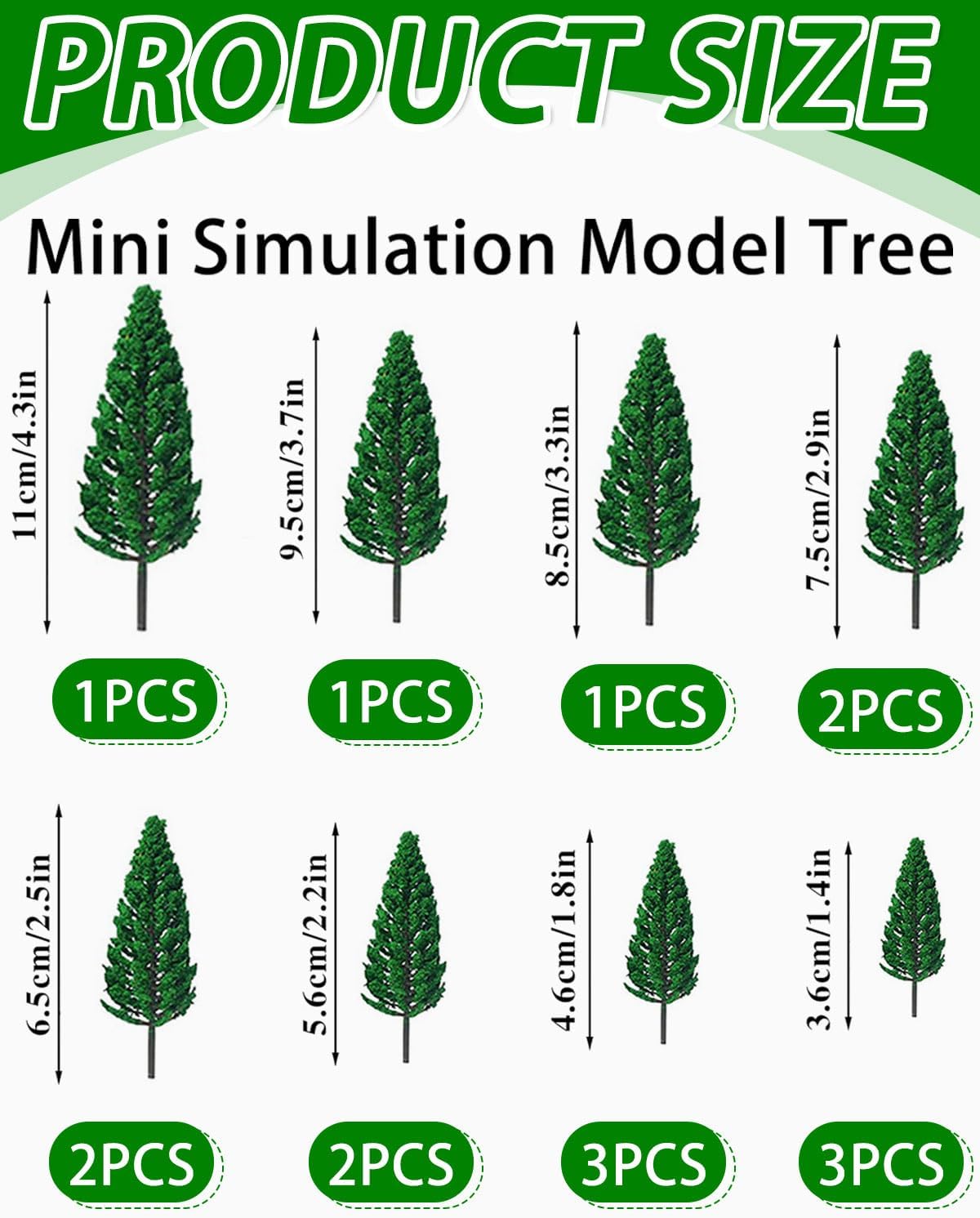 Contenuto della confezione: questo set include 15 mini pini di diverse dimensioni:2 x 1,4 pollici, 2 x 1,8 pollici, 2 x 2,2 pollici, 2 x 2,5 pollici, 2 x 2,9 pollici, 1 x 3,3 pollici, 1 x 3,7 pollici, 1 x 4,3 pollici, 1 x 5,1 pollici, 1 x 5,9 pollici.Questi mini pini di diverse dimensioni sono perfetti per le vostre decorazioni fai da te. Materiale di alta qualità: queste spille sono realizzate in plastica di alta qualità, resistente all'umidità, allo sbiadimento, robusta e durevole. Design realistico: l'albero modello presenta dettagli realistici, una lavorazione artigianale e un colore verde naturale che lo rendono perfetto per abbellire il tuo paesaggio in miniatura. Facile da indossare: questi mini alberi paesaggistici sono leggermente appuntiti e possono essere facilmente inseriti nell'erba o nella sabbia per creare facilmente un paesaggio naturale. Multiuso: questi modelli di palme sono perfetti per decorare torte a forma di dinosauro o cupcake, nonché per creare paesaggi naturali fai da te in bottiglia, giardini fiabeschi, modelli tridimensionali, modelli di edifici, modelli di sabbia, scene di treni e scene di spiaggia.